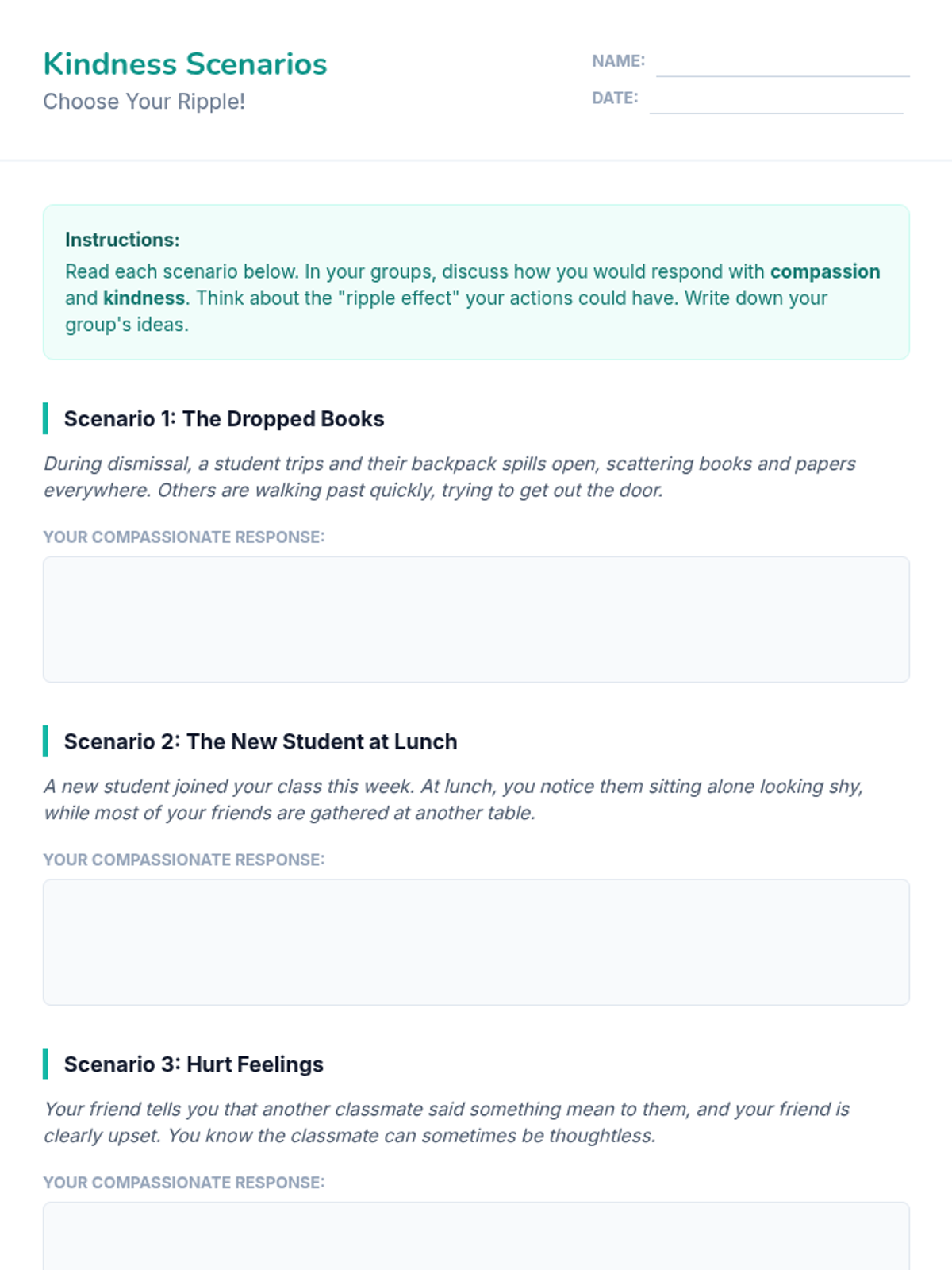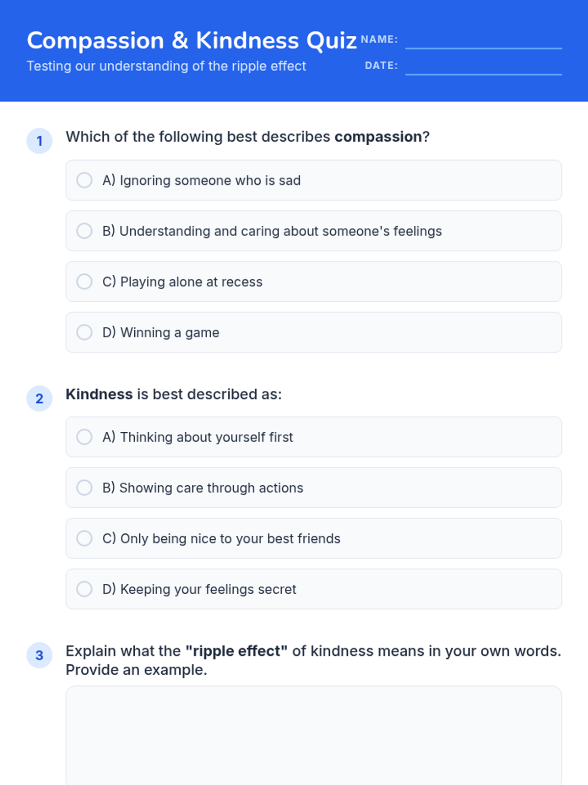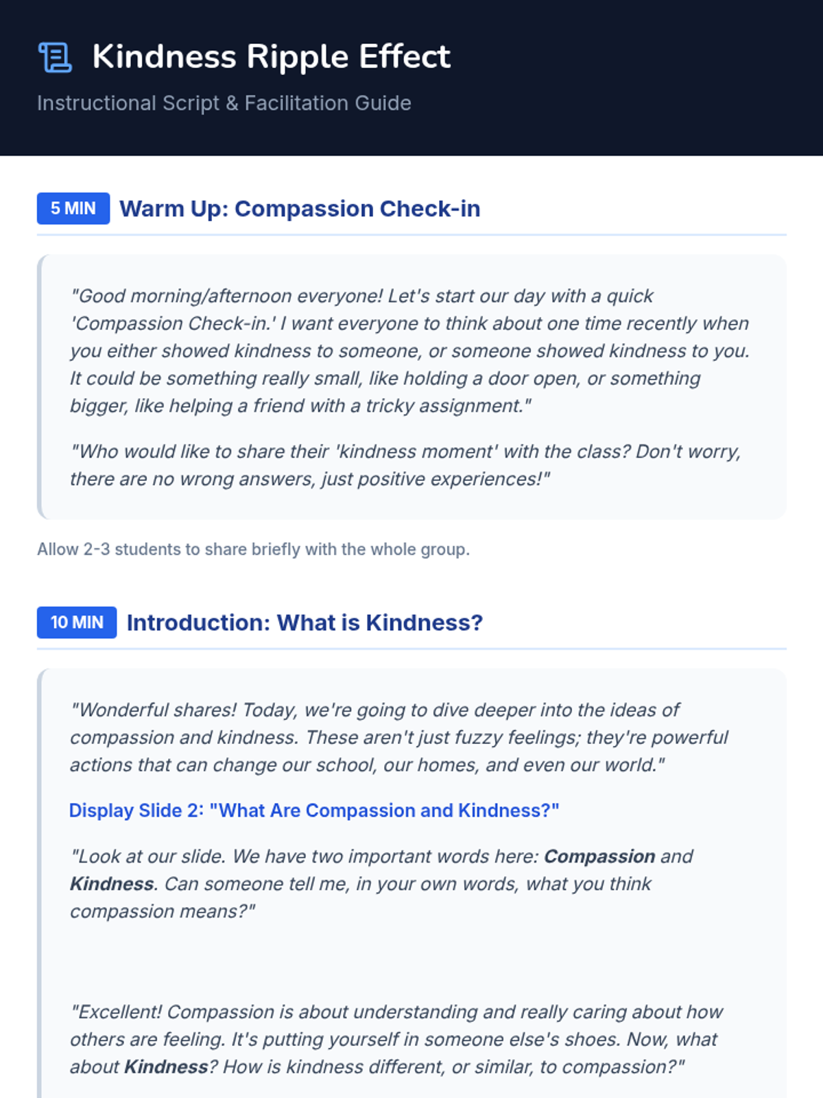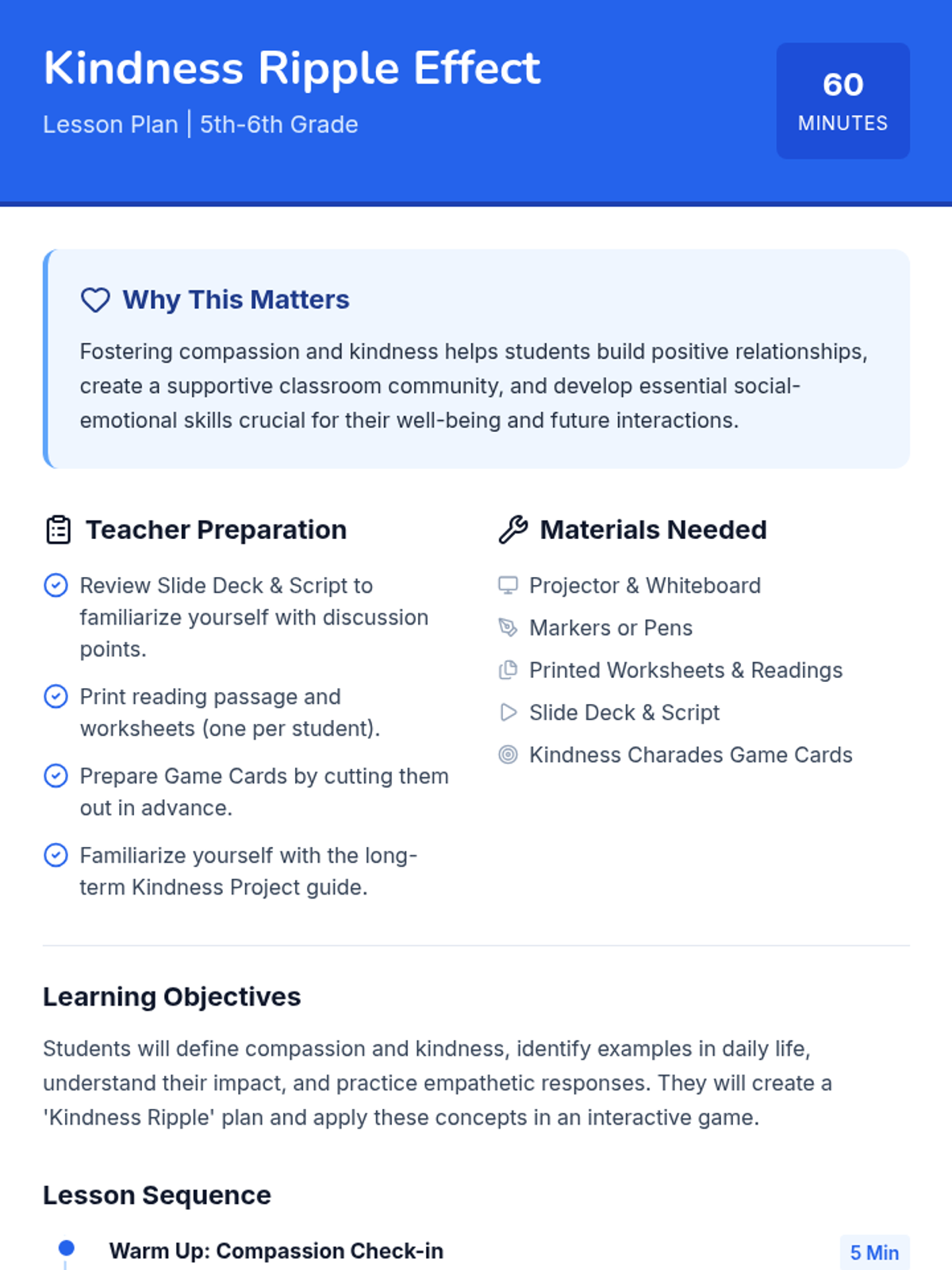 A 60-minute lesson for 5th-6th grade students that explores the concepts of compassion and kindness through interactive discussion, video analysis, and scenario-based practice. Students will learn how small acts of kindness create a 'ripple effect' that transforms their community.