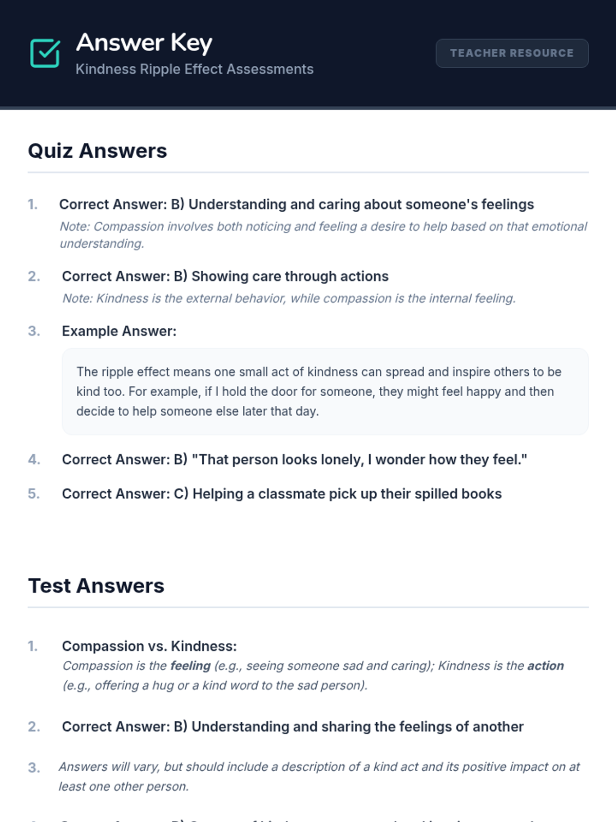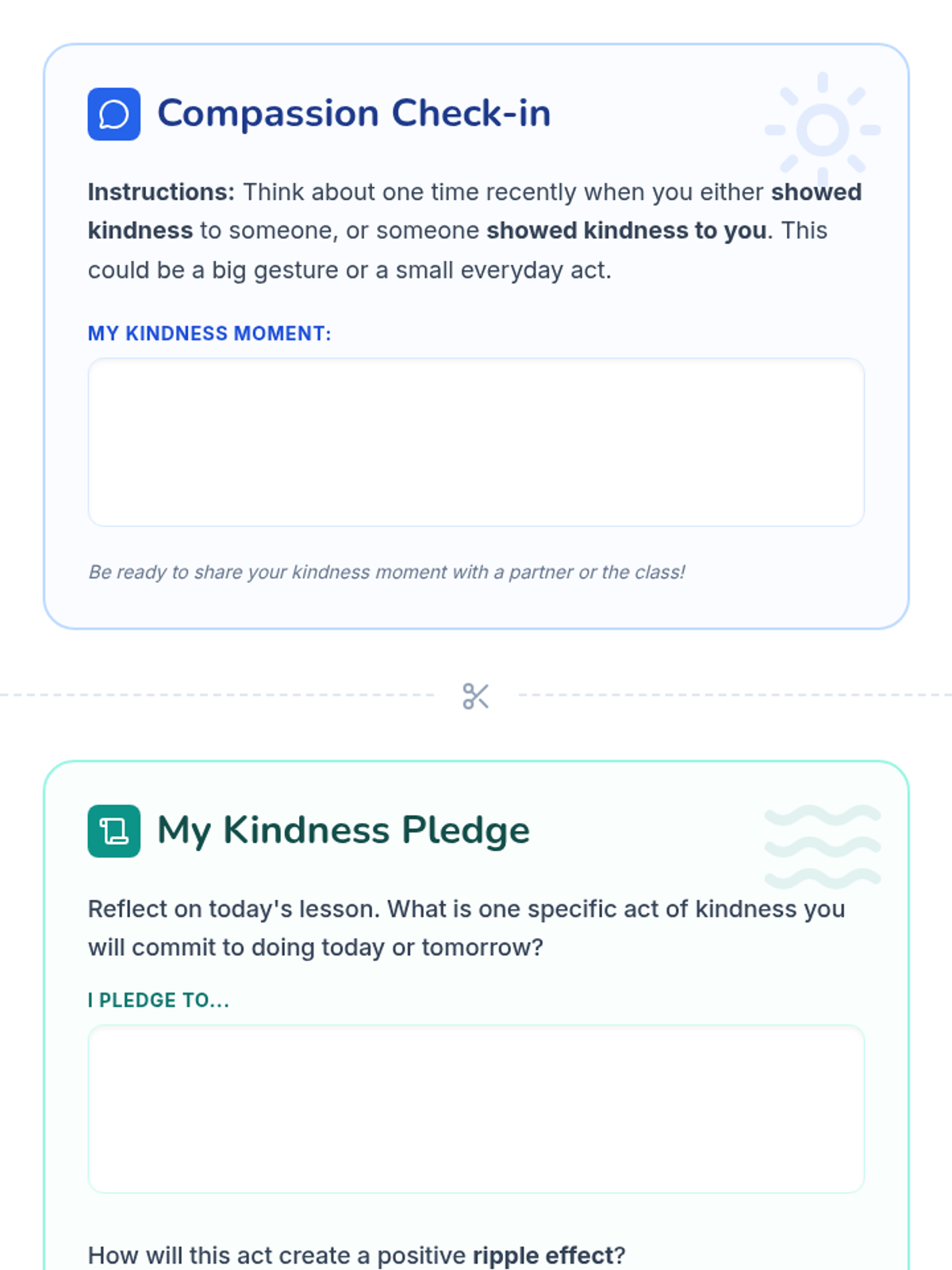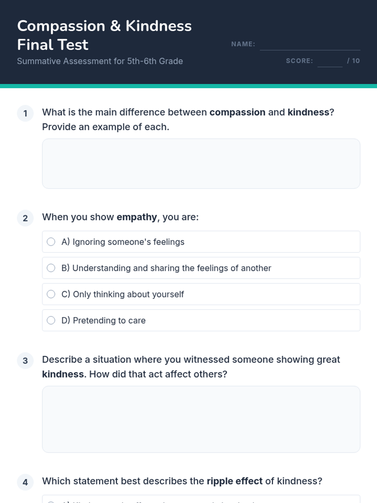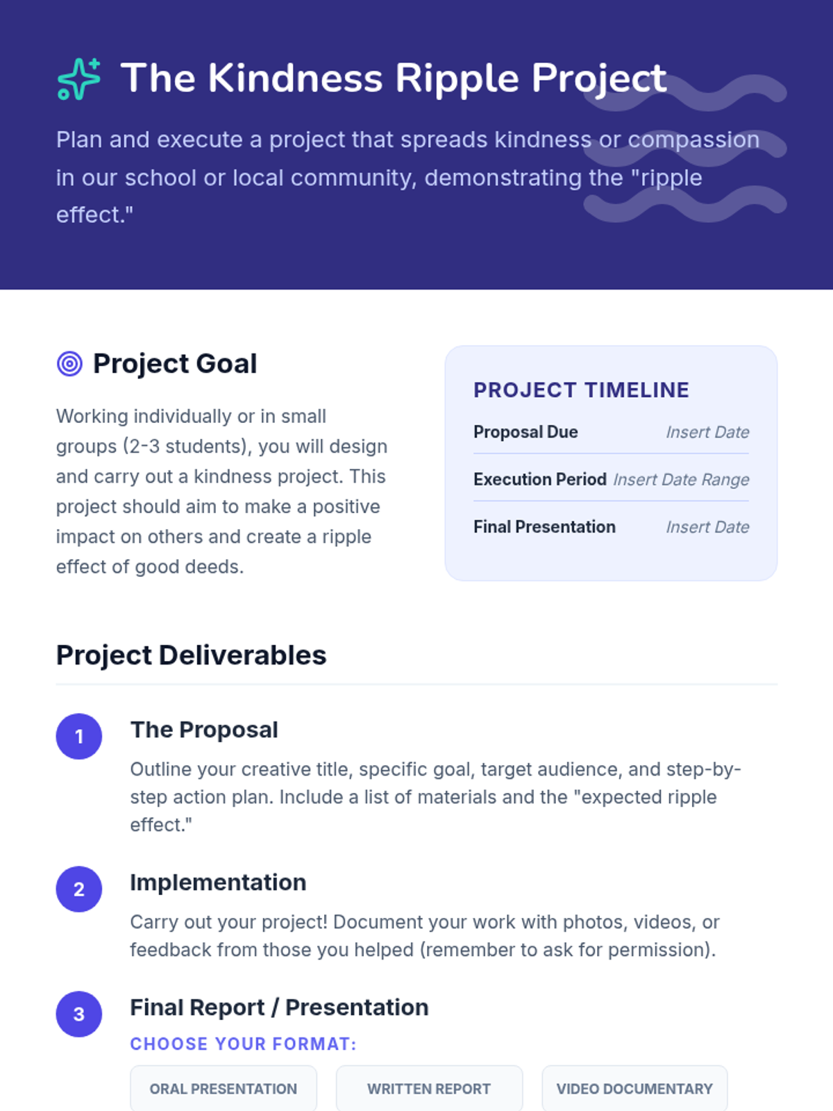 A 60-minute lesson for 5th-6th grade students that explores the concepts of compassion and kindness through interactive discussion, video analysis, and scenario-based practice. Students will learn how small acts of kindness create a 'ripple effect' that transforms their community.