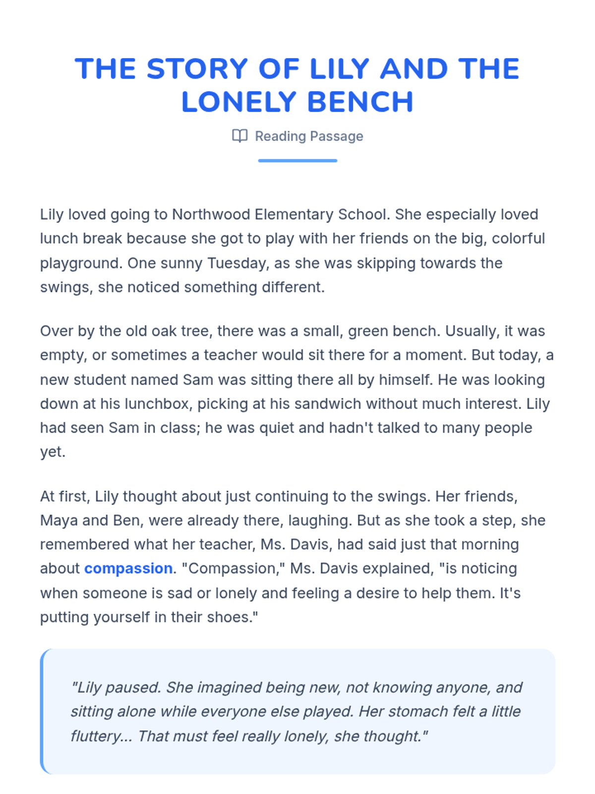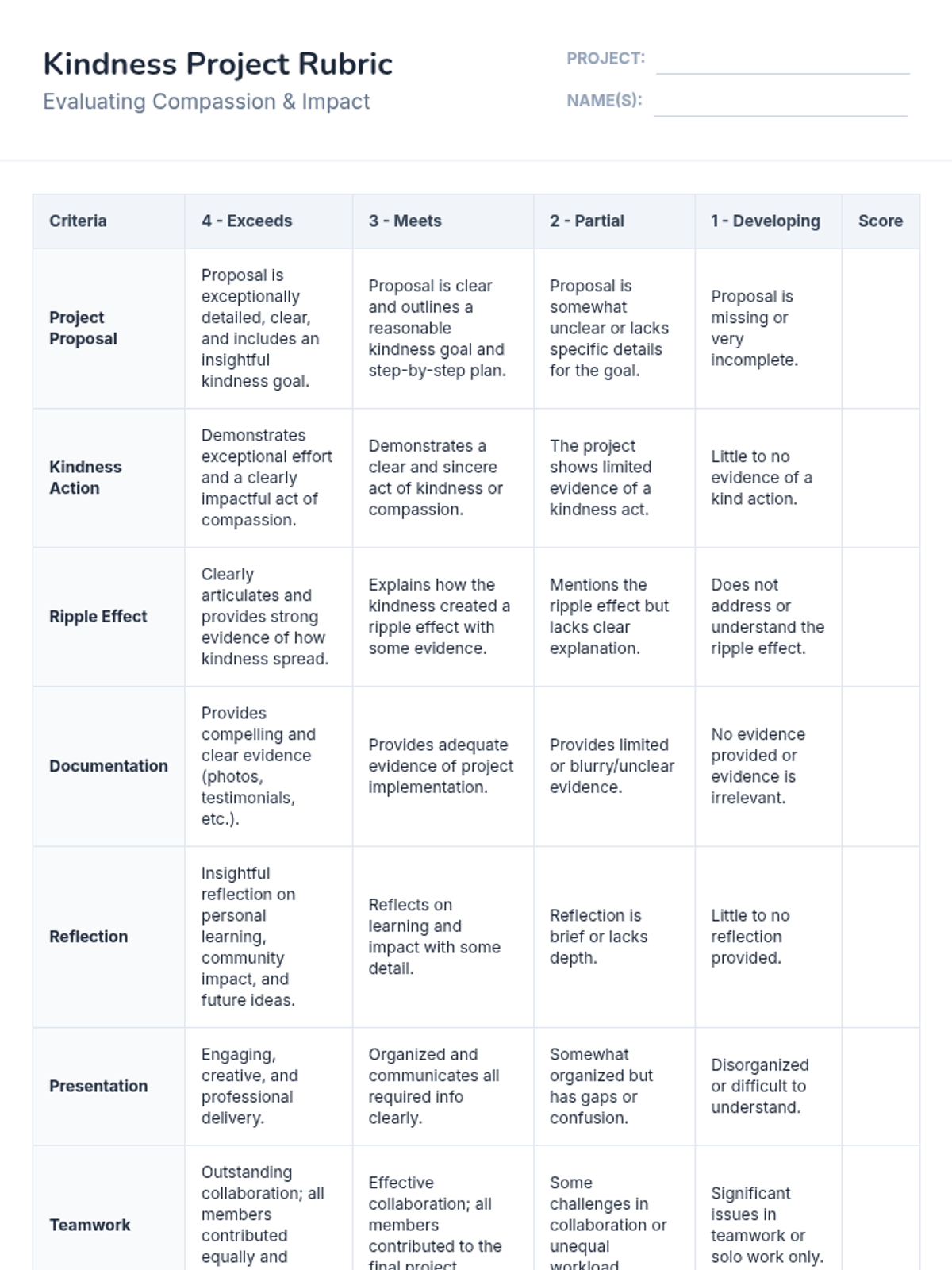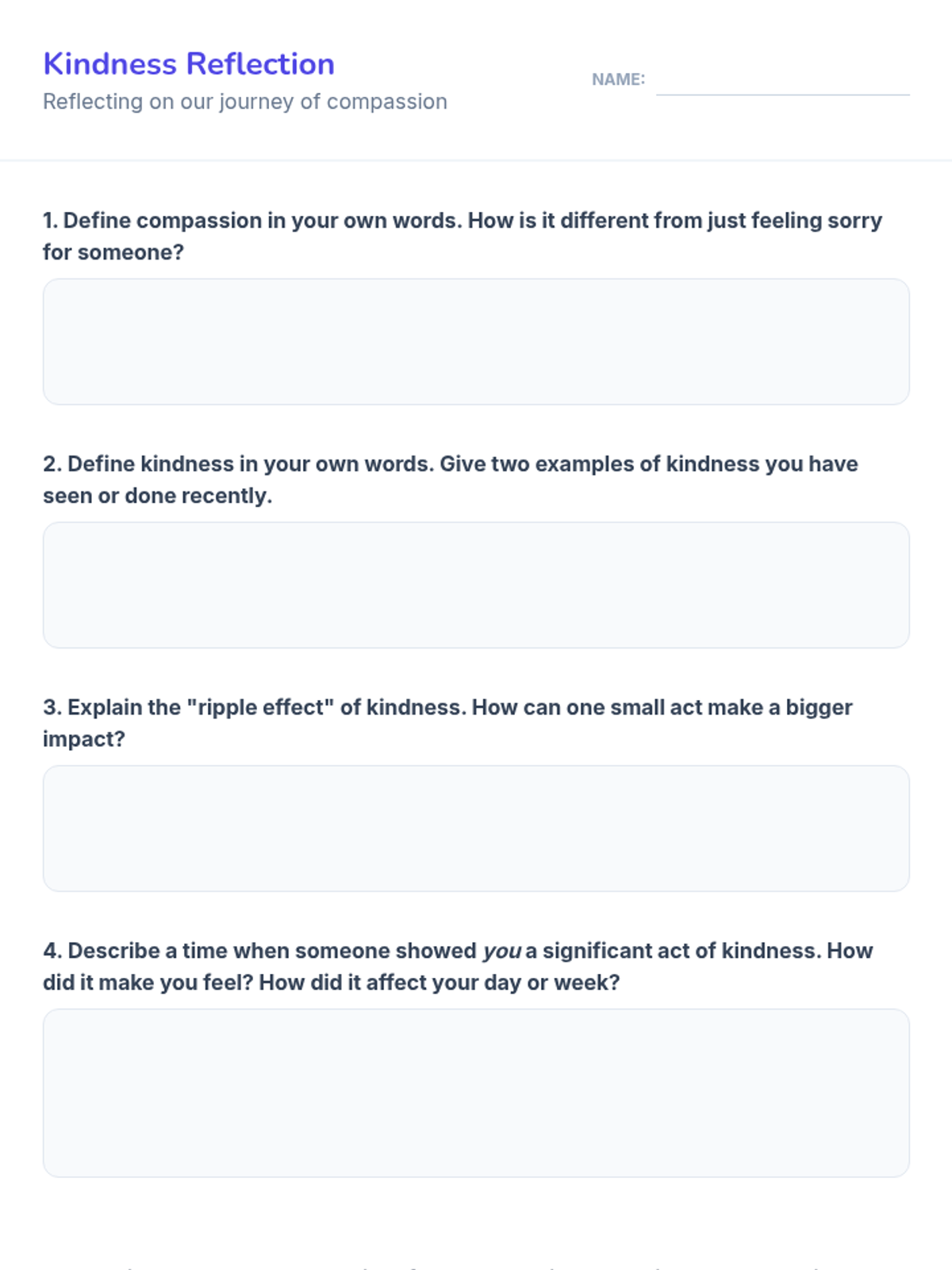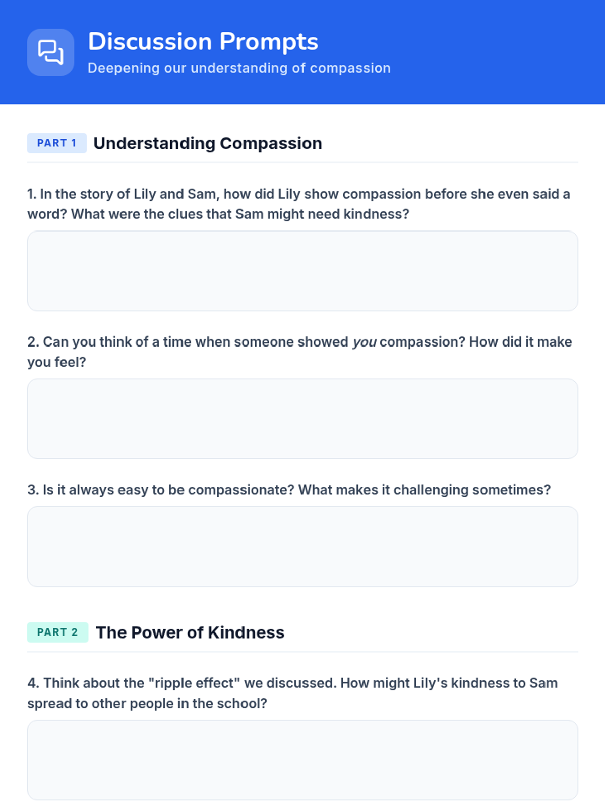 A 60-minute lesson for 5th-6th grade students that explores the concepts of compassion and kindness through interactive discussion, video analysis, and scenario-based practice. Students will learn how small acts of kindness create a 'ripple effect' that transforms their community.