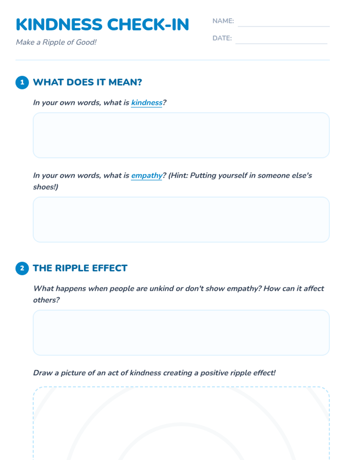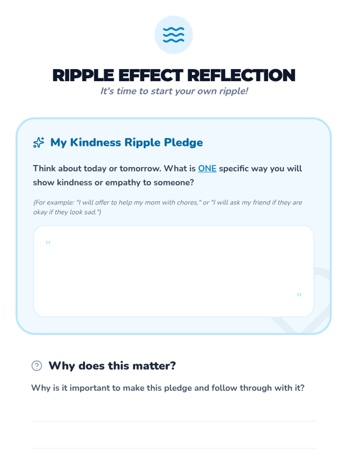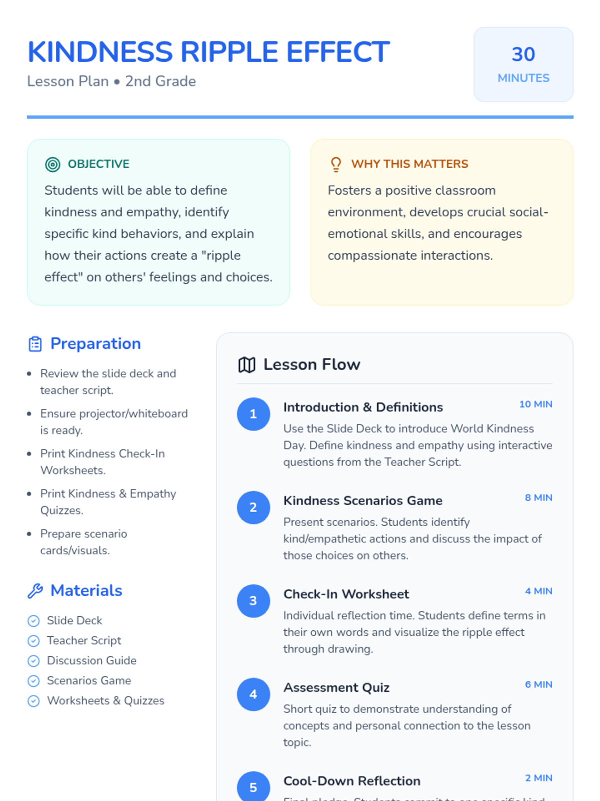 A 30-minute social-emotional learning lesson for 2nd graders exploring kindness, empathy, and the ripple effect of our actions. Students will define key terms, participate in a scenario game, and reflect on how their choices impact others.