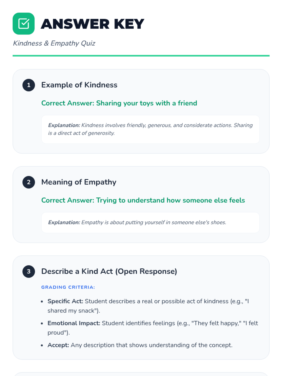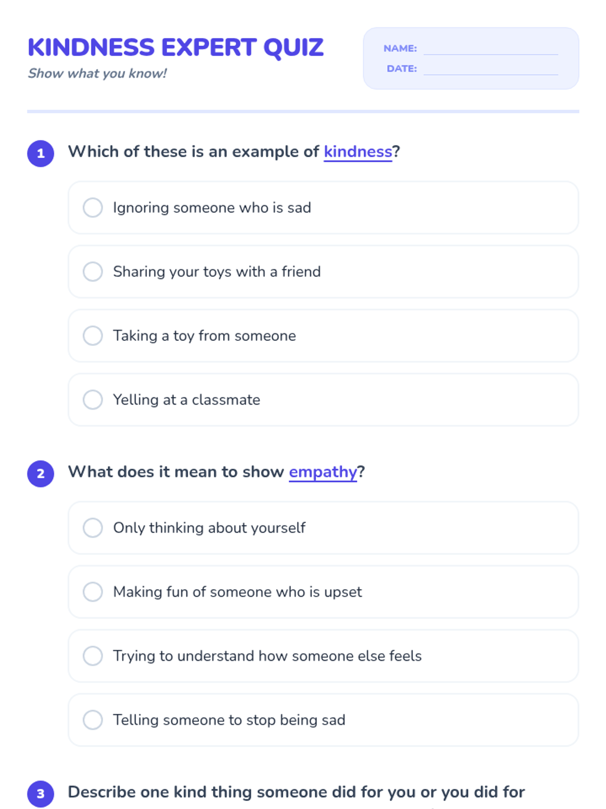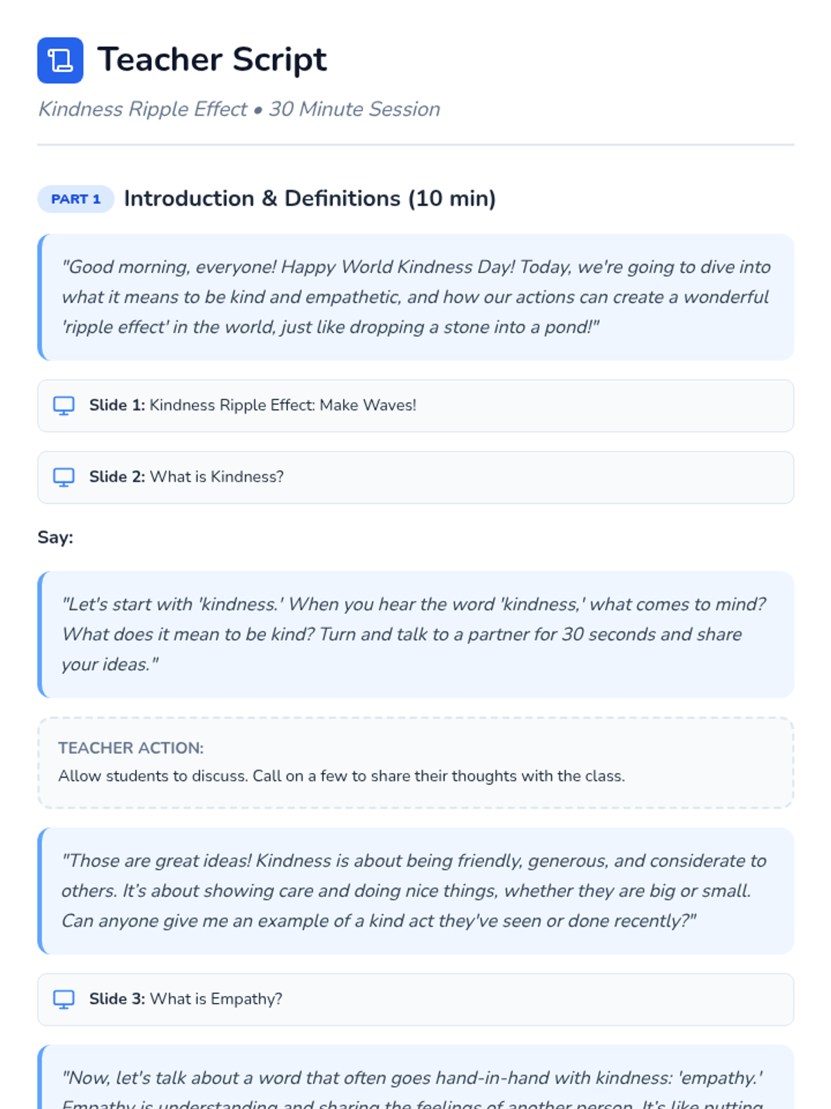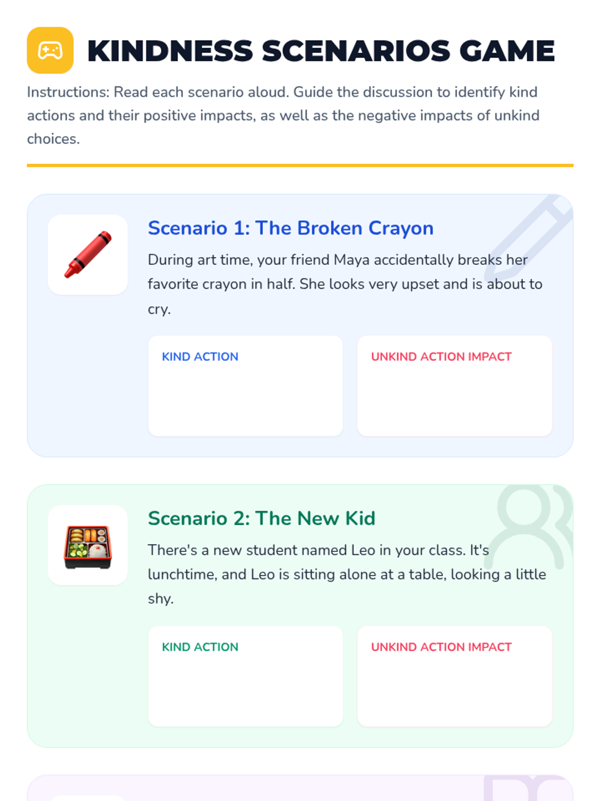 A 30-minute social-emotional learning lesson for 2nd graders exploring kindness, empathy, and the ripple effect of our actions. Students will define key terms, participate in a scenario game, and reflect on how their choices impact others.