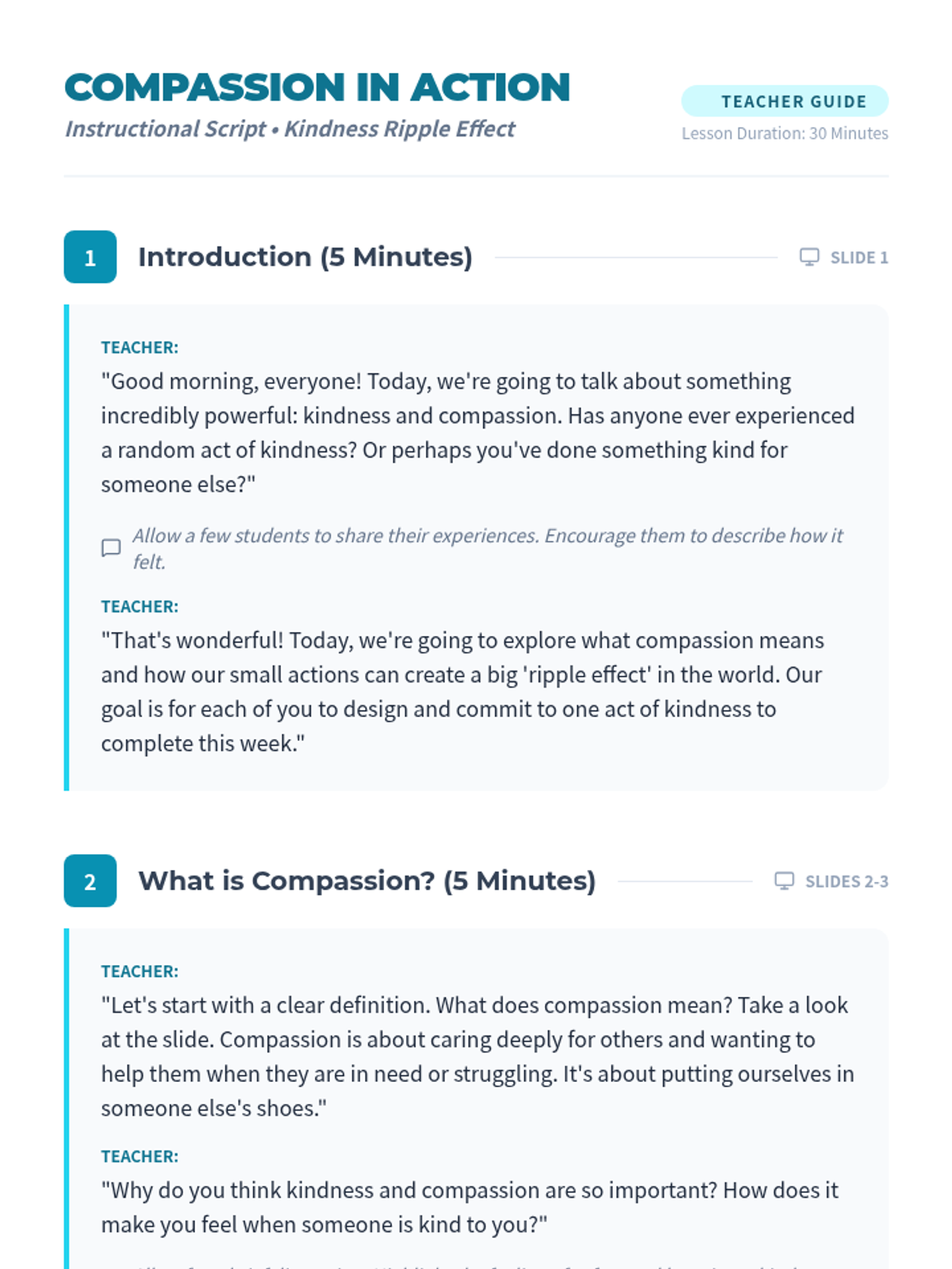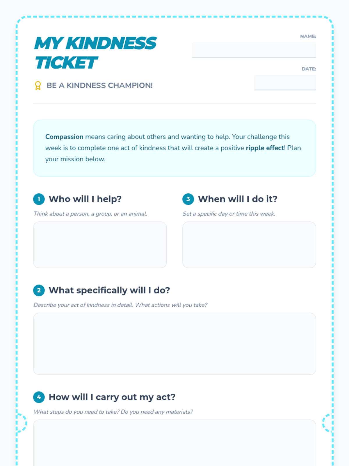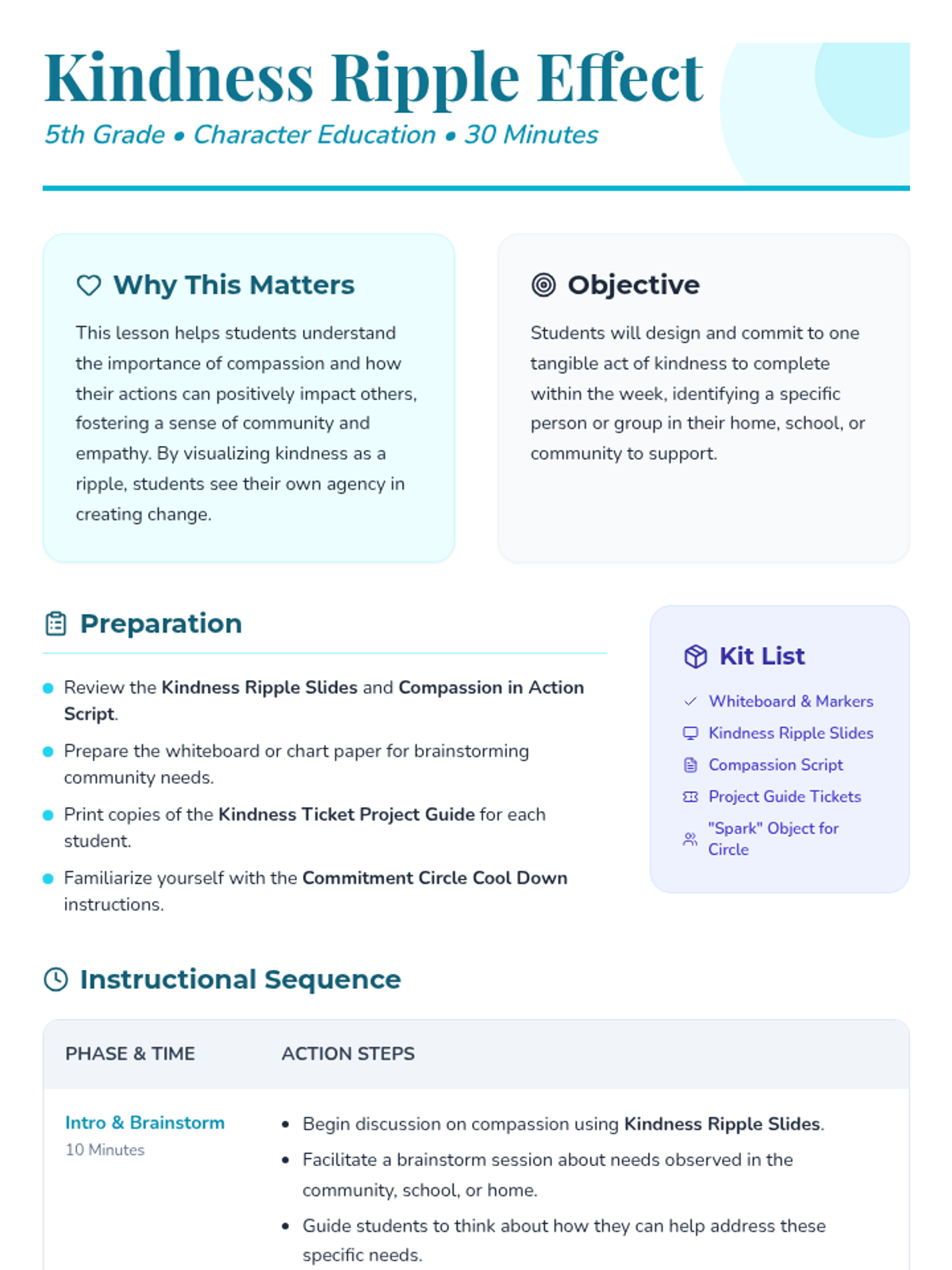 A 30-minute lesson for 5th-grade students exploring compassion and the ripple effect of small acts of kindness through planning and committing to a tangible community project.
