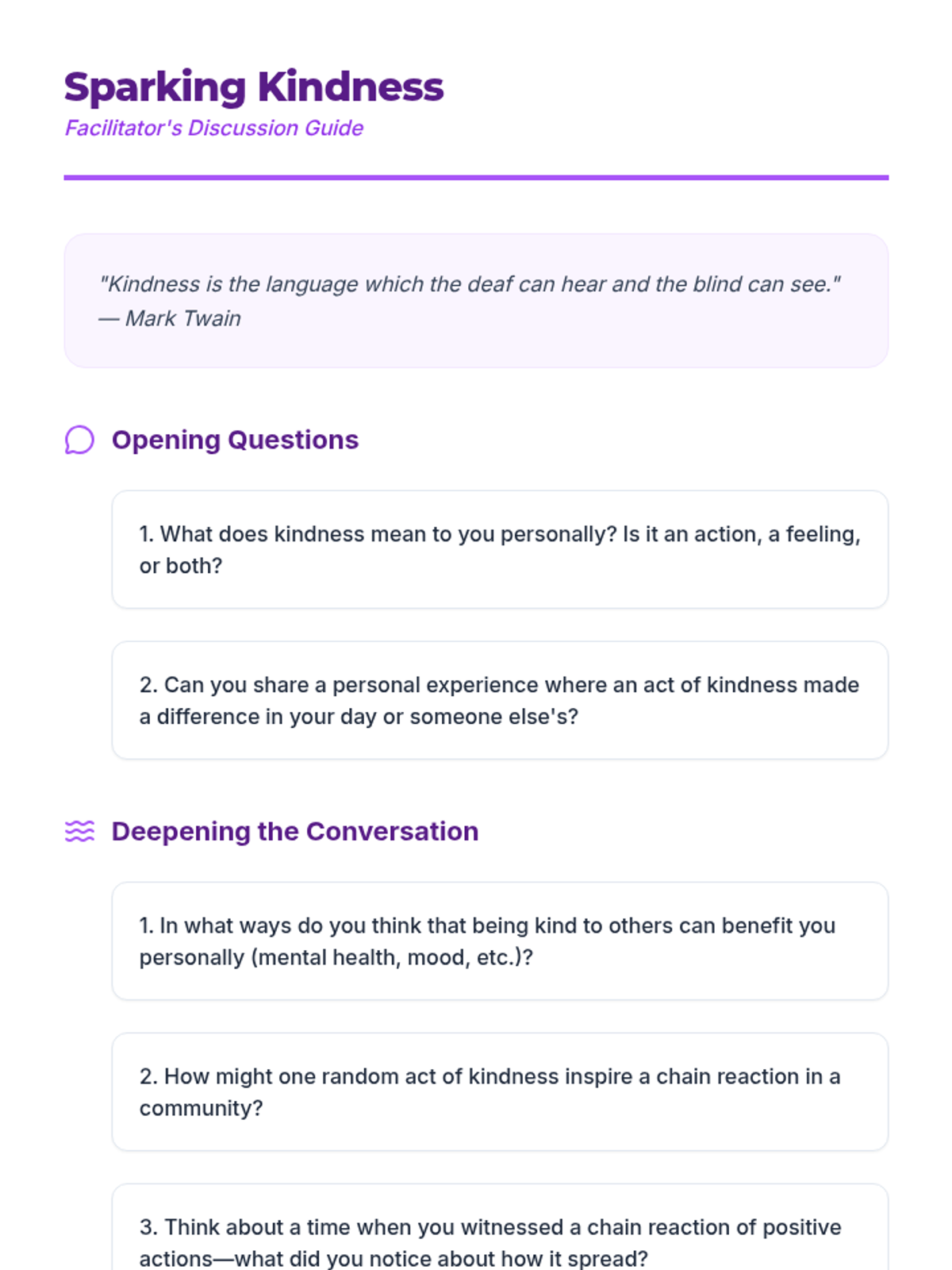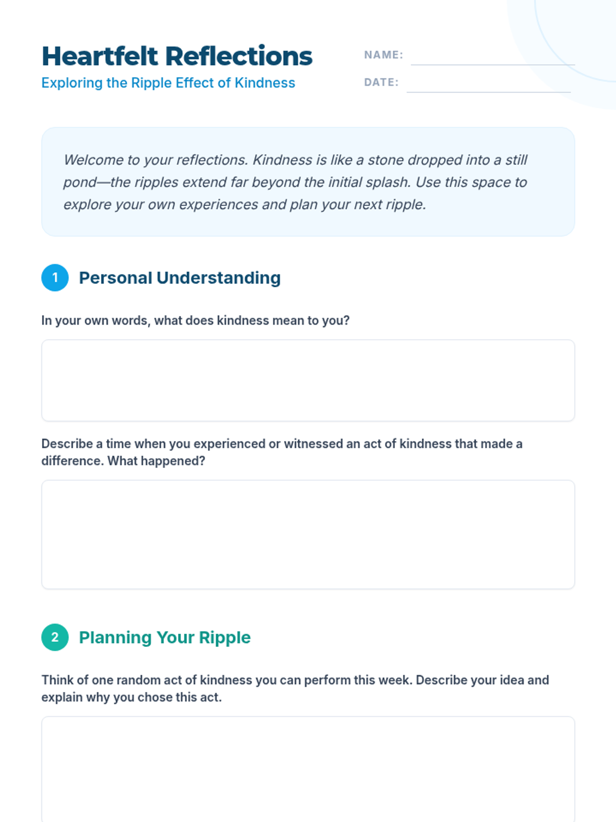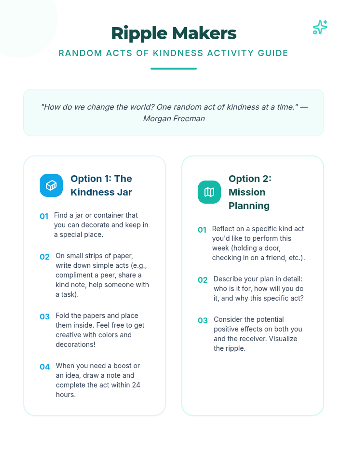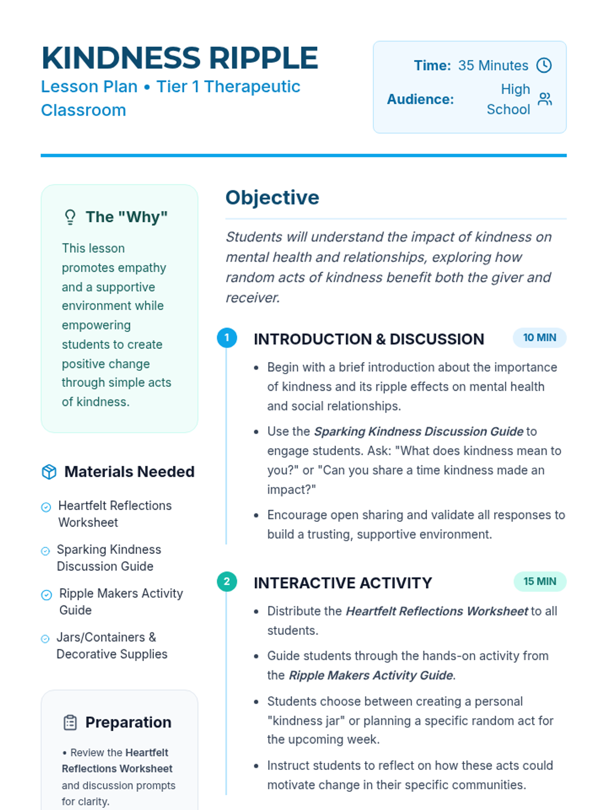 A 35-minute lesson for high school students in a therapeutic setting focused on the psychological and social benefits of kindness. Students explore personal experiences, plan random acts of kindness, and discuss the "ripple effect" of positive actions.