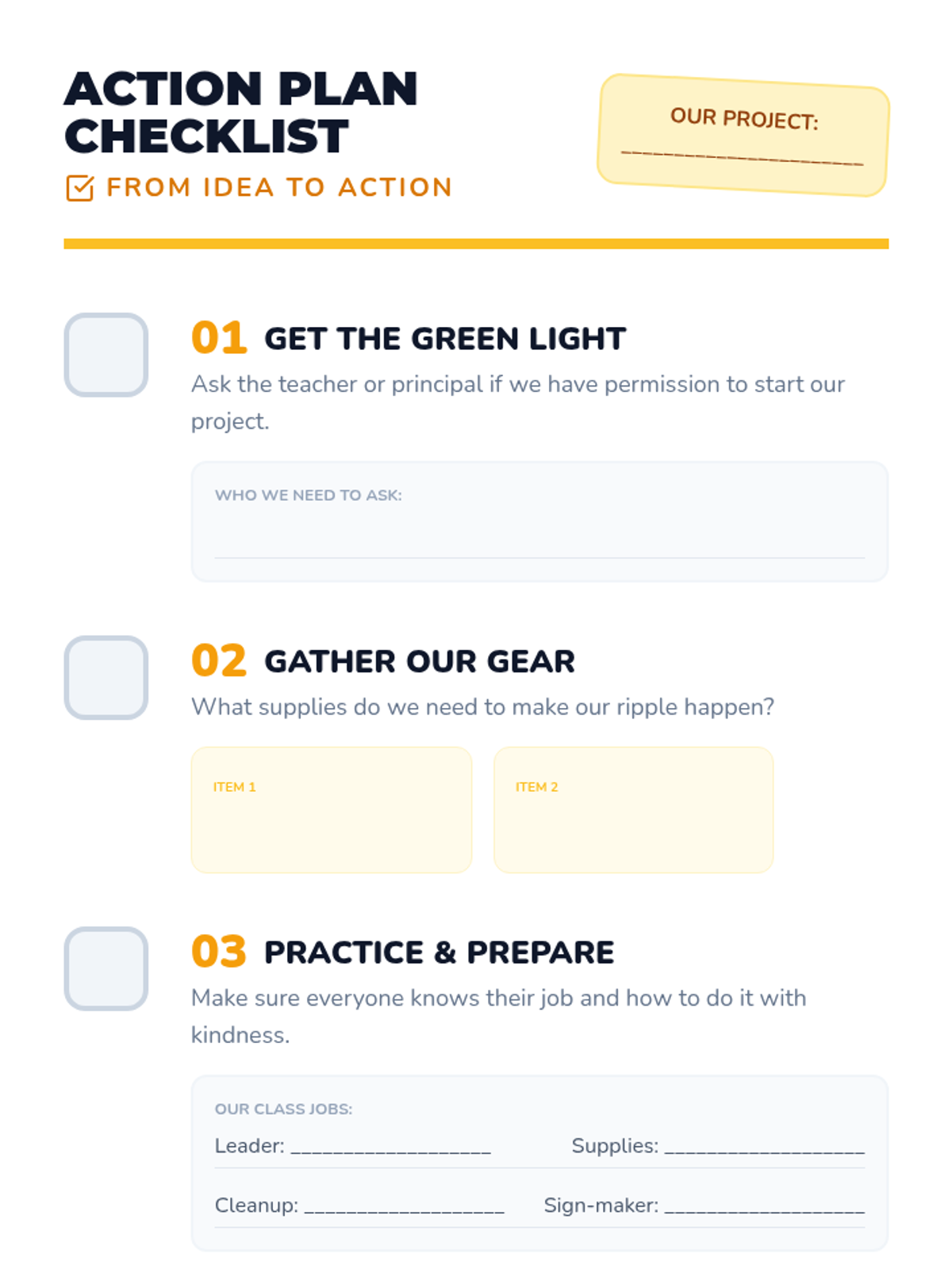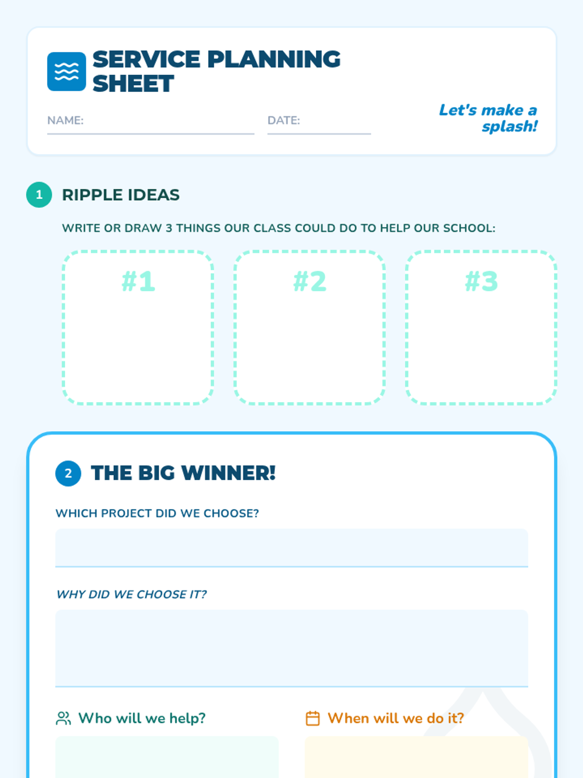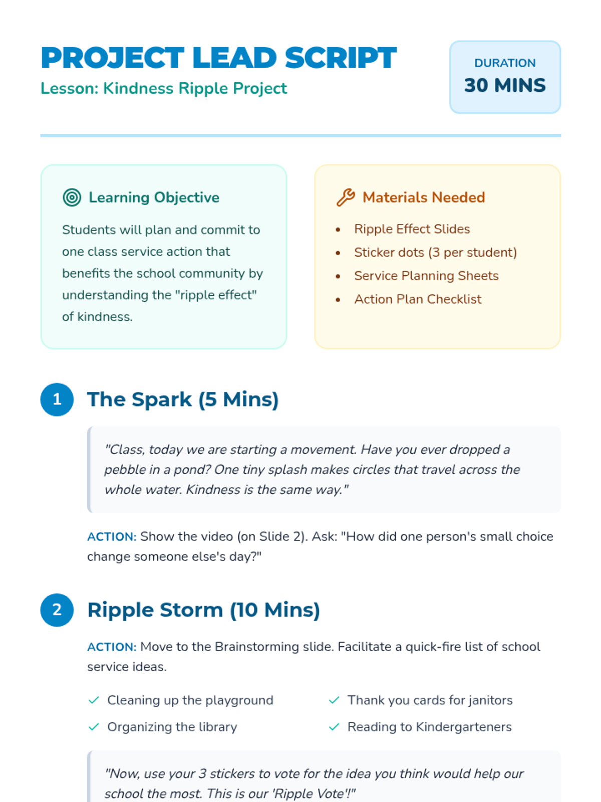 A high-energy, 30-minute lesson where 2nd graders learn the power of small actions and collaborate to plan a service project that benefits their school.