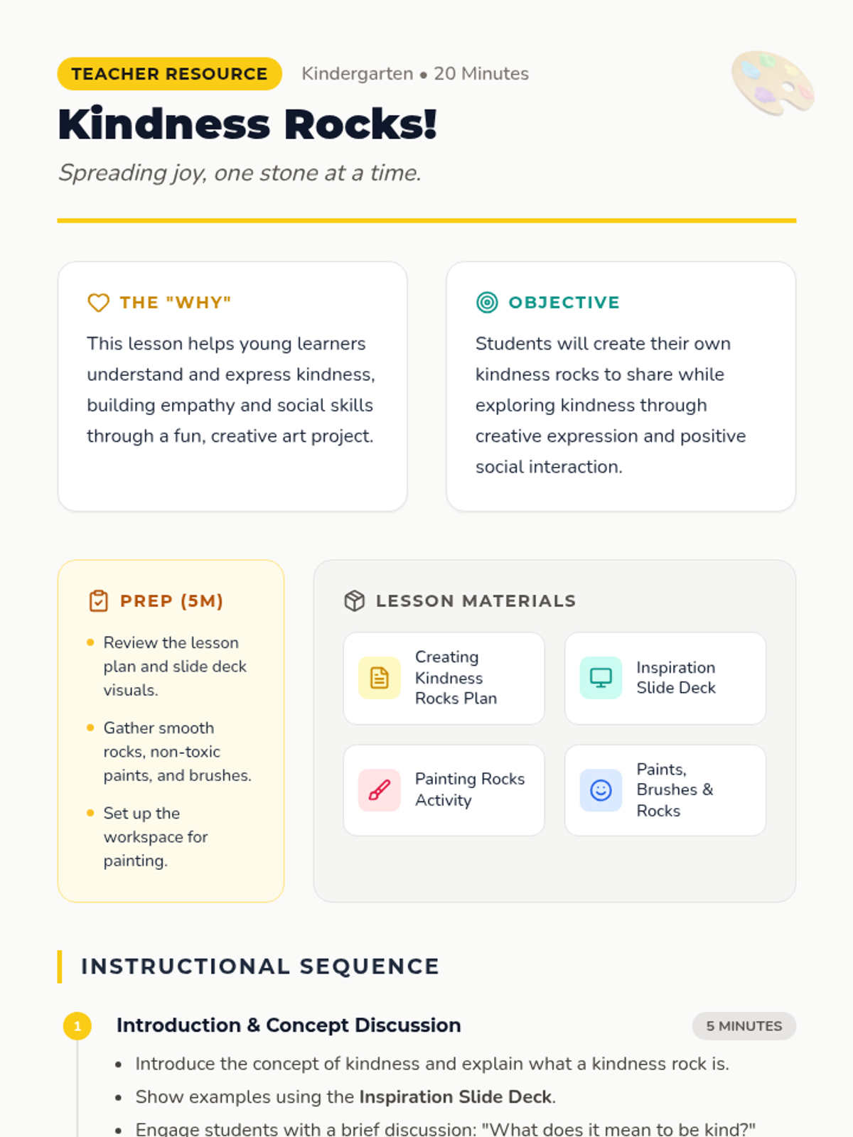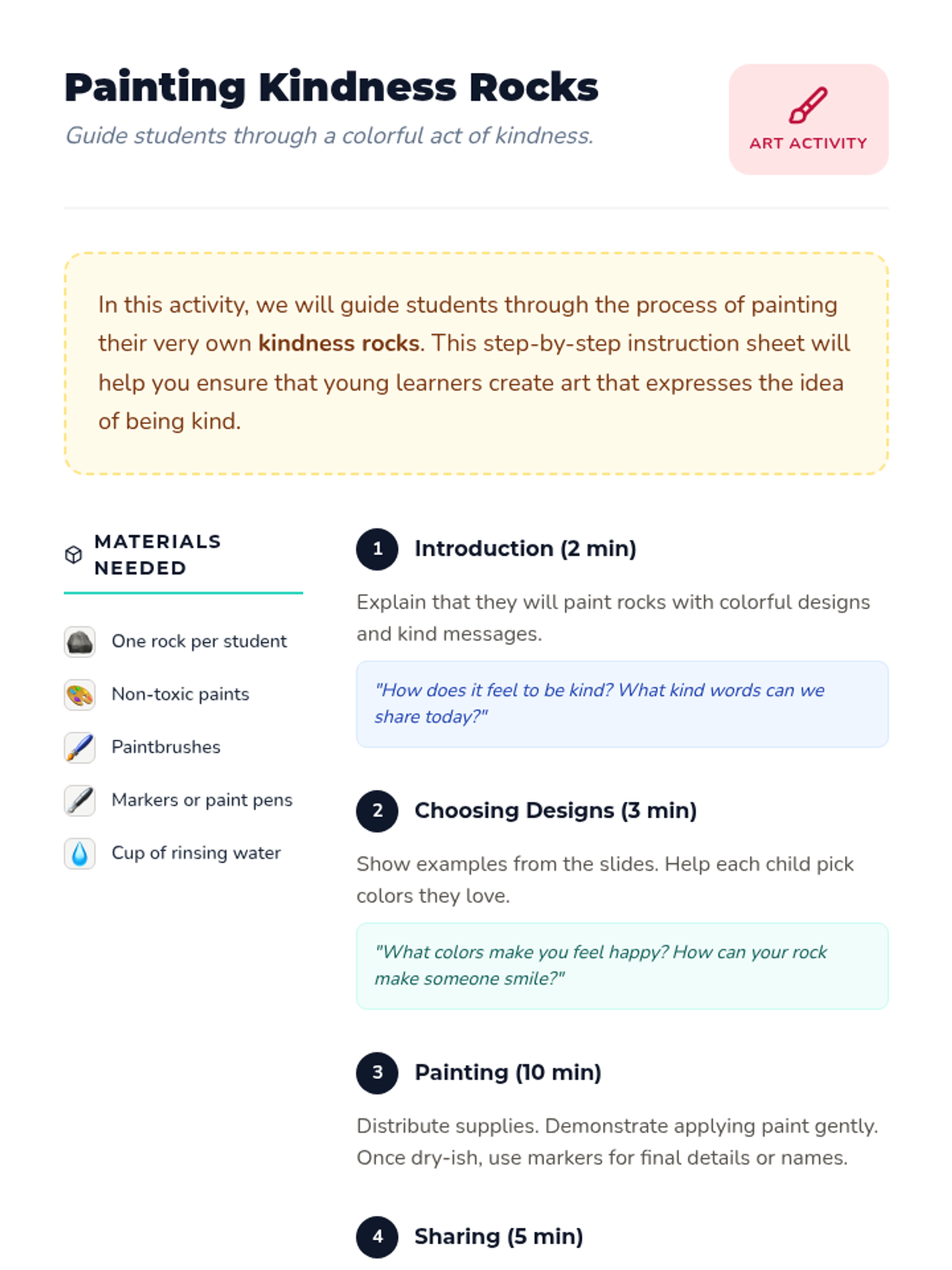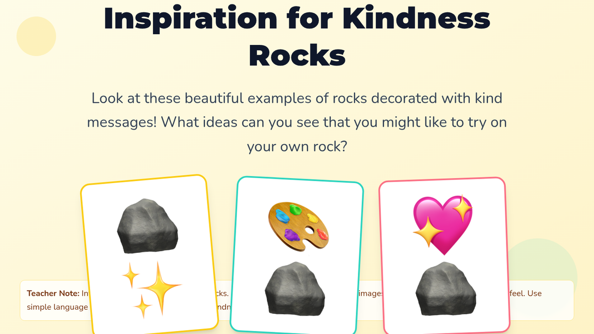 Students learn about kindness by creating their own 'kindness rocks' to share with classmates. This activity enhances creativity and reinforces positive social interactions through art.
