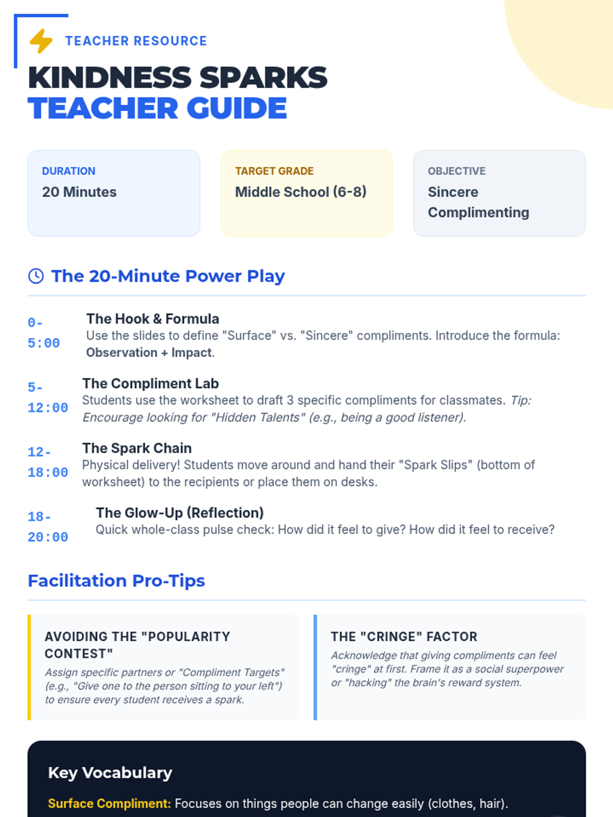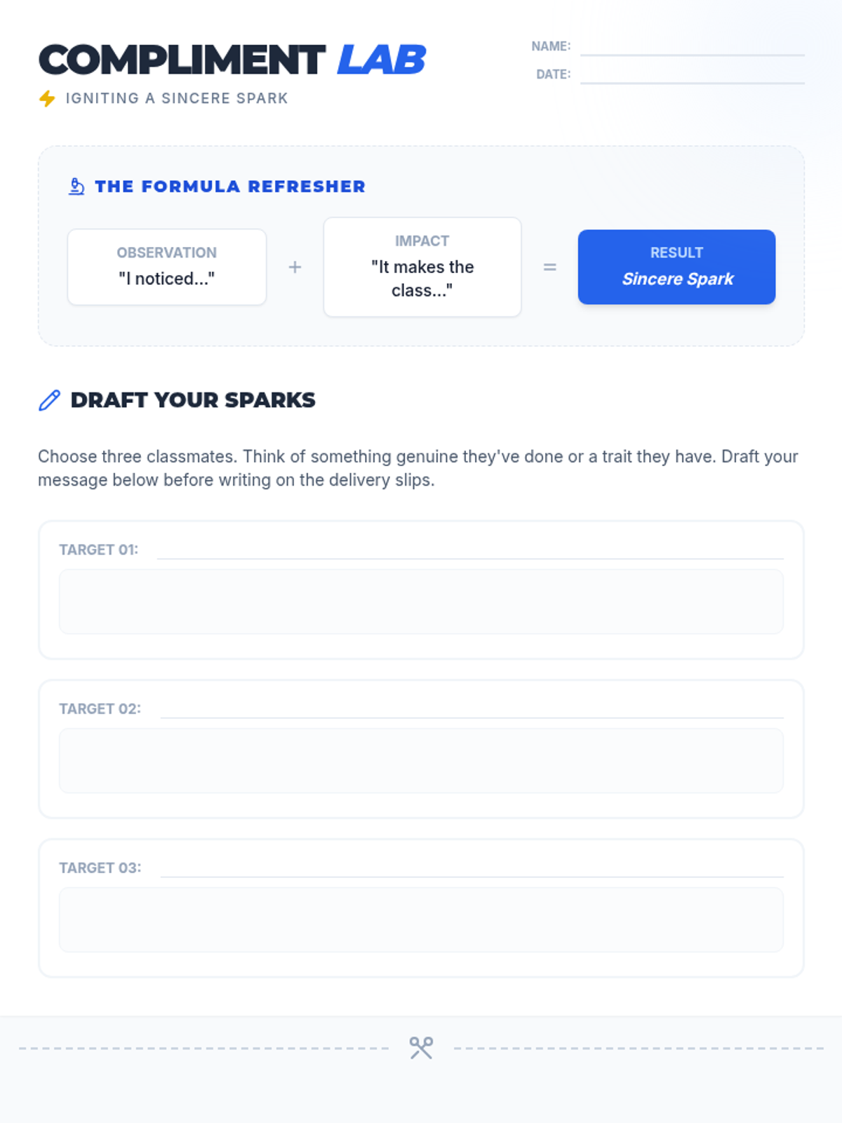 A 20-minute high-energy activity for middle schoolers to learn the art of sincere complimenting and build a positive classroom culture.