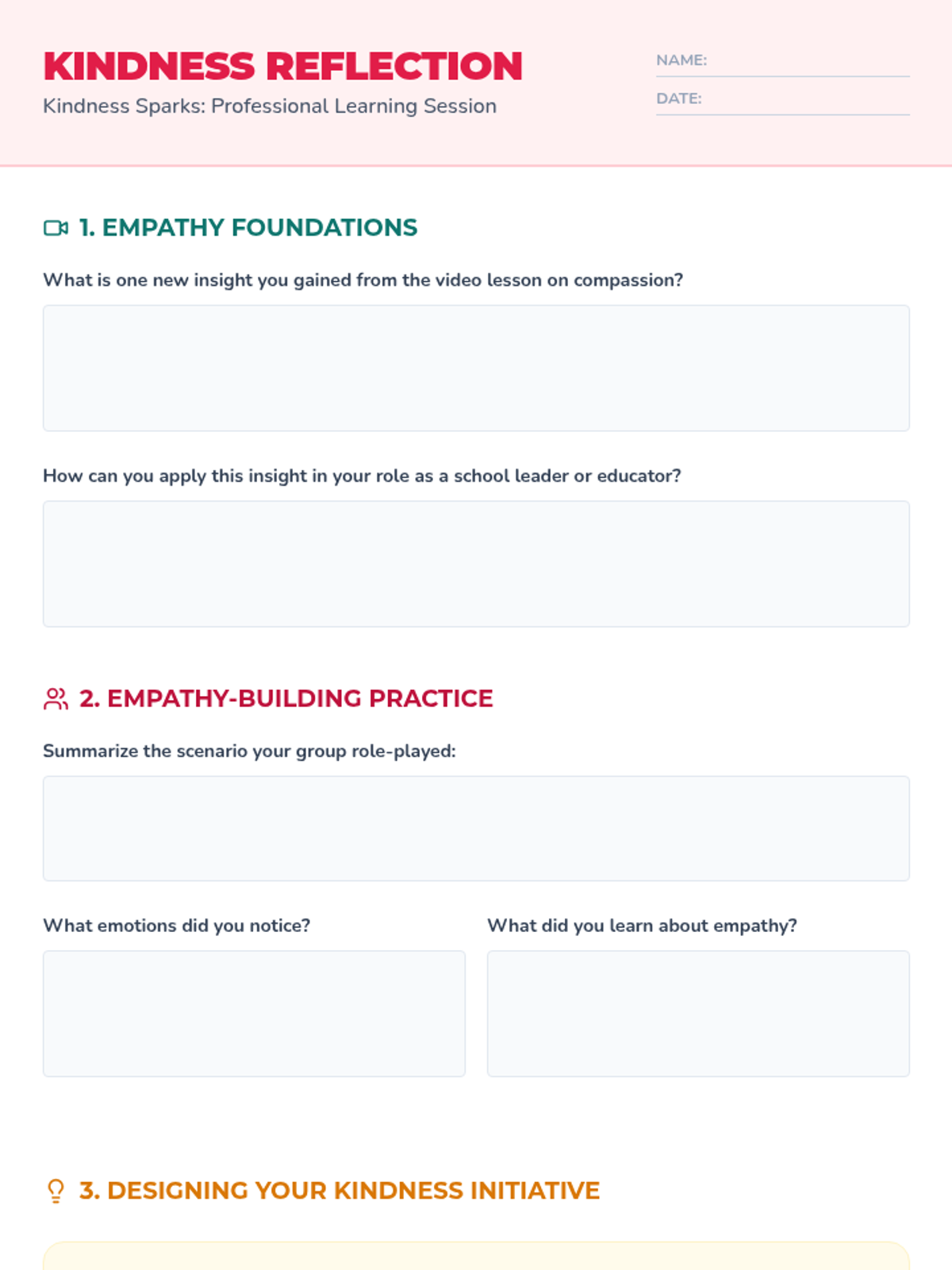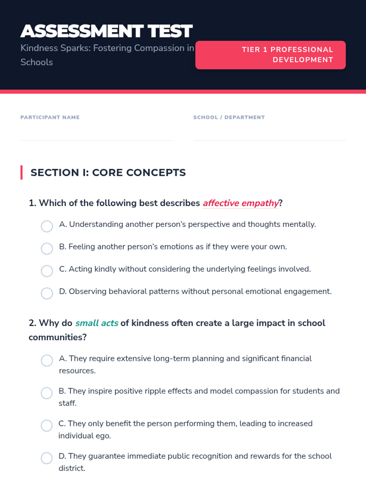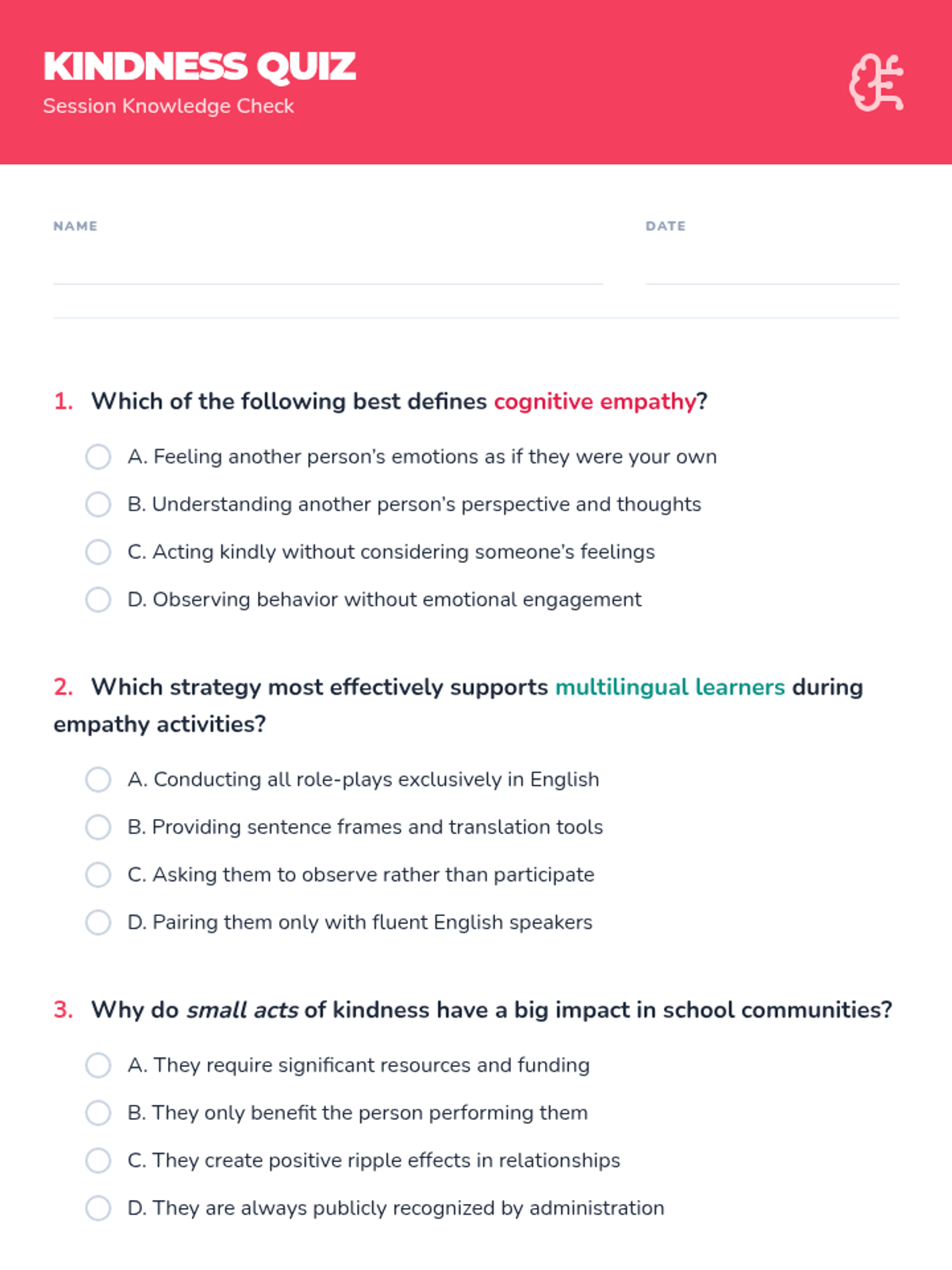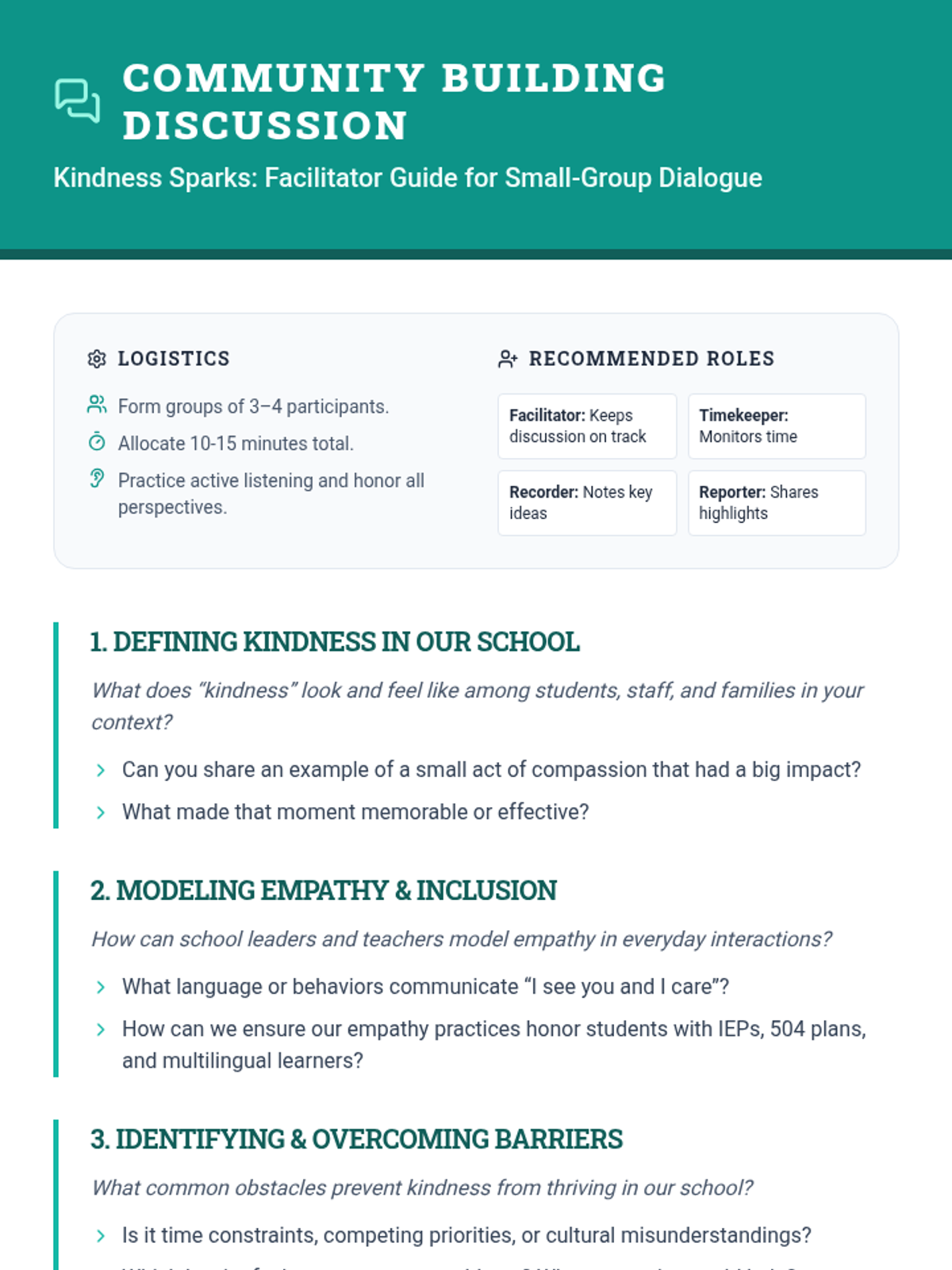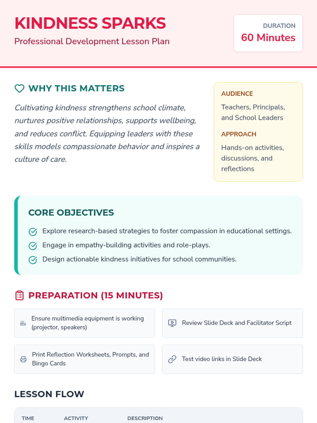 An engaging one-hour Tier 1 lesson for school leaders and educators on fostering compassion and kindness. Participants explore research-based strategies, practice empathy role-plays, and design actionable kindness projects for their school communities.