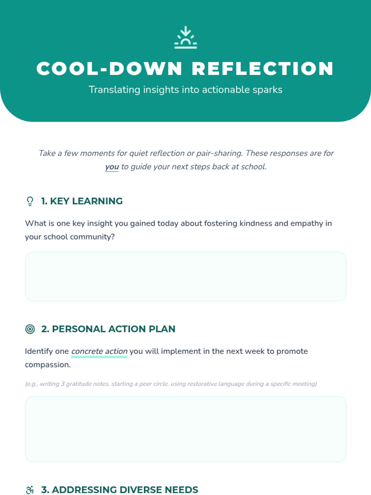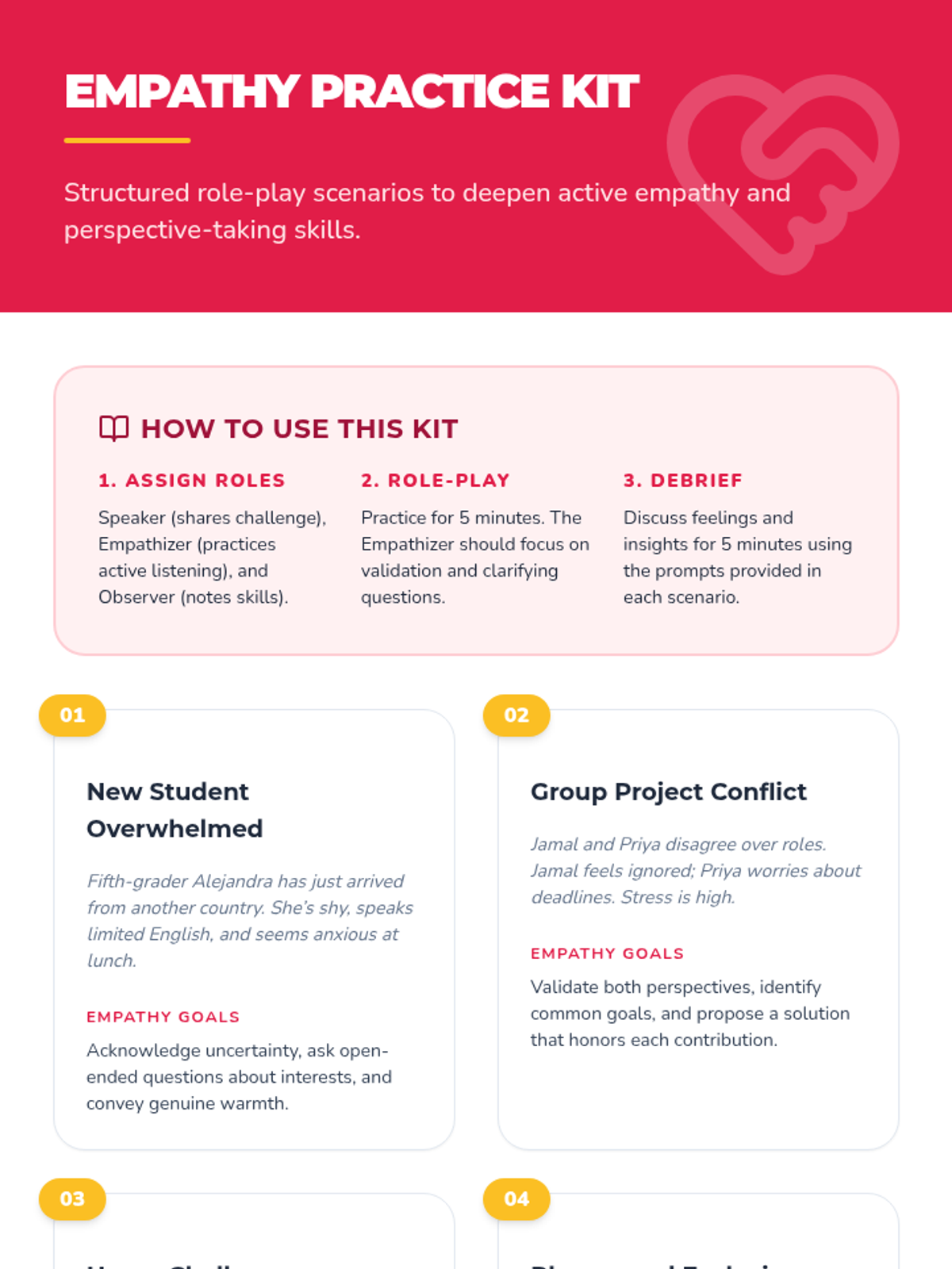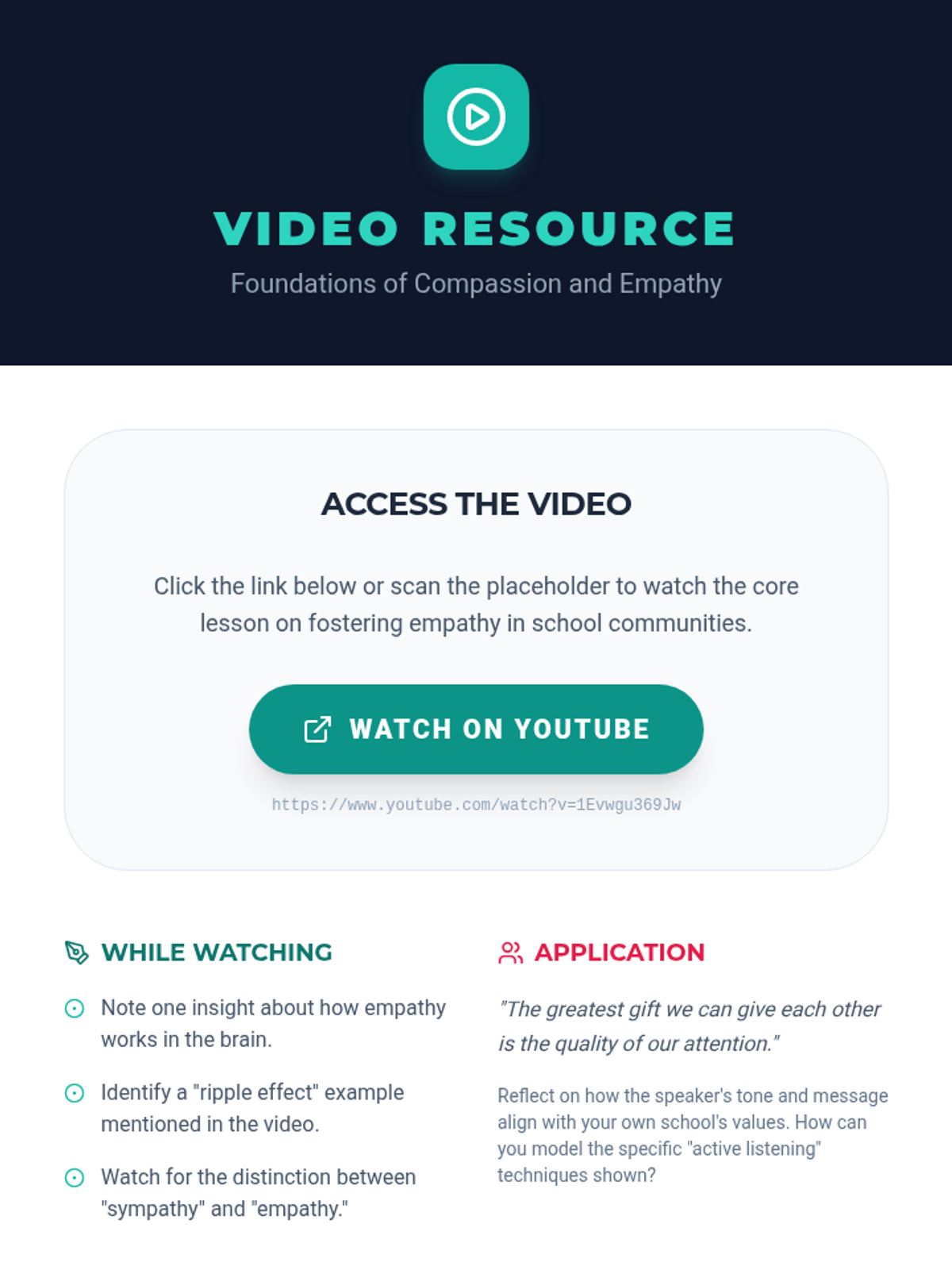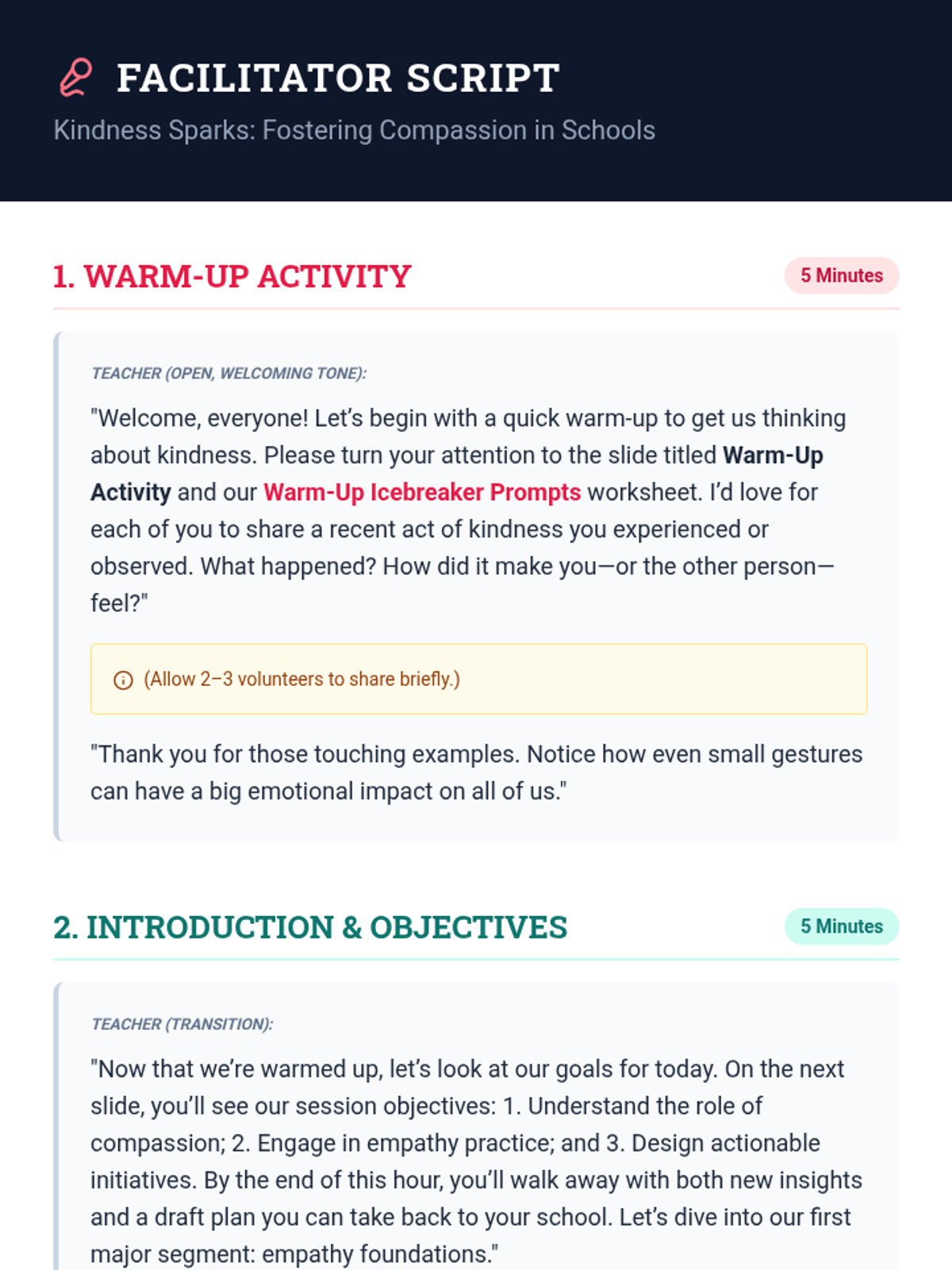 An engaging one-hour Tier 1 lesson for school leaders and educators on fostering compassion and kindness. Participants explore research-based strategies, practice empathy role-plays, and design actionable kindness projects for their school communities.