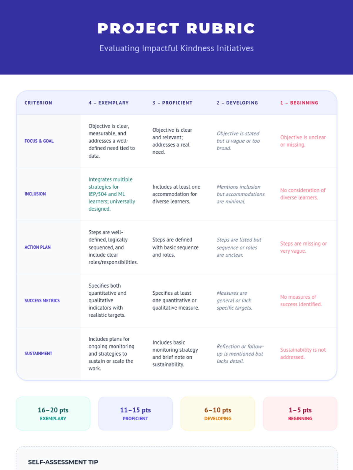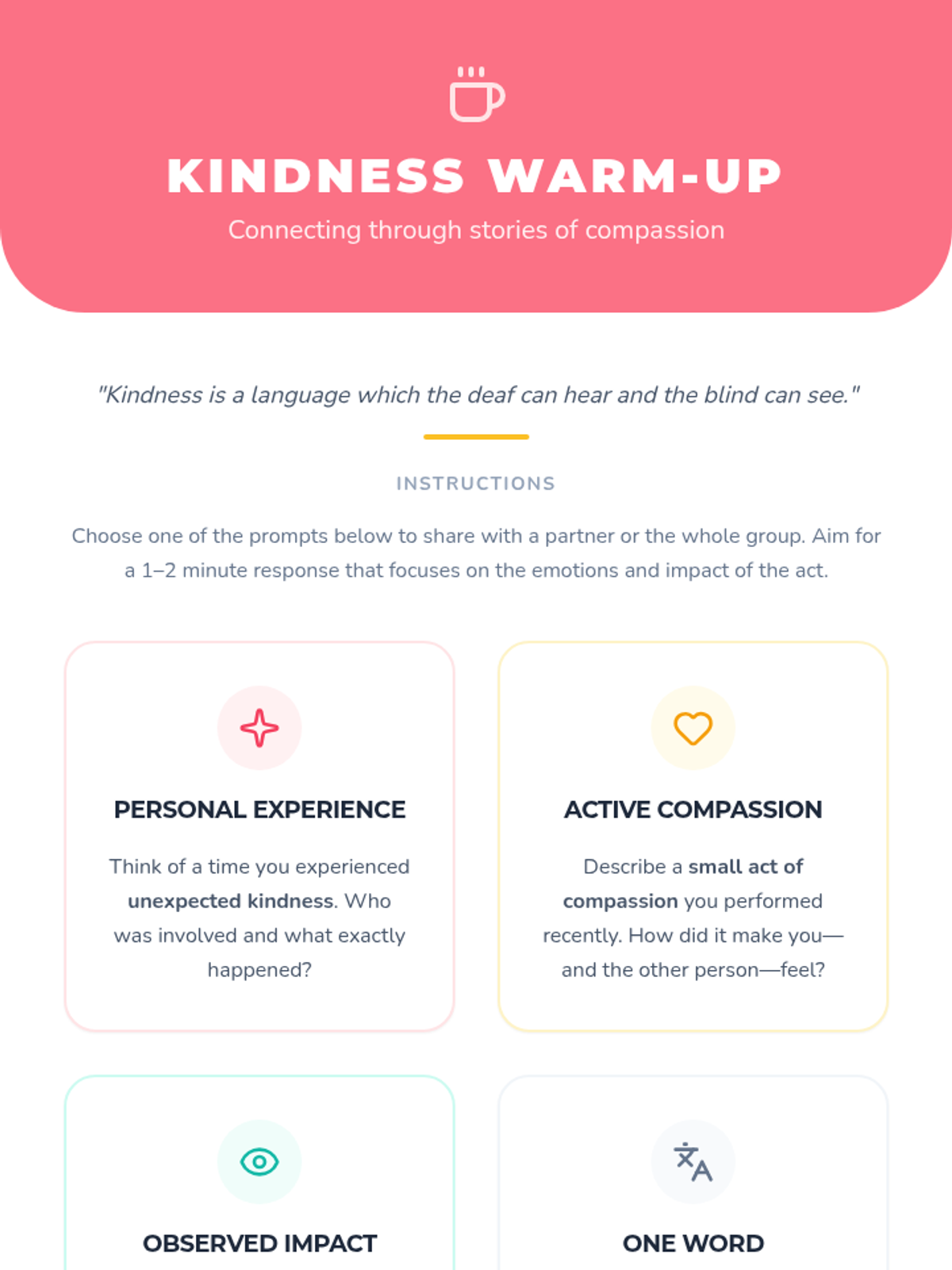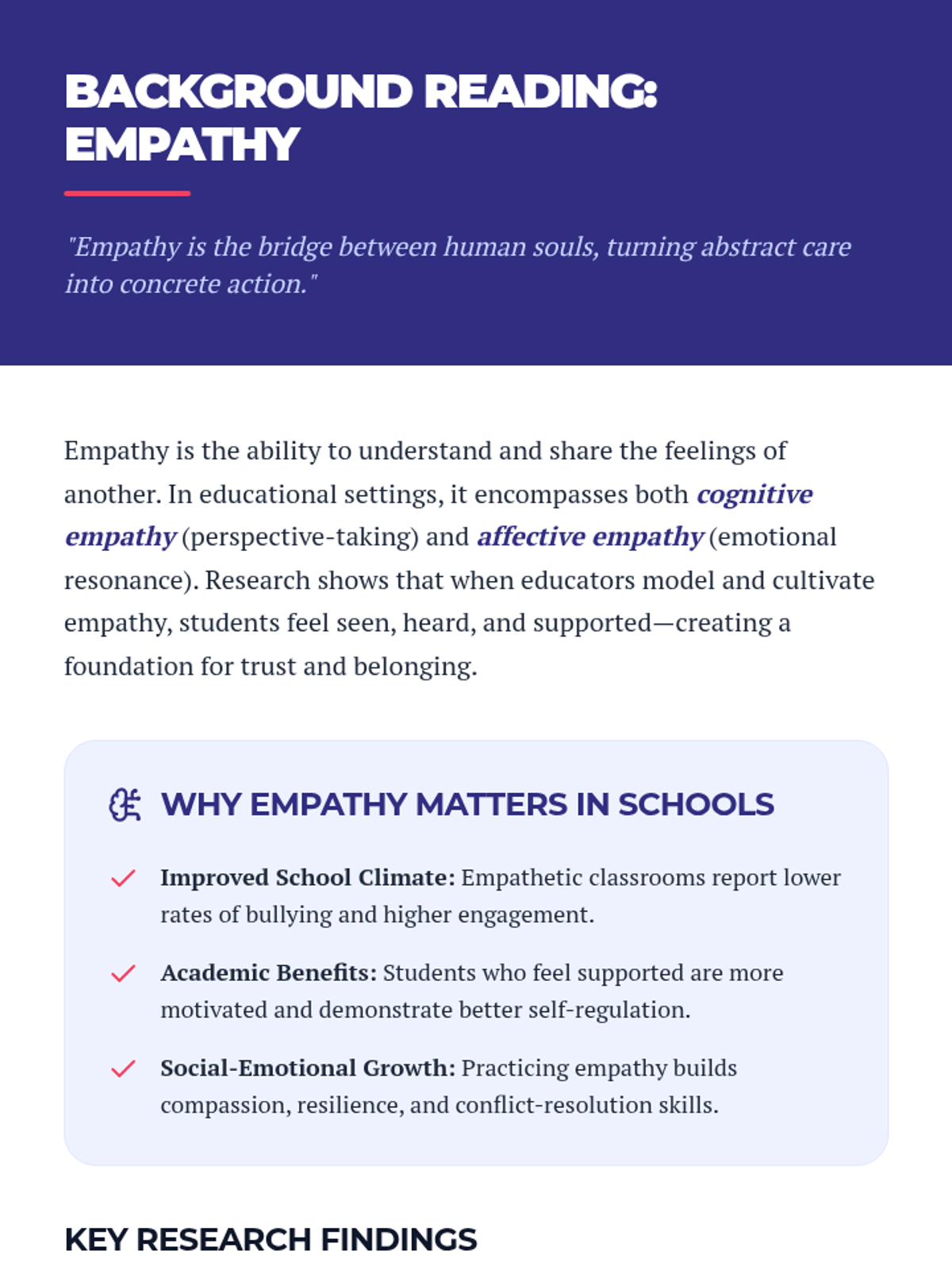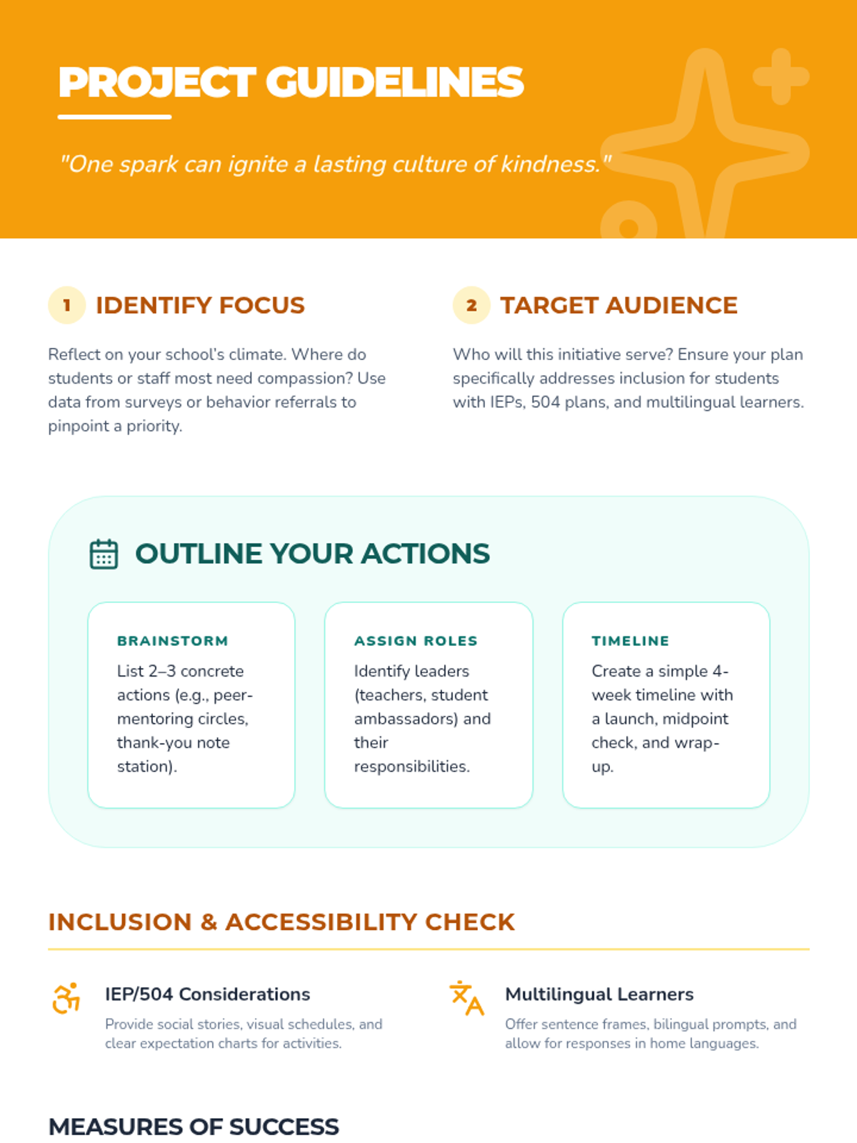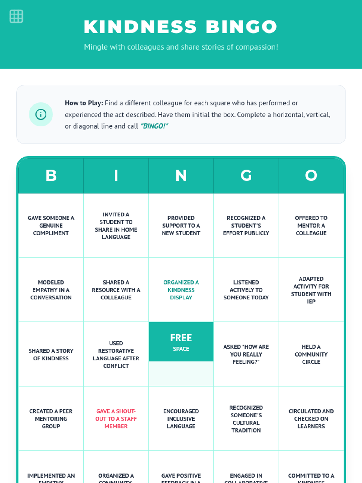 An engaging one-hour Tier 1 lesson for school leaders and educators on fostering compassion and kindness. Participants explore research-based strategies, practice empathy role-plays, and design actionable kindness projects for their school communities.