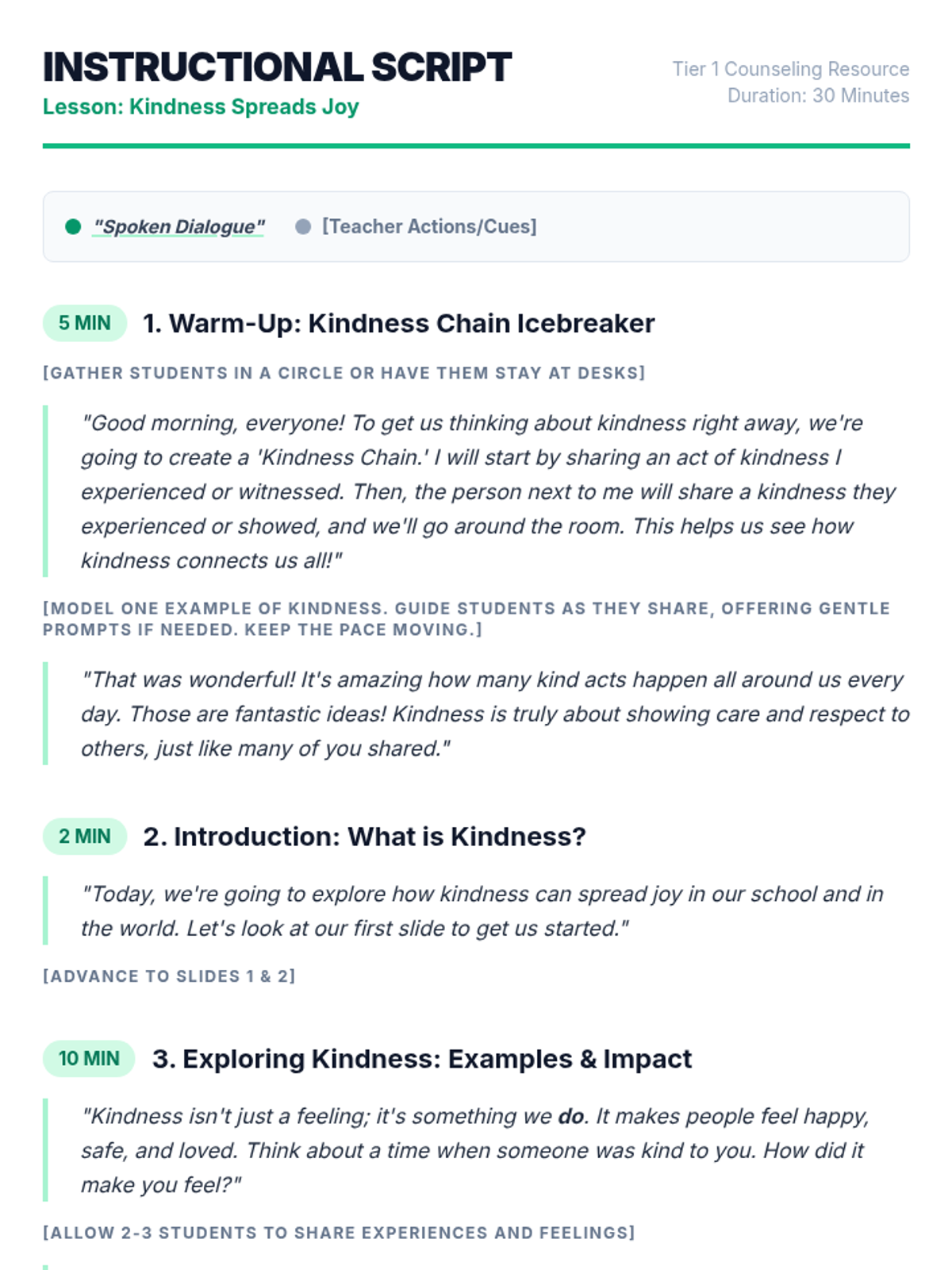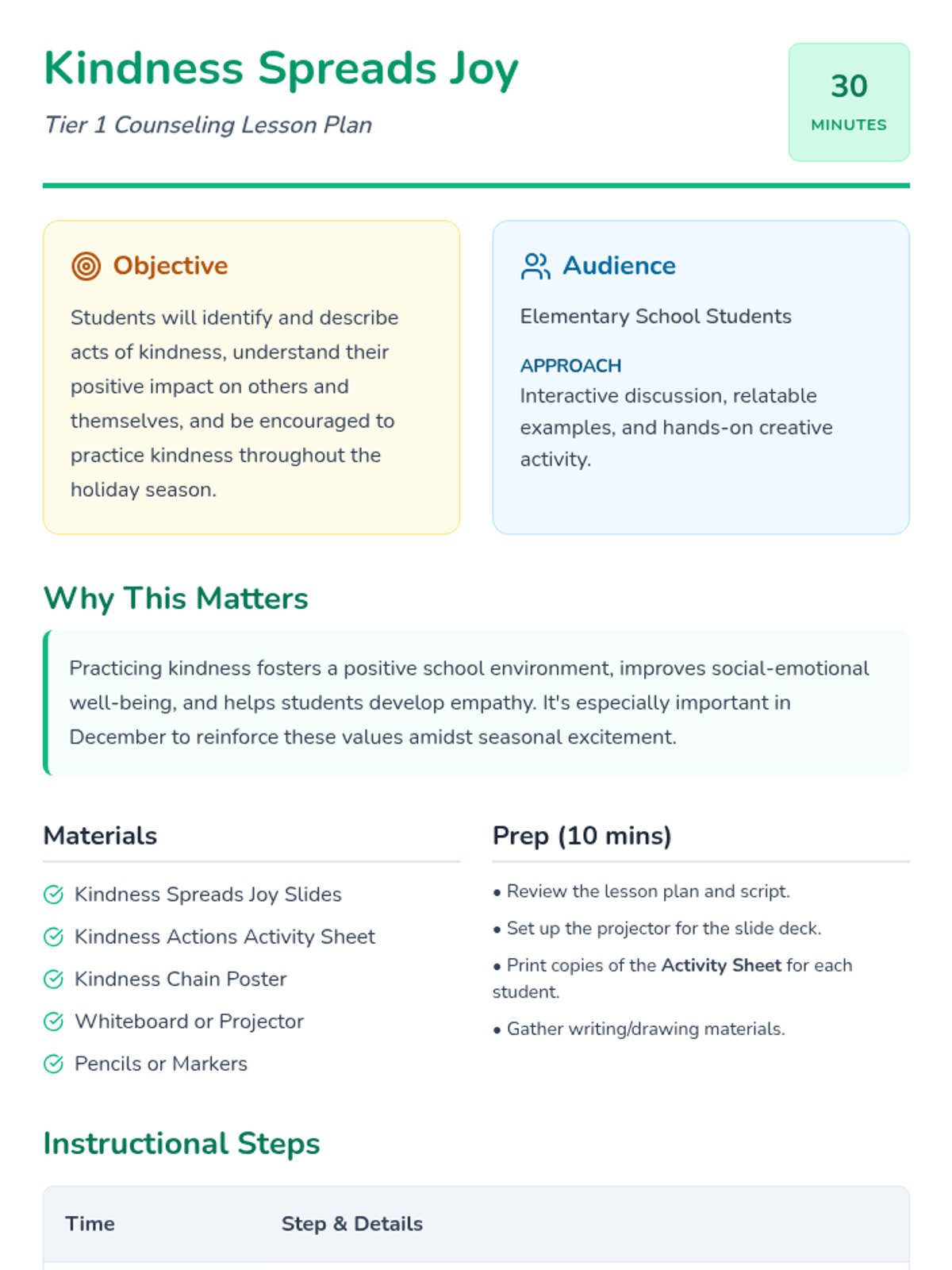 A 30-minute Tier 1 elementary school counseling lesson designed to help students understand and practice the positive impact of kindness on themselves and others during the holiday season.