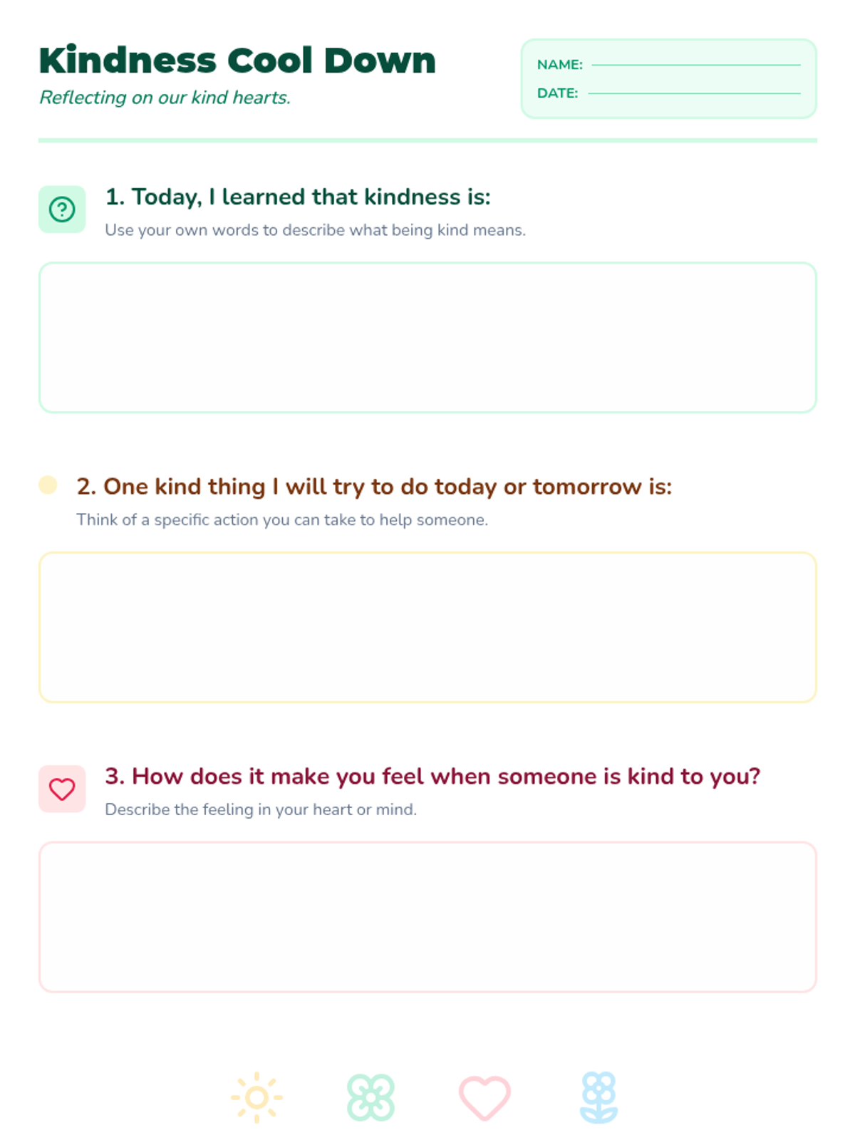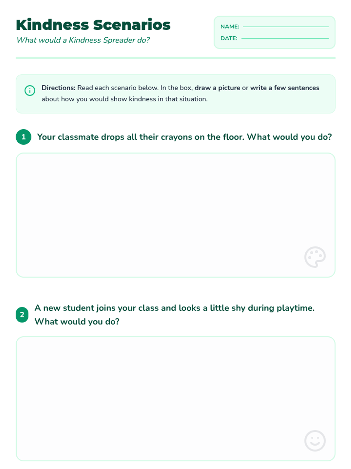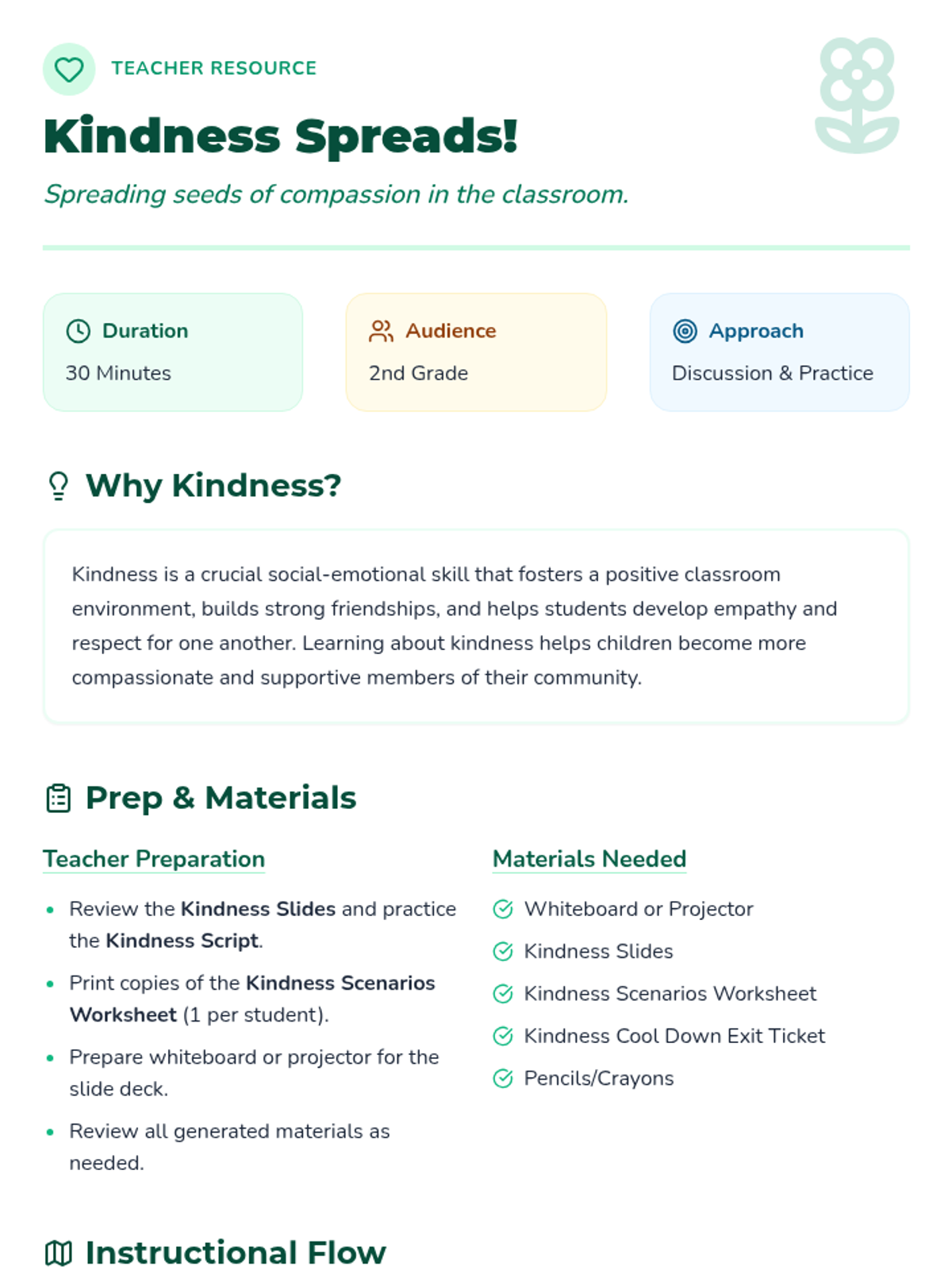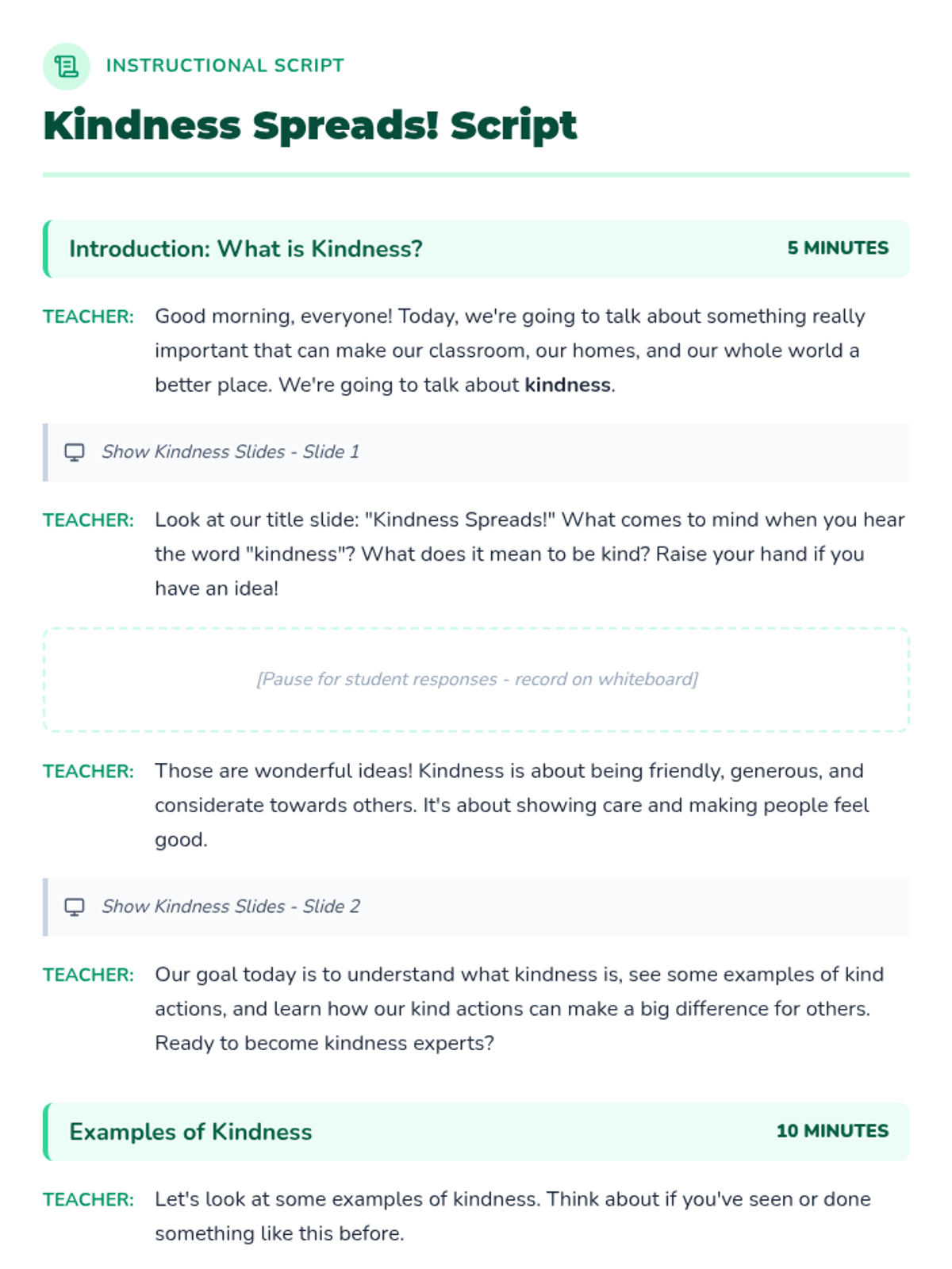 A foundational social-emotional learning lesson for 2nd graders that explores the meaning of kindness, identifies kind actions, and examines the ripple effect of positive behavior. Students engage in discussions, scenario-based practice, and reflection.