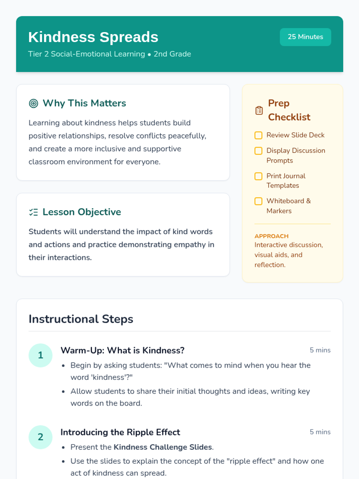 A 25-minute Tier 2 group lesson for 2nd graders focused on the ripple effect of kindness. Students explore kind words and actions through interactive discussion, a slide presentation, and personal reflection.