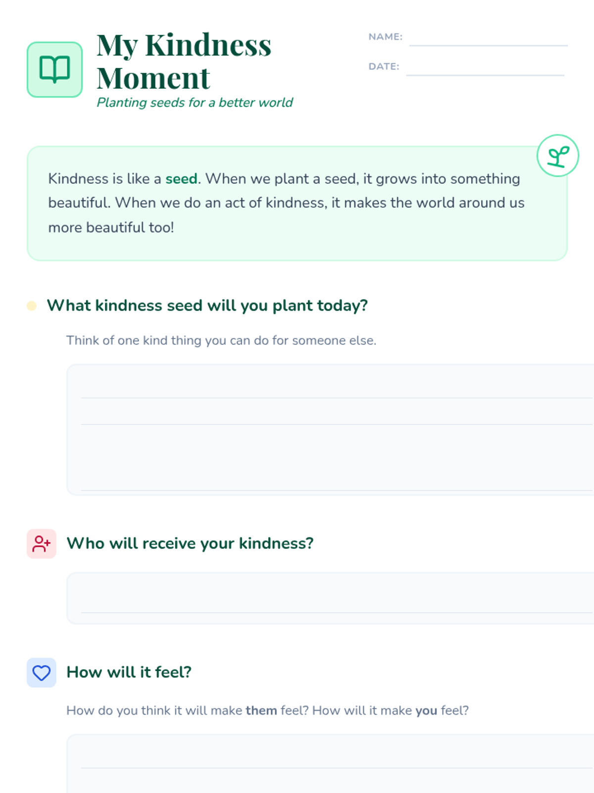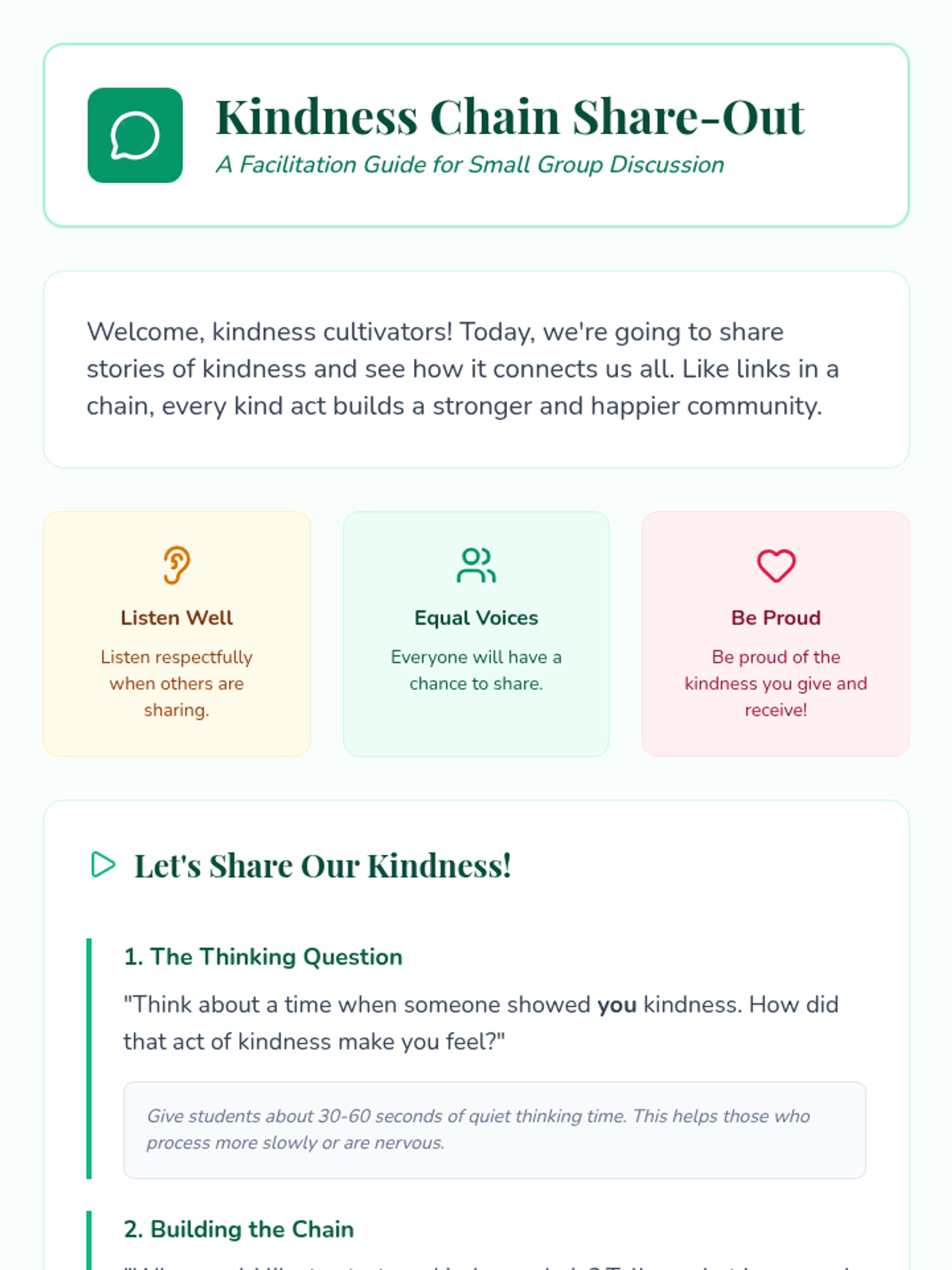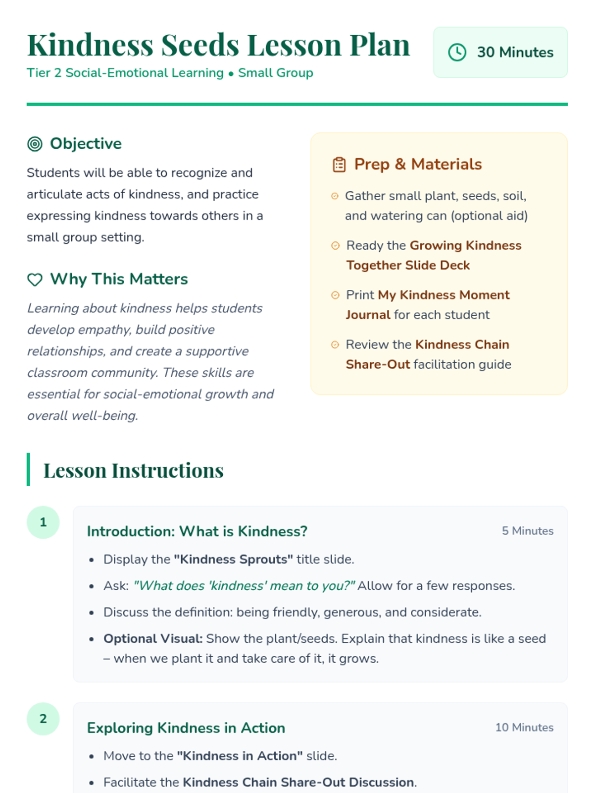 A 30-minute social-emotional learning lesson for small groups focused on recognizing and practicing acts of kindness. Students explore empathy and build a supportive community through discussion and personal reflection.