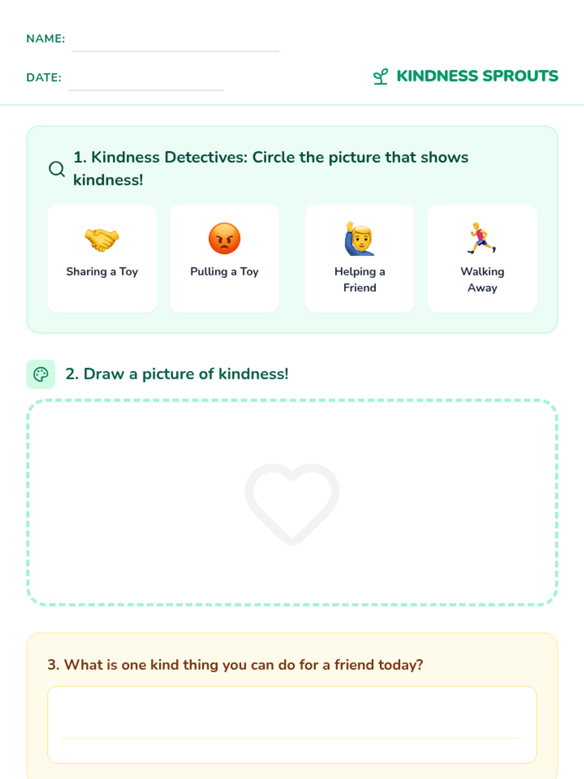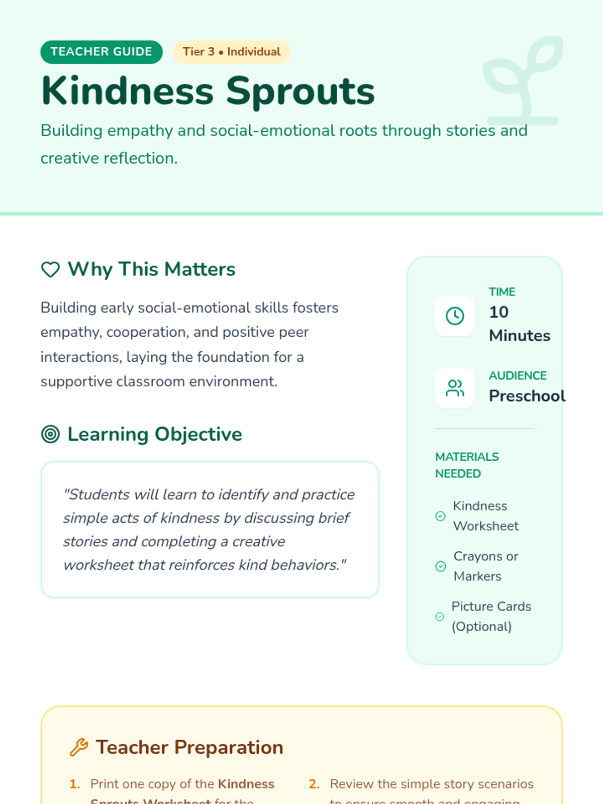 A short, 10-minute individual session for preschoolers to learn about kindness through stories and drawing. Students identify kind acts and reflect on how they can be kind to others.