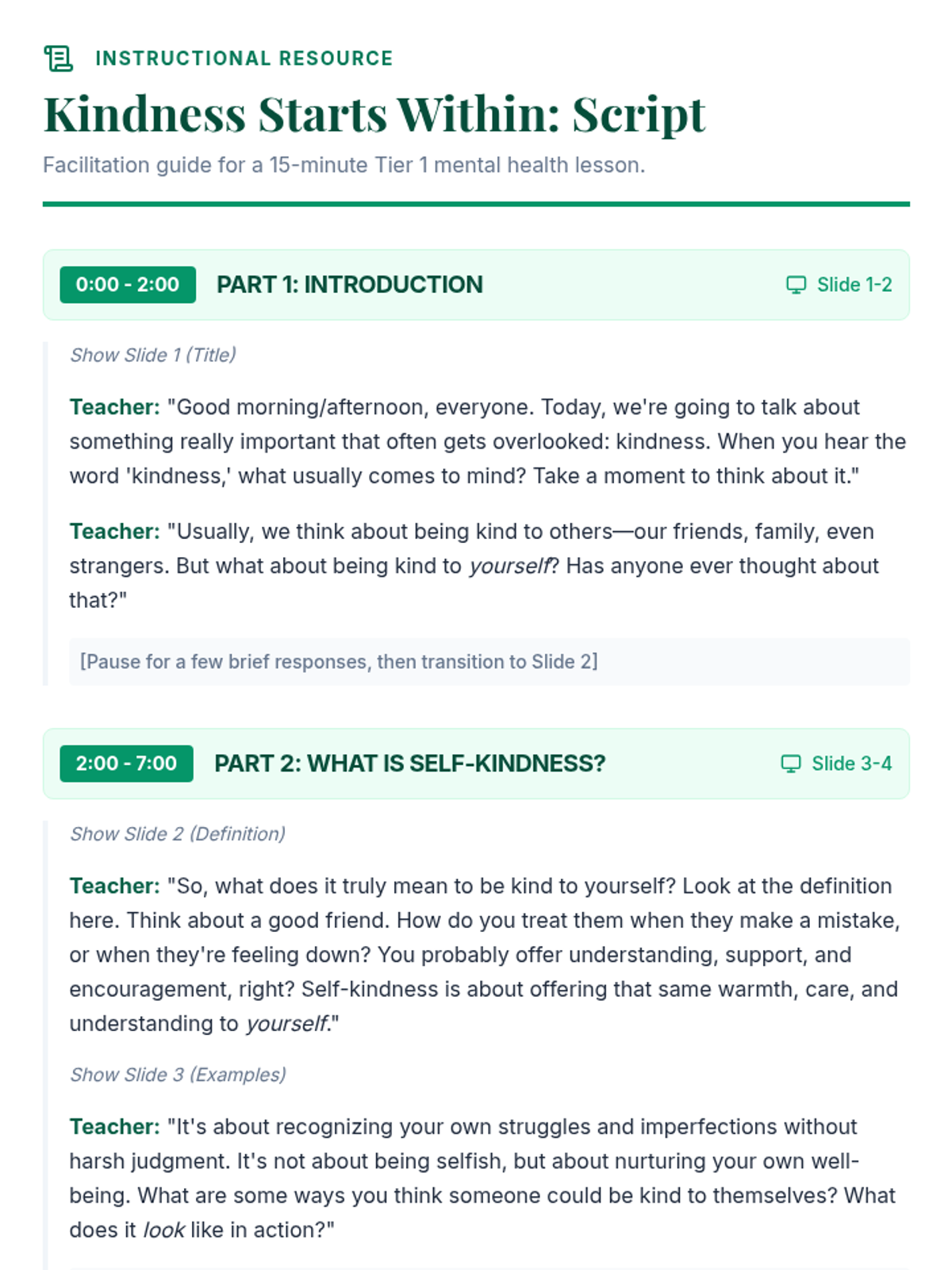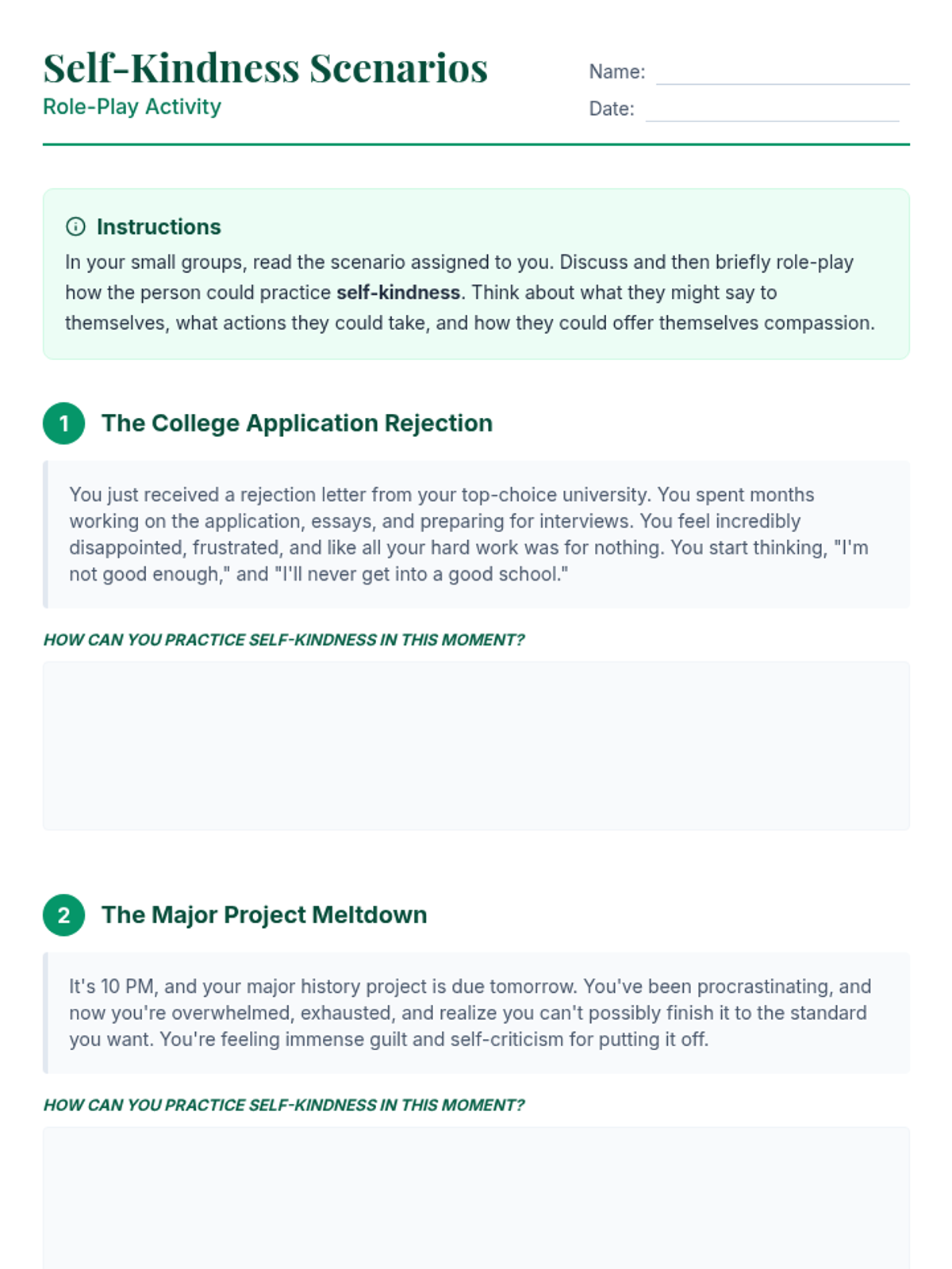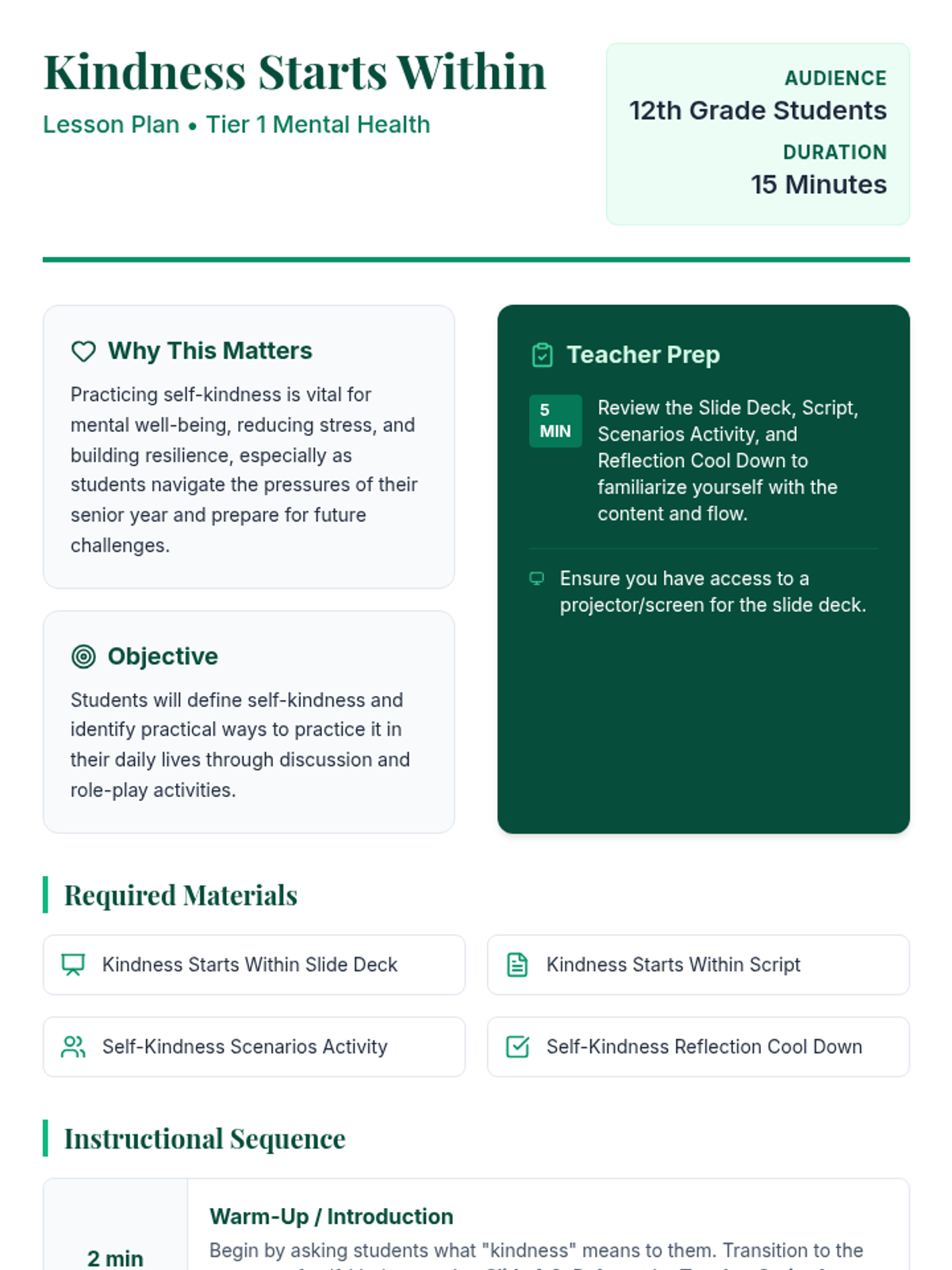 A 15-minute Tier 1 lesson for 12th graders focused on understanding and practicing self-kindness through discussion and role-playing to support mental health and resilience.