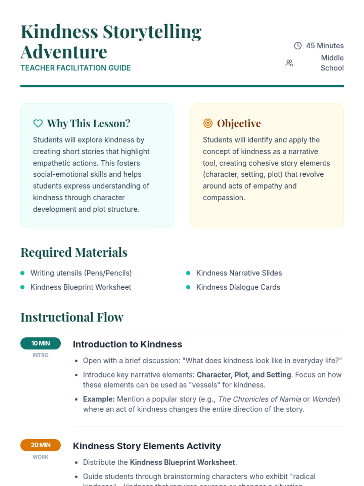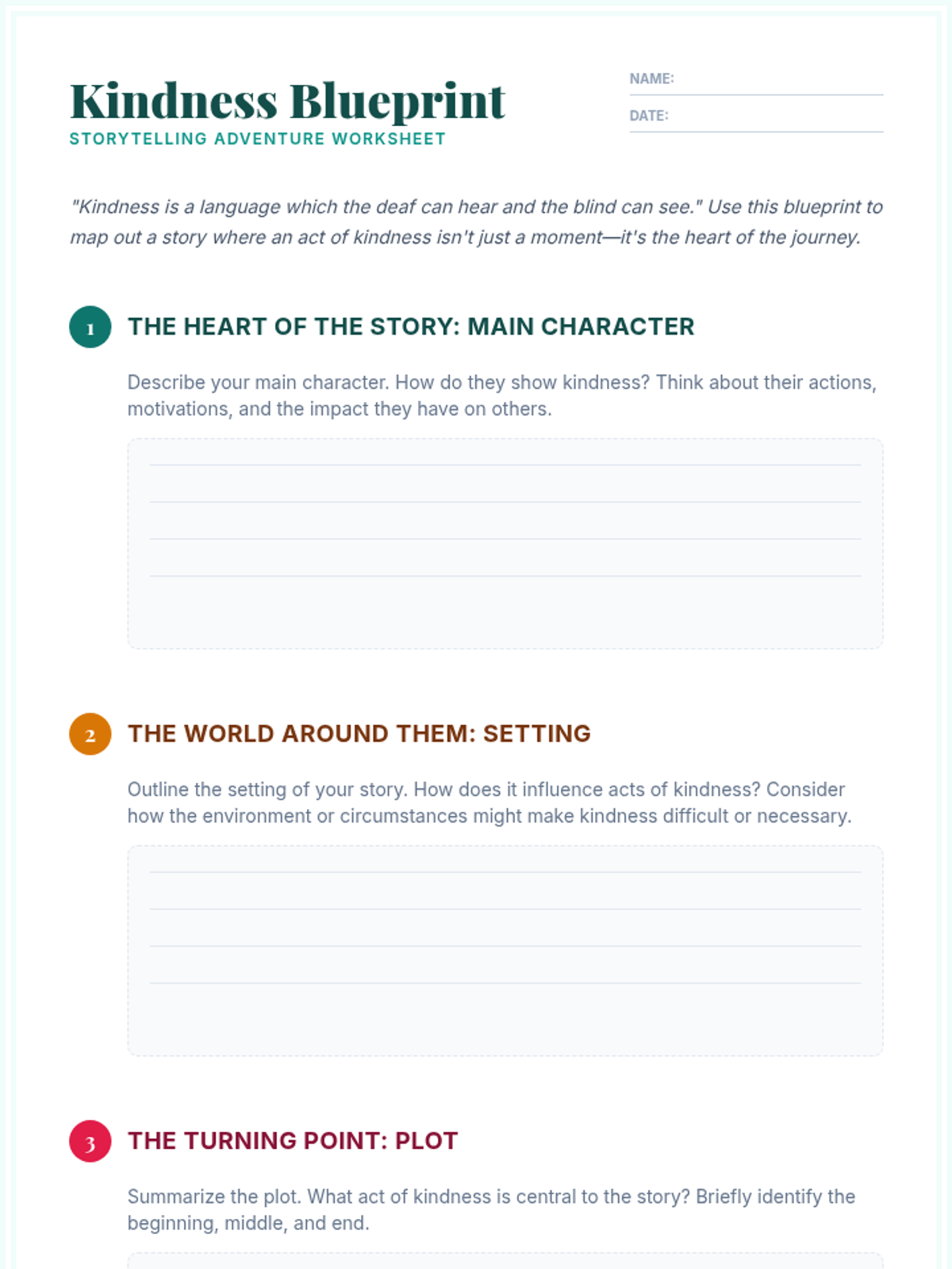 Students explore the power of empathy through creative writing, learning to weave acts of kindness into character development and plot structure to create meaningful narratives.