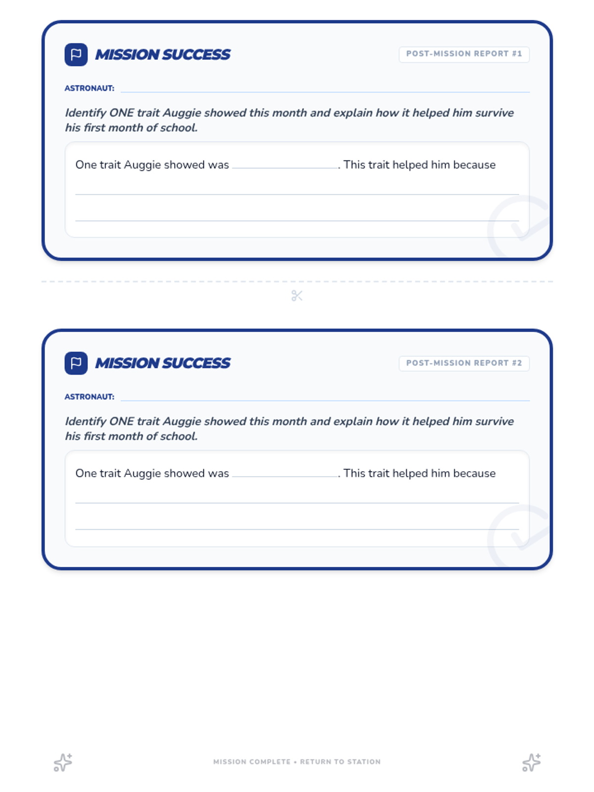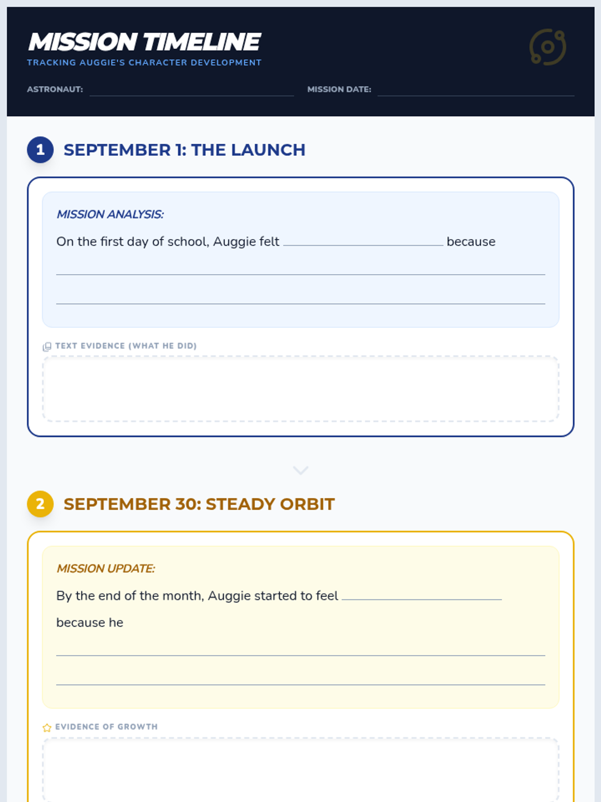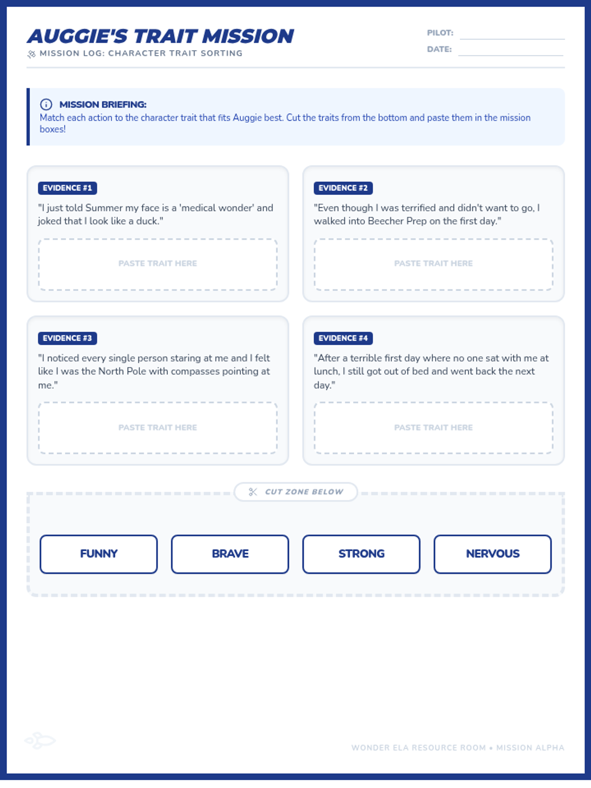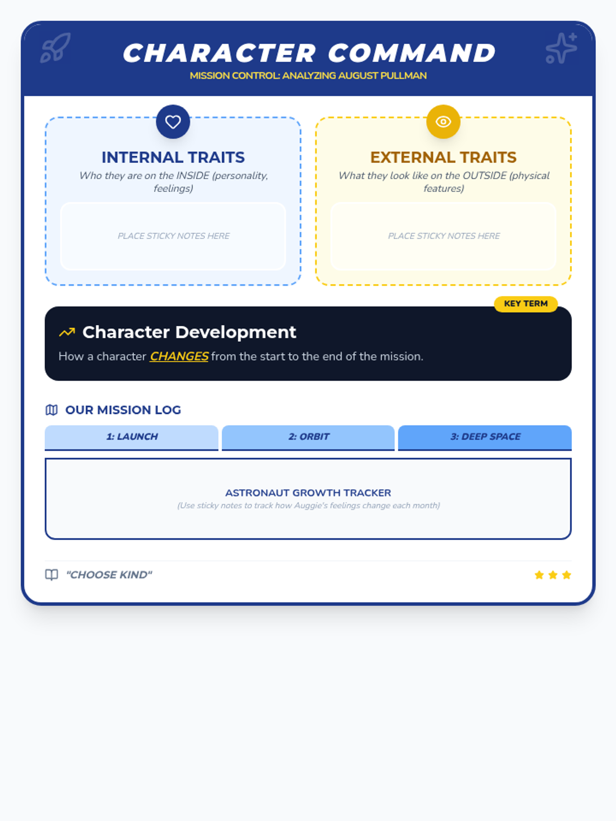 A mini-lesson for a 6th-grade resource room ELA class focusing on Auggie's character traits and his development throughout the first month of school in the novel 'Wonder'. This lesson uses a space-exploration theme and provides high levels of scaffolding.