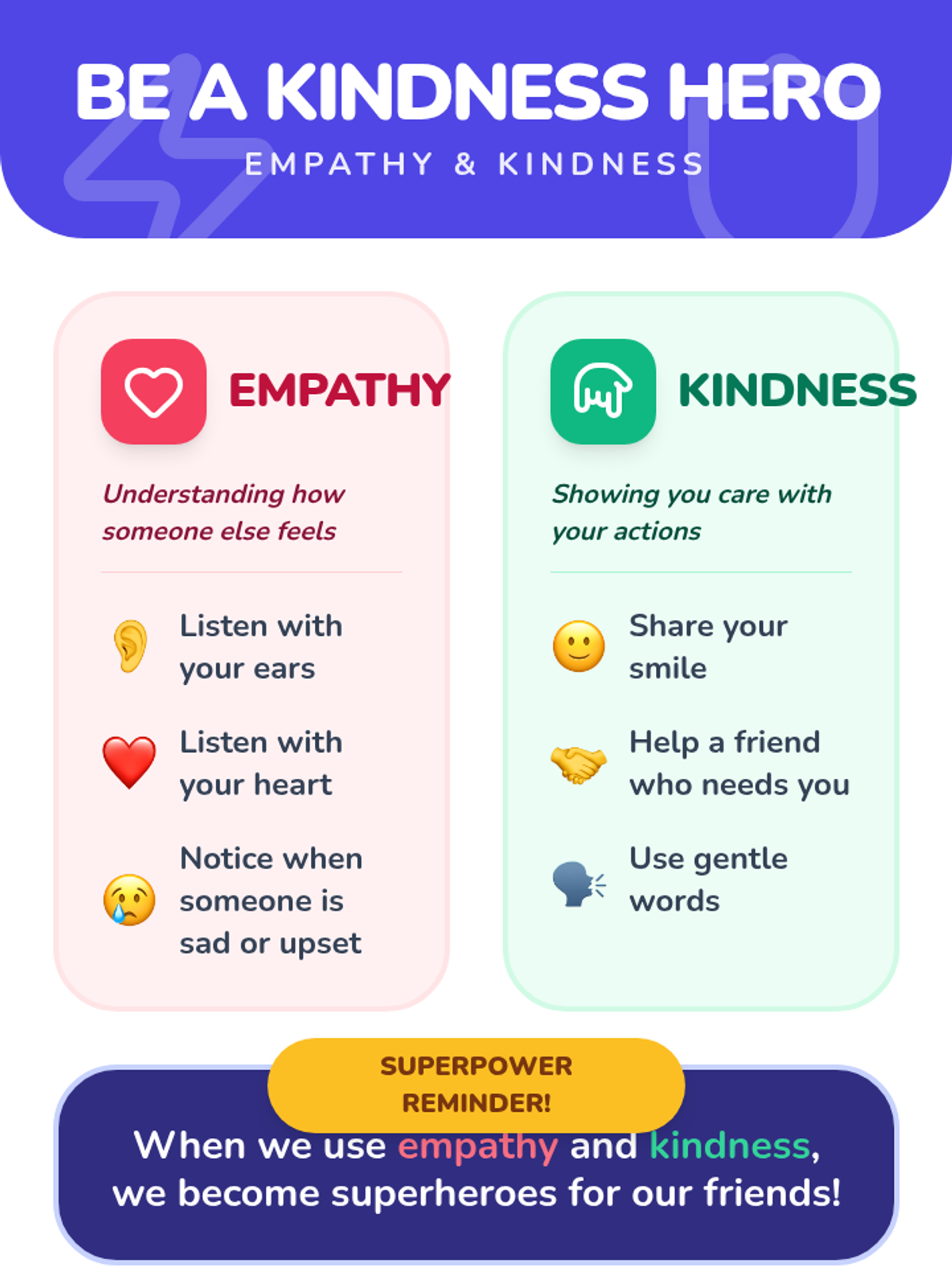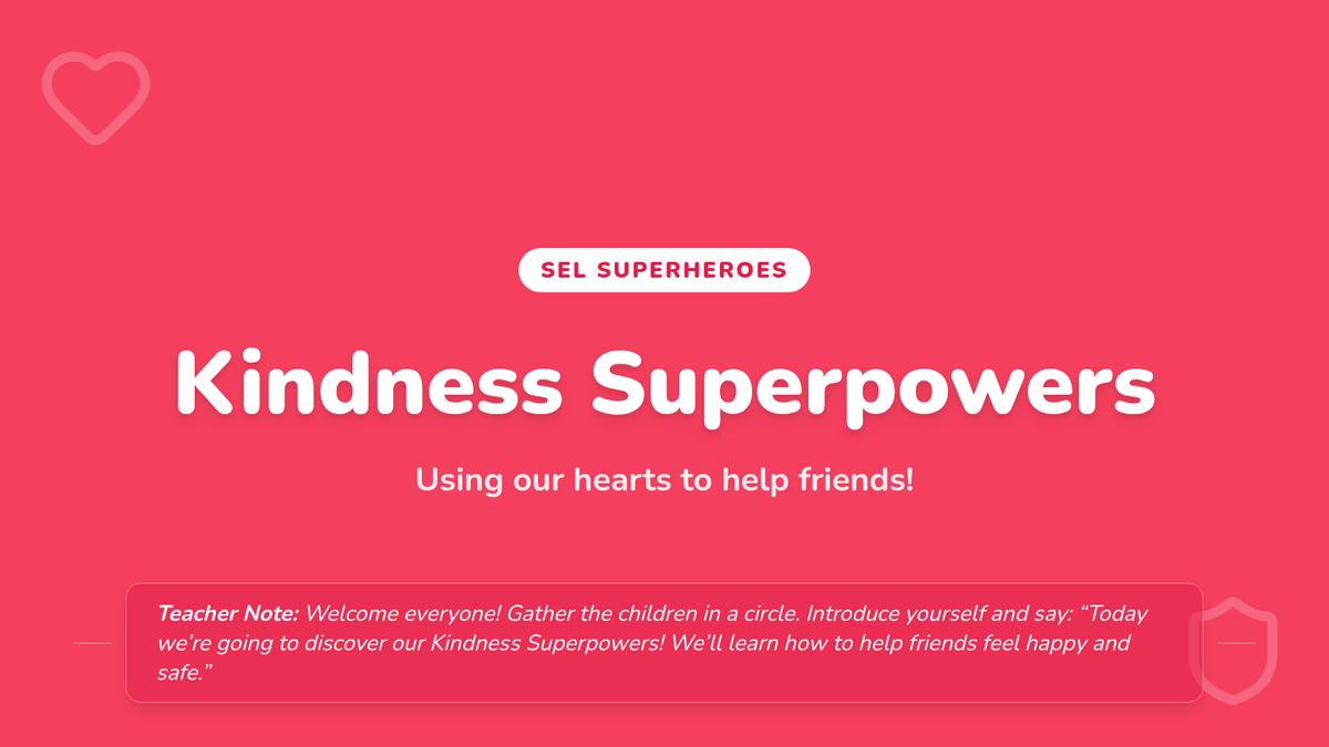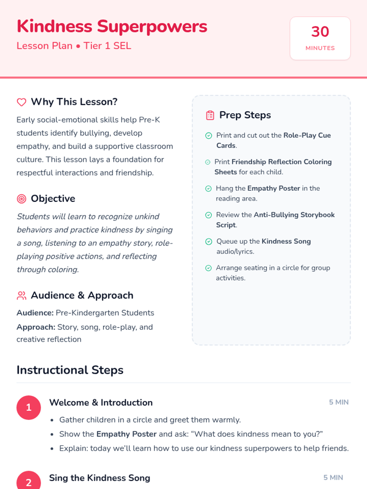Pre-K students will learn to recognize bullying, practice kindness, and stand up for friends through engaging stories and activities in this single 30-minute Tier 1 session designed to build empathy and social skills.