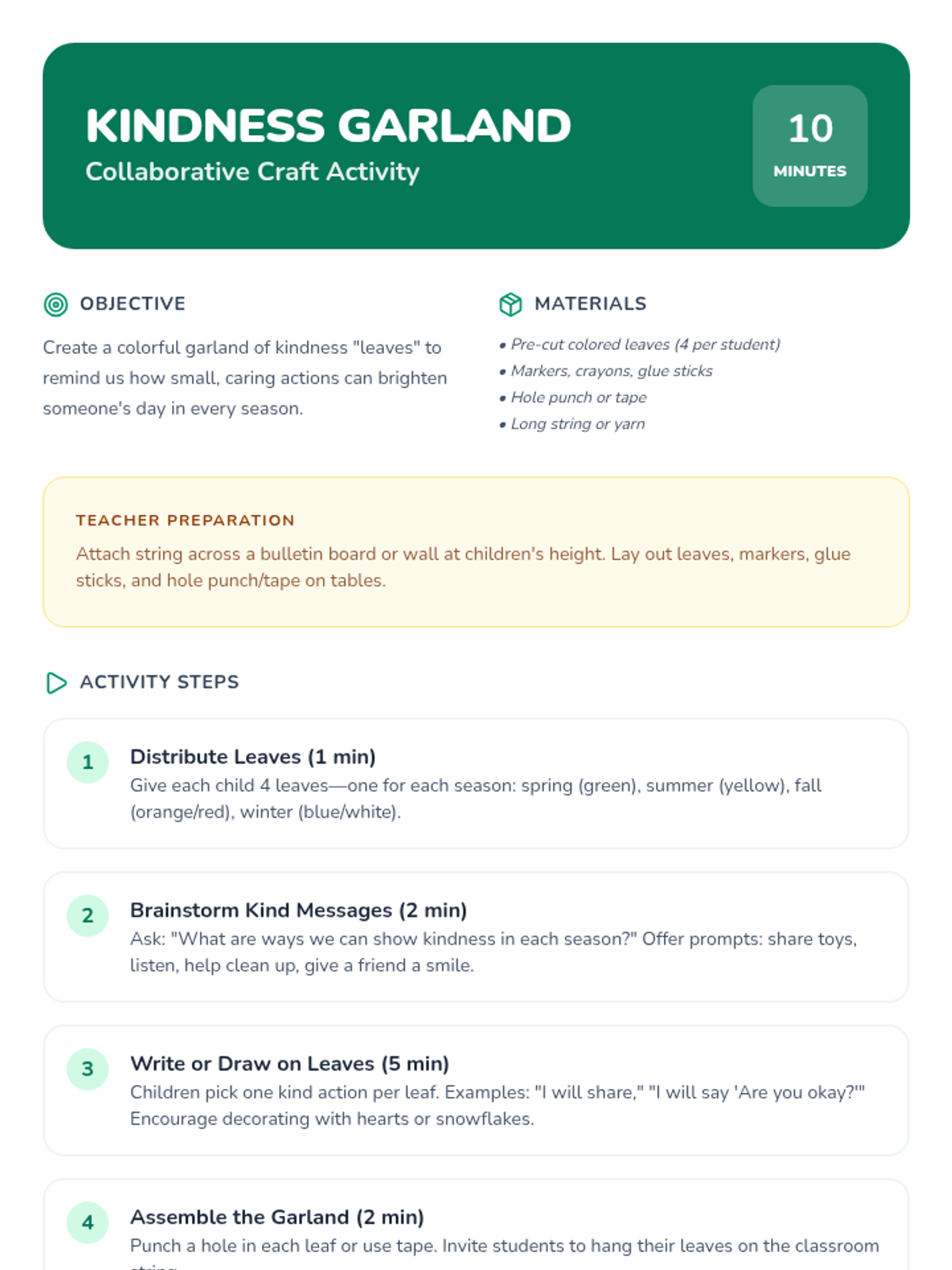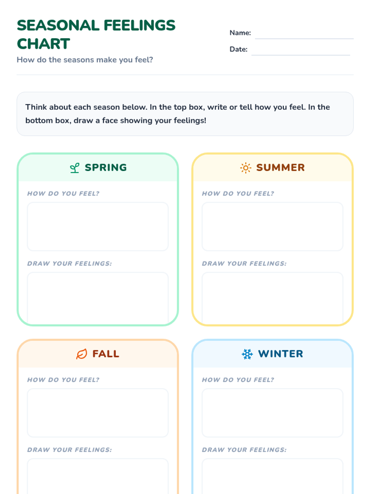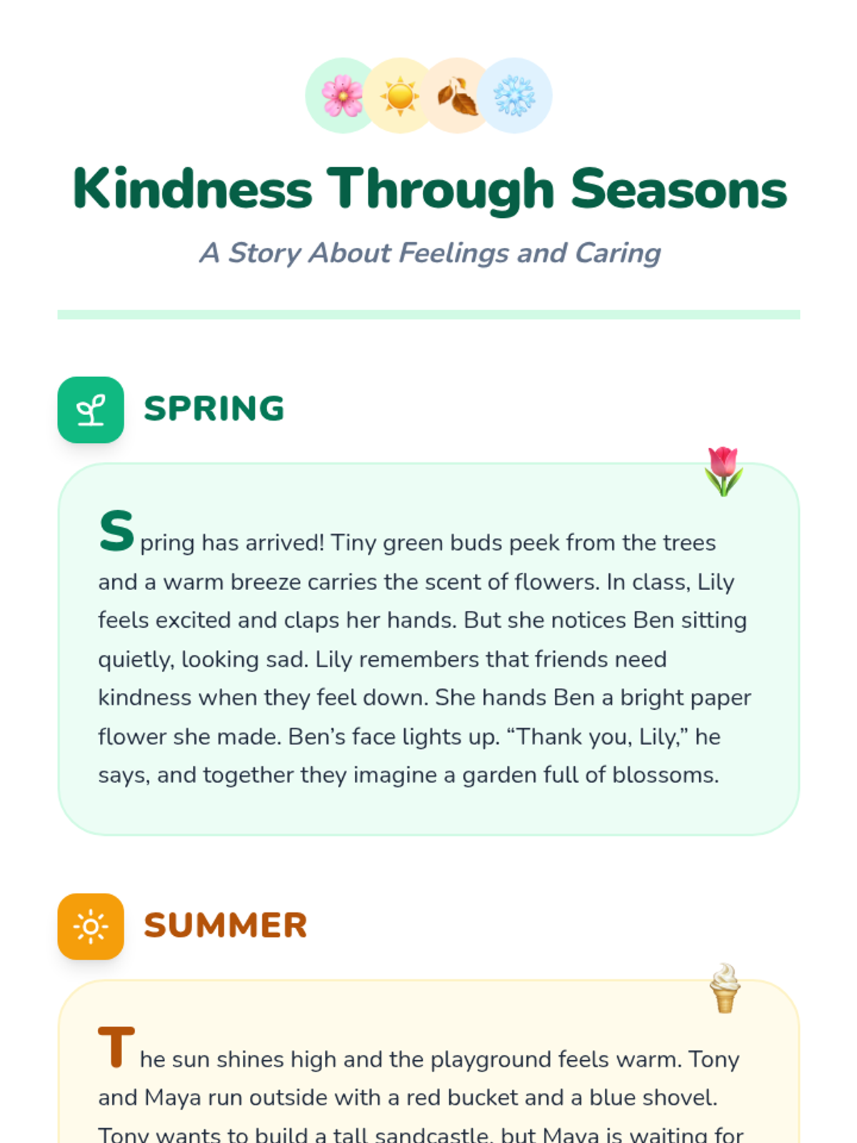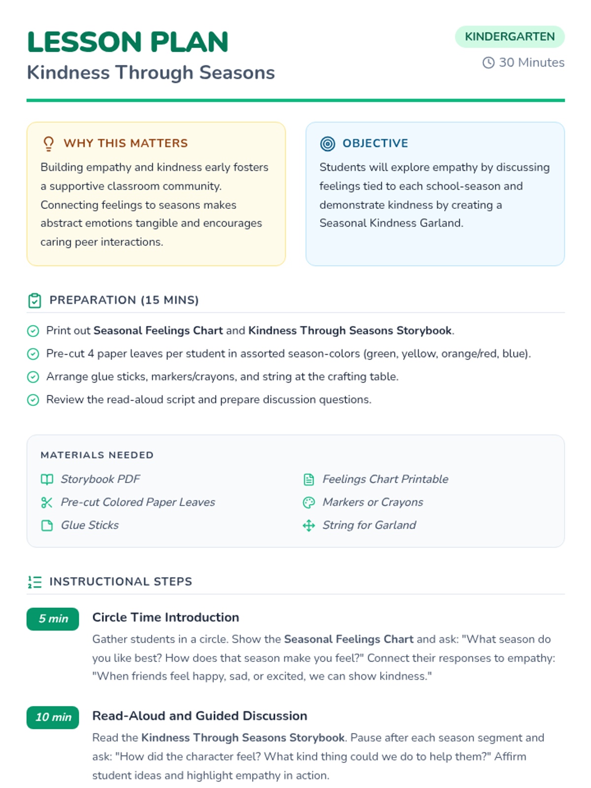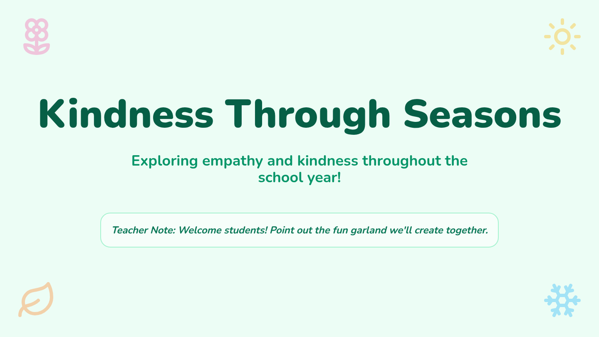 A 30-minute Kindergarten lesson exploring empathy and kindness by connecting emotions to the four seasons through story, discussion, and a collaborative craft.