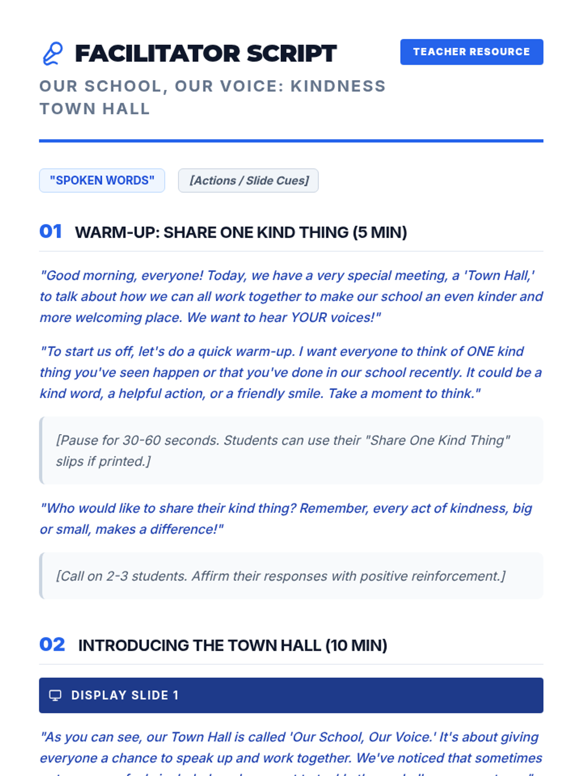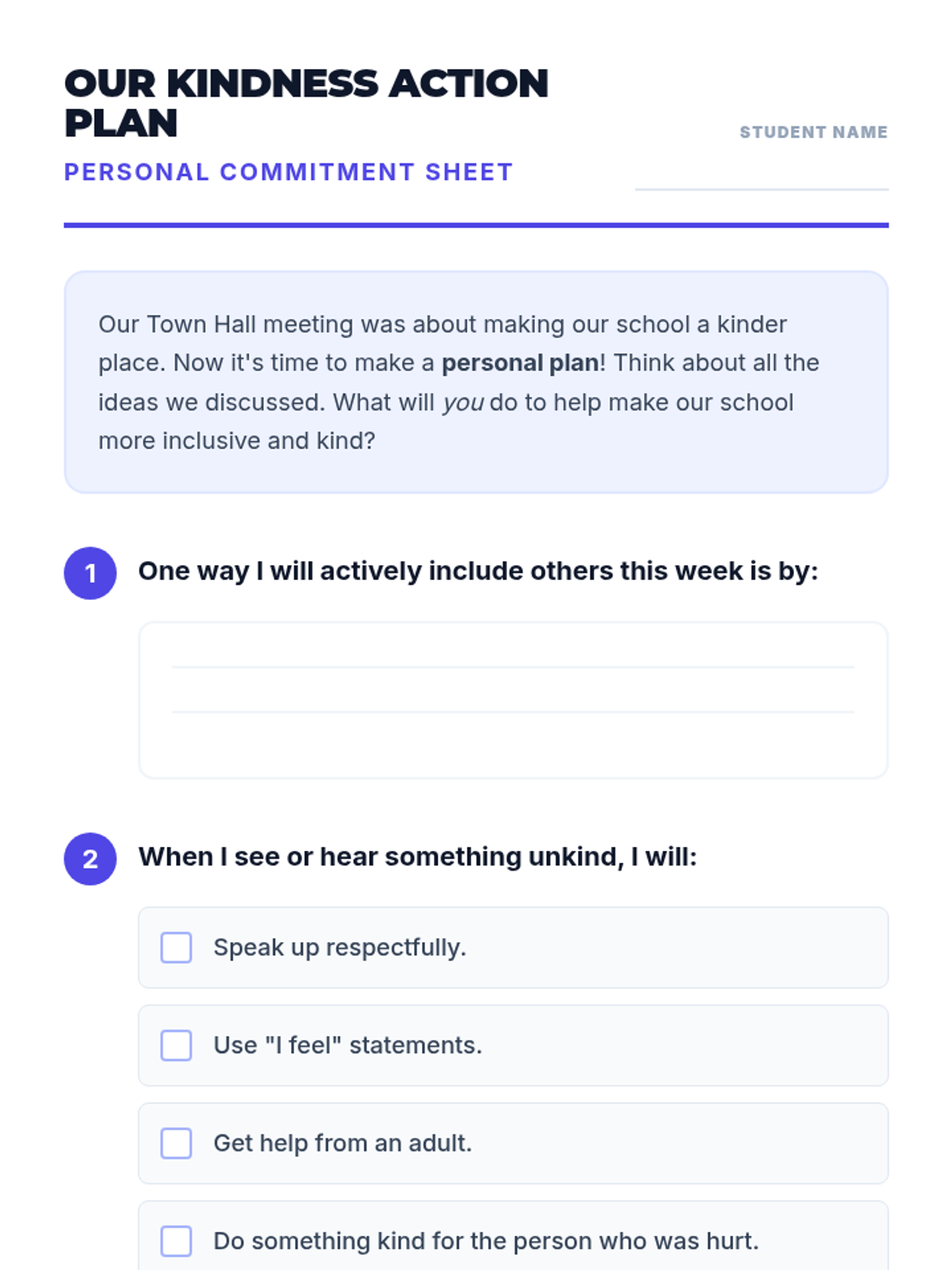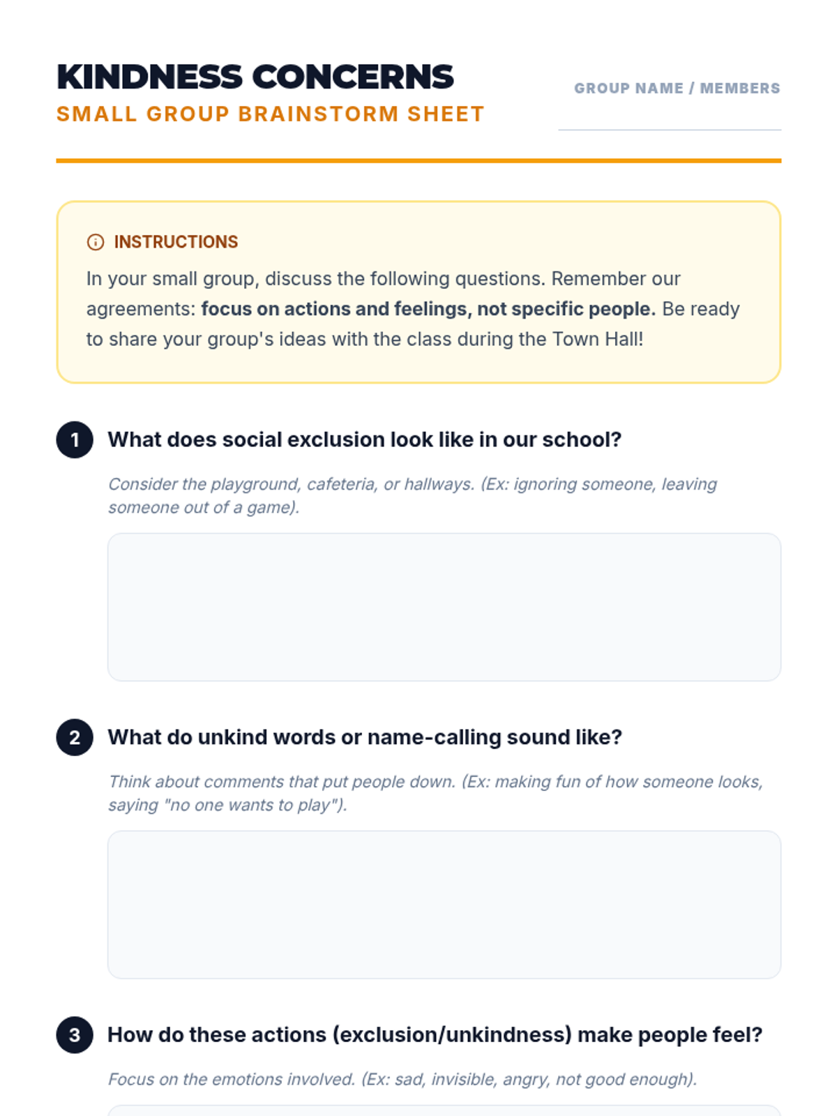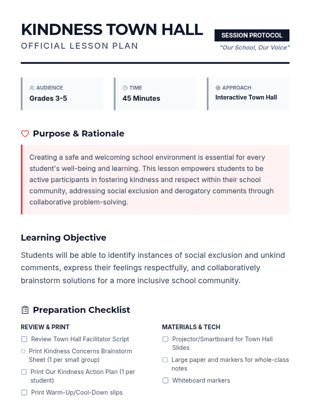 A Tier 1 classroom lesson designed to empower students to address social exclusion and unkindness through a collaborative 'Town Hall' format. Students identify challenges, brainstorm solutions, and make personal commitments to foster a more inclusive school community.