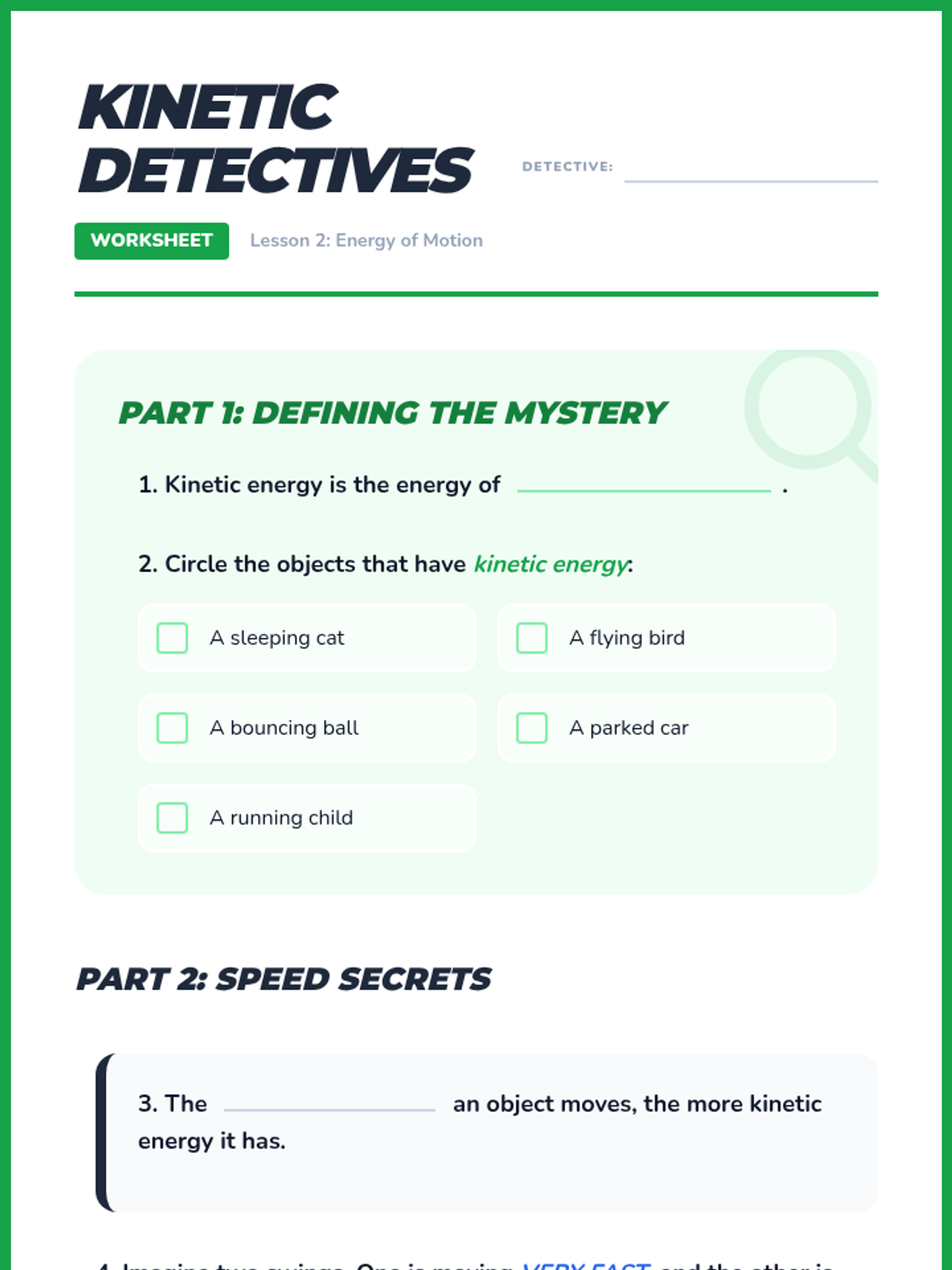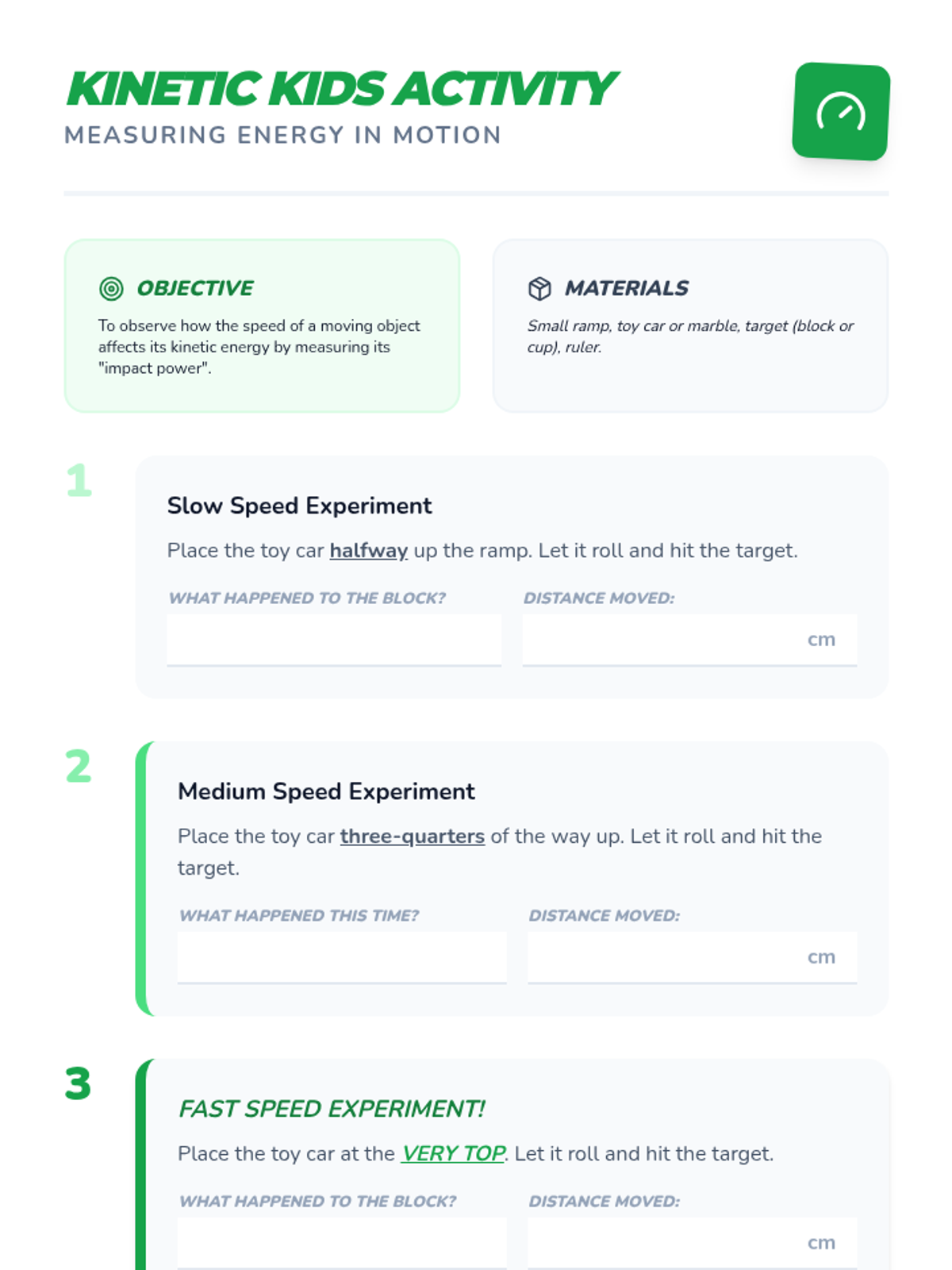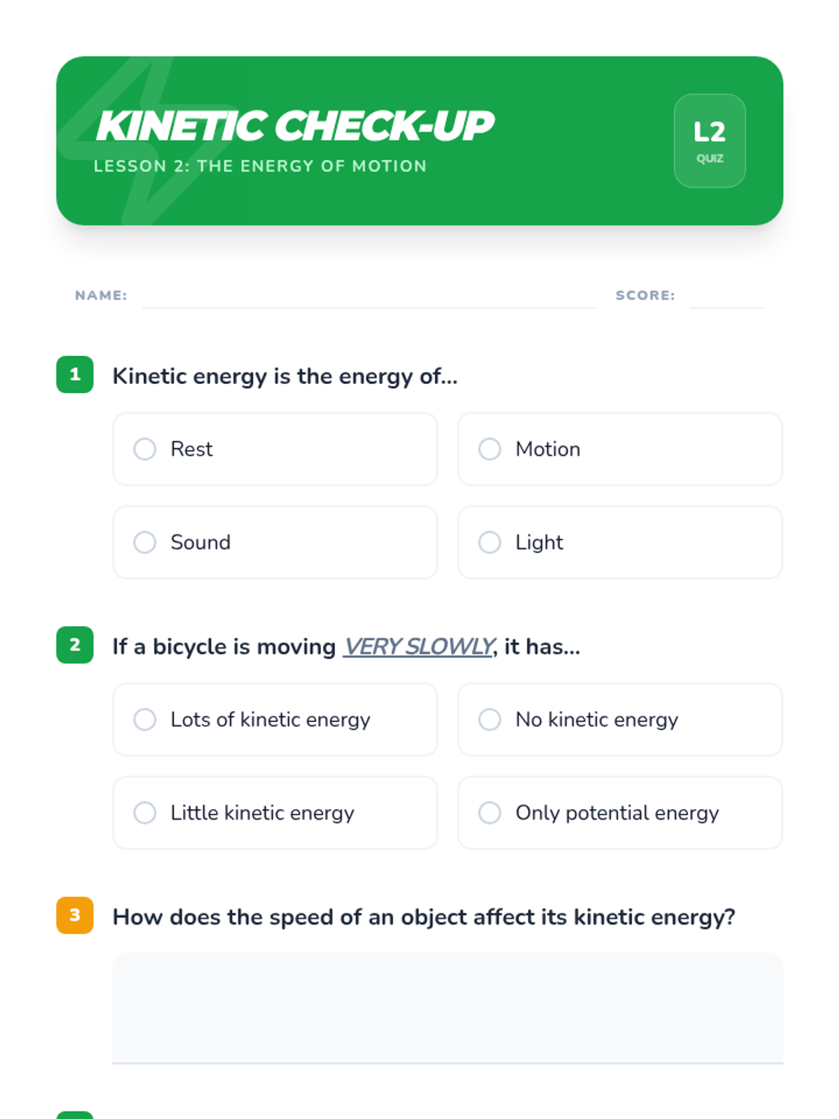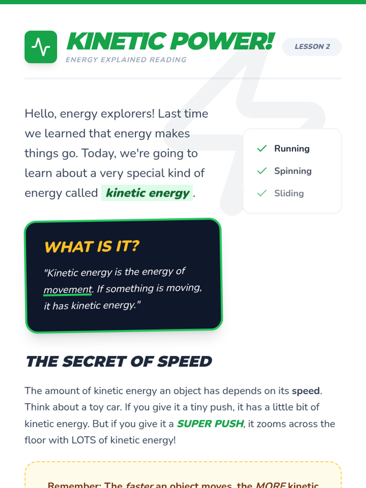 An exploration of kinetic energy, the energy of motion, and how speed affects the amount of energy an object has.