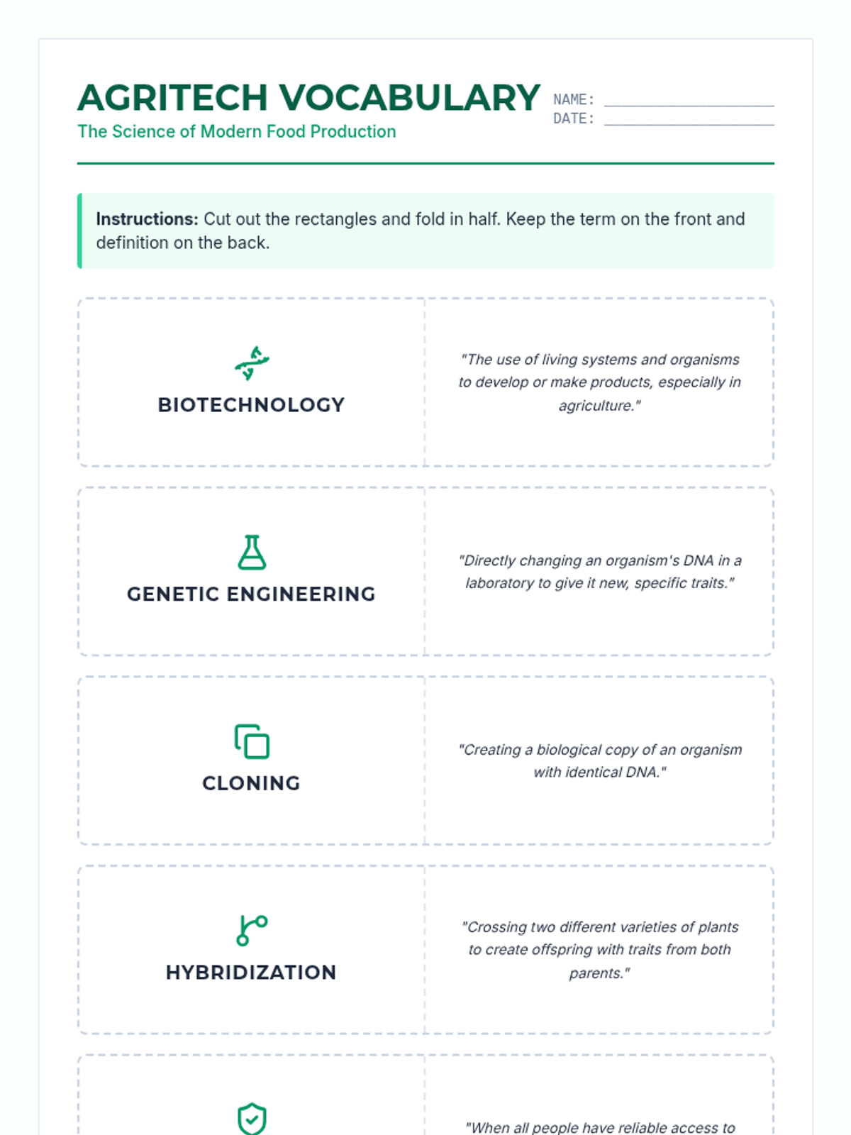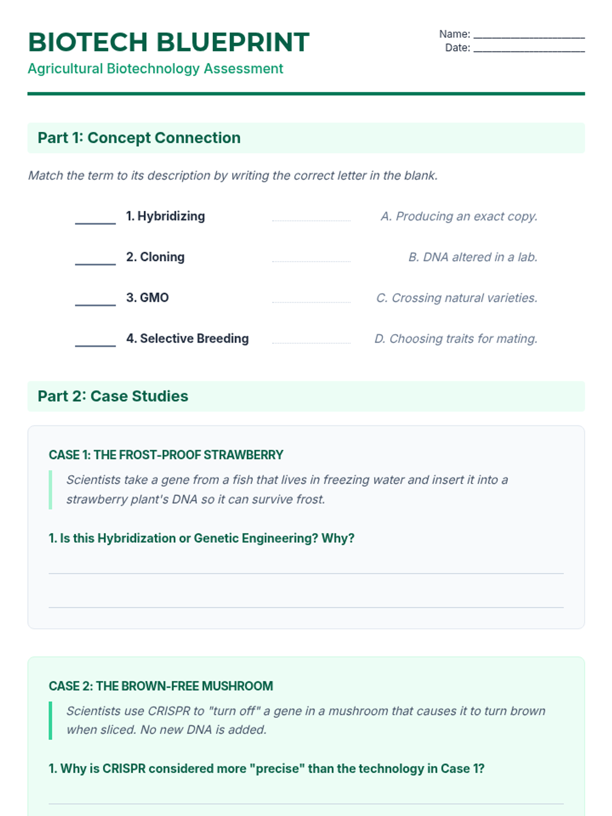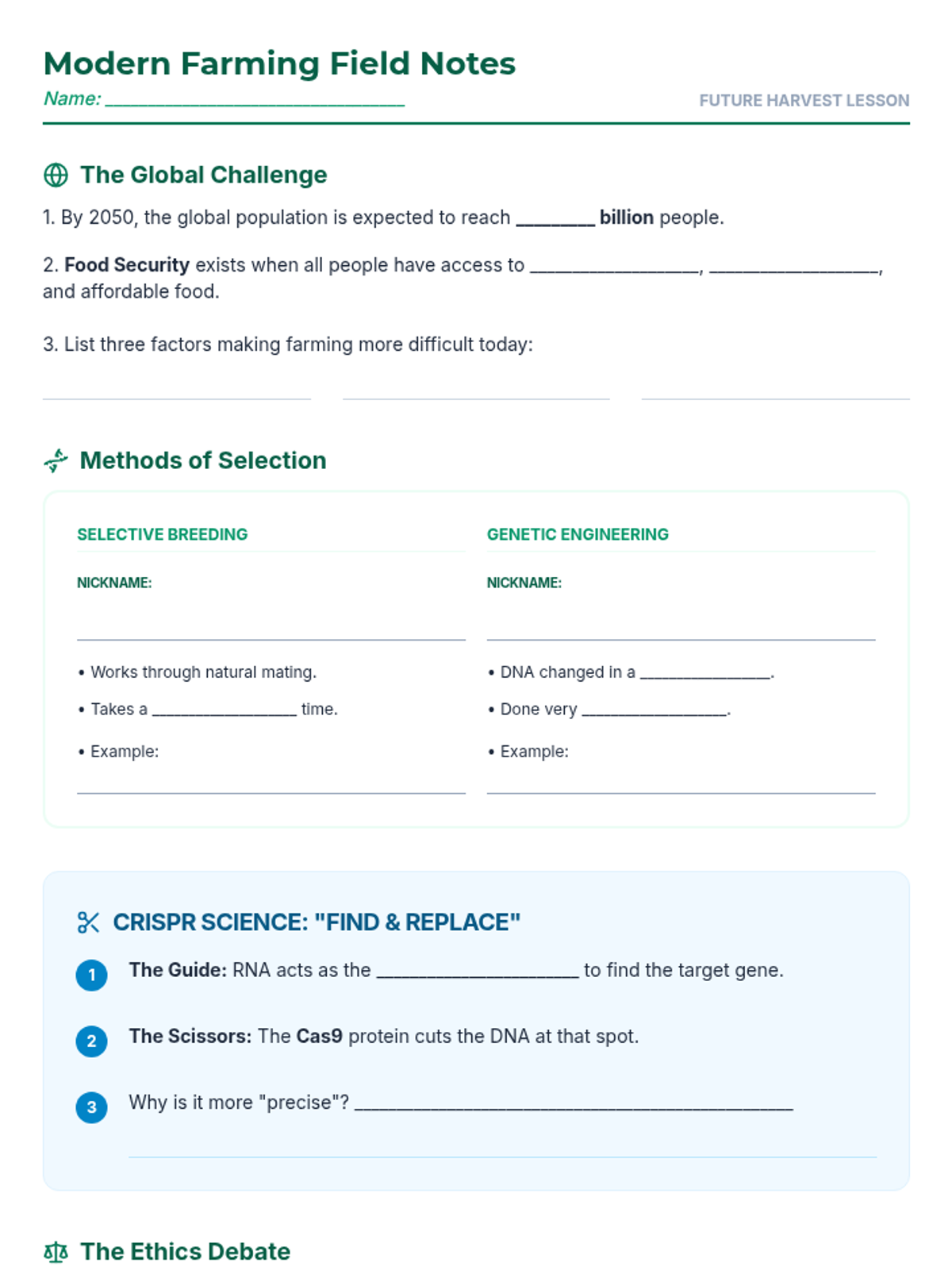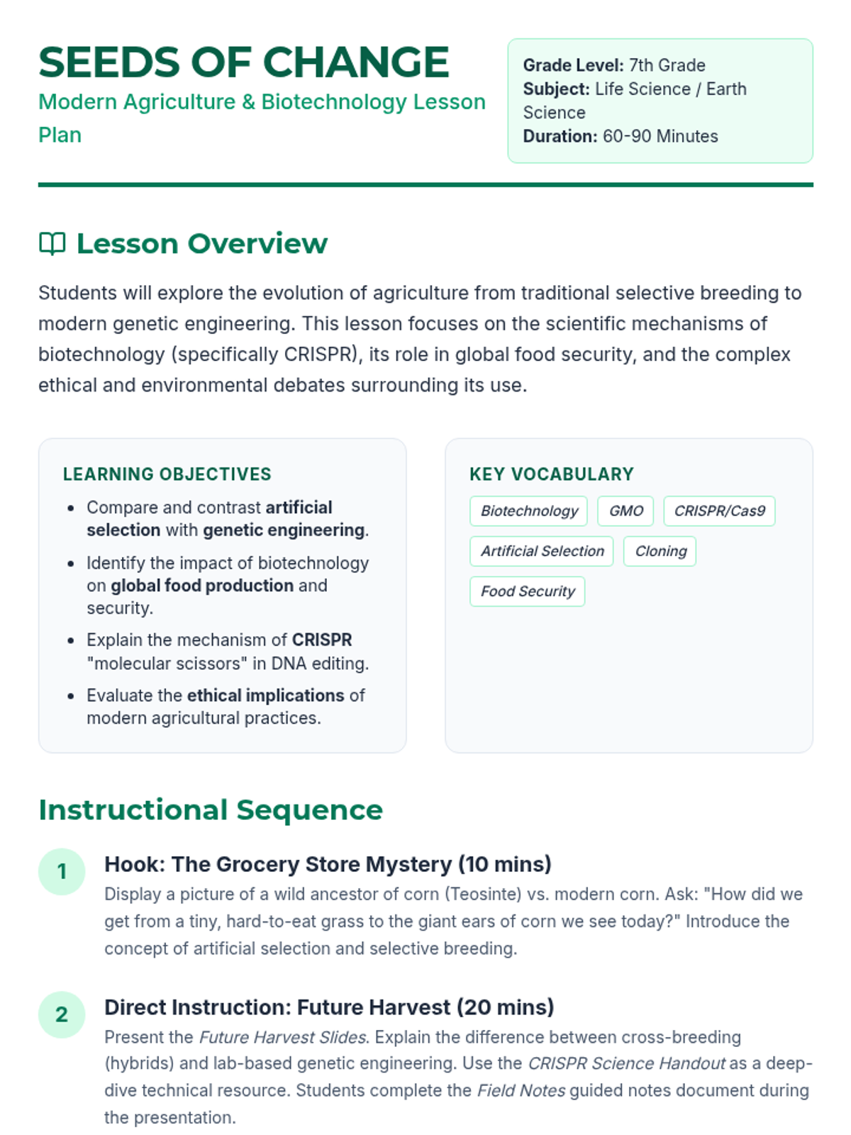 A comprehensive lesson exploring the science, ethics, and environmental impact of biotechnology in modern agriculture, comparing historical breeding methods with genetic engineering.
