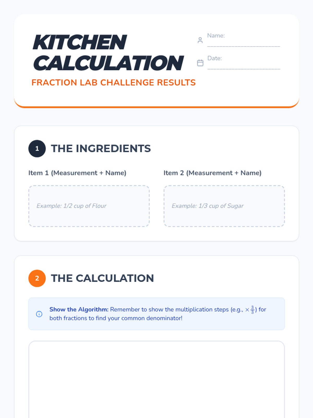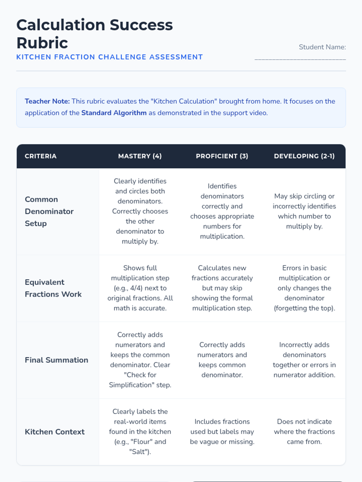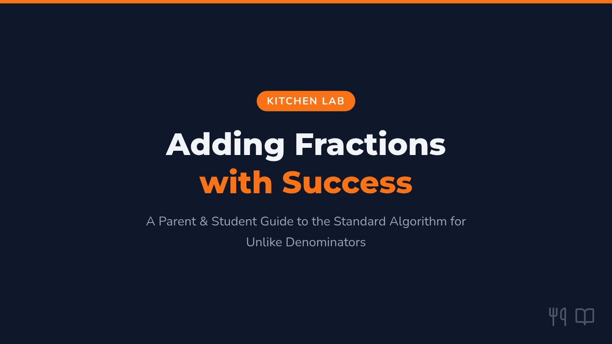 A home-support lesson designed to bridge the gap between classroom instruction and home practice. Parents and students work together on a 'Kitchen Fraction Challenge' to practice the standard algorithm for adding fractions with unlike denominators.