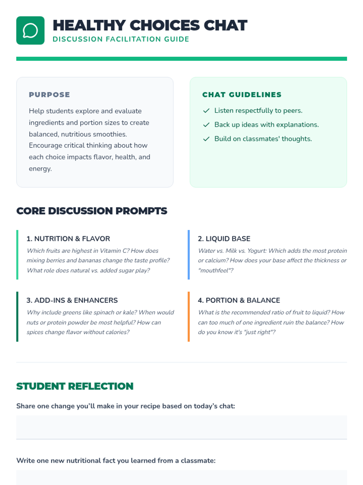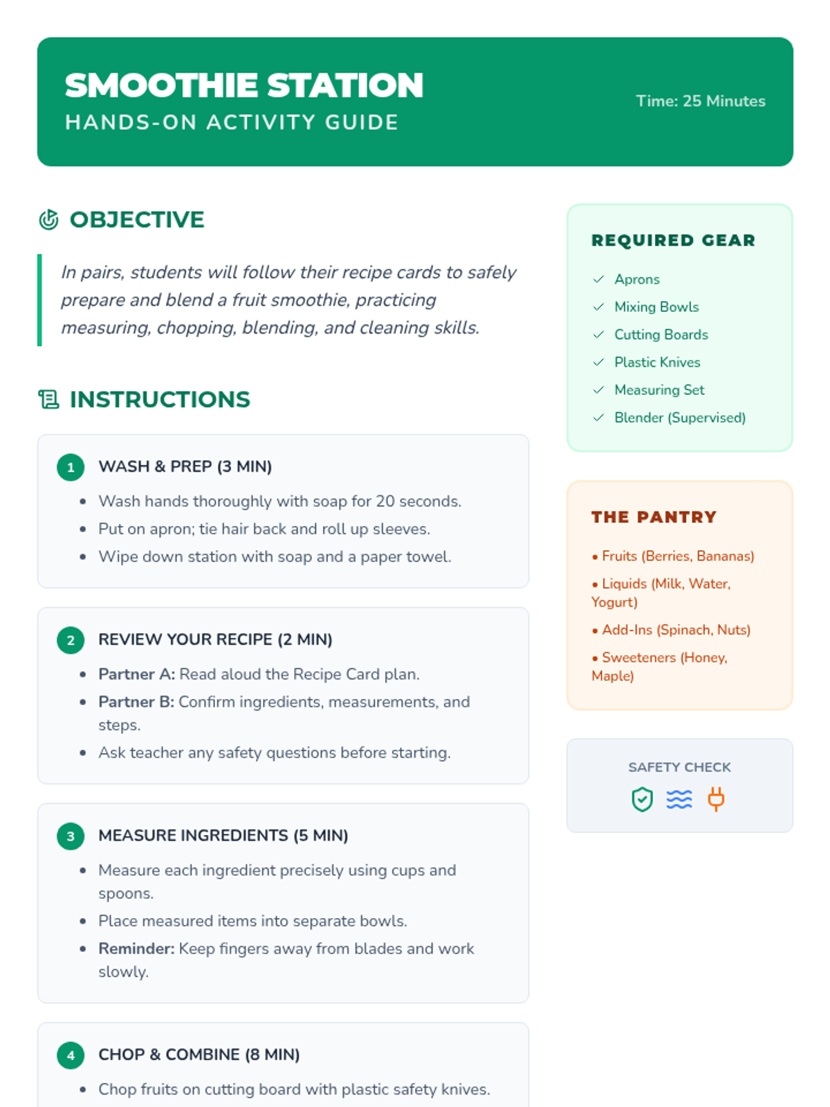 A hands-on introduction to kitchen safety, hygiene, and healthy meal planning through the creation of nutritious smoothies. Students will learn essential life skills while collaborating in a kitchen environment.
