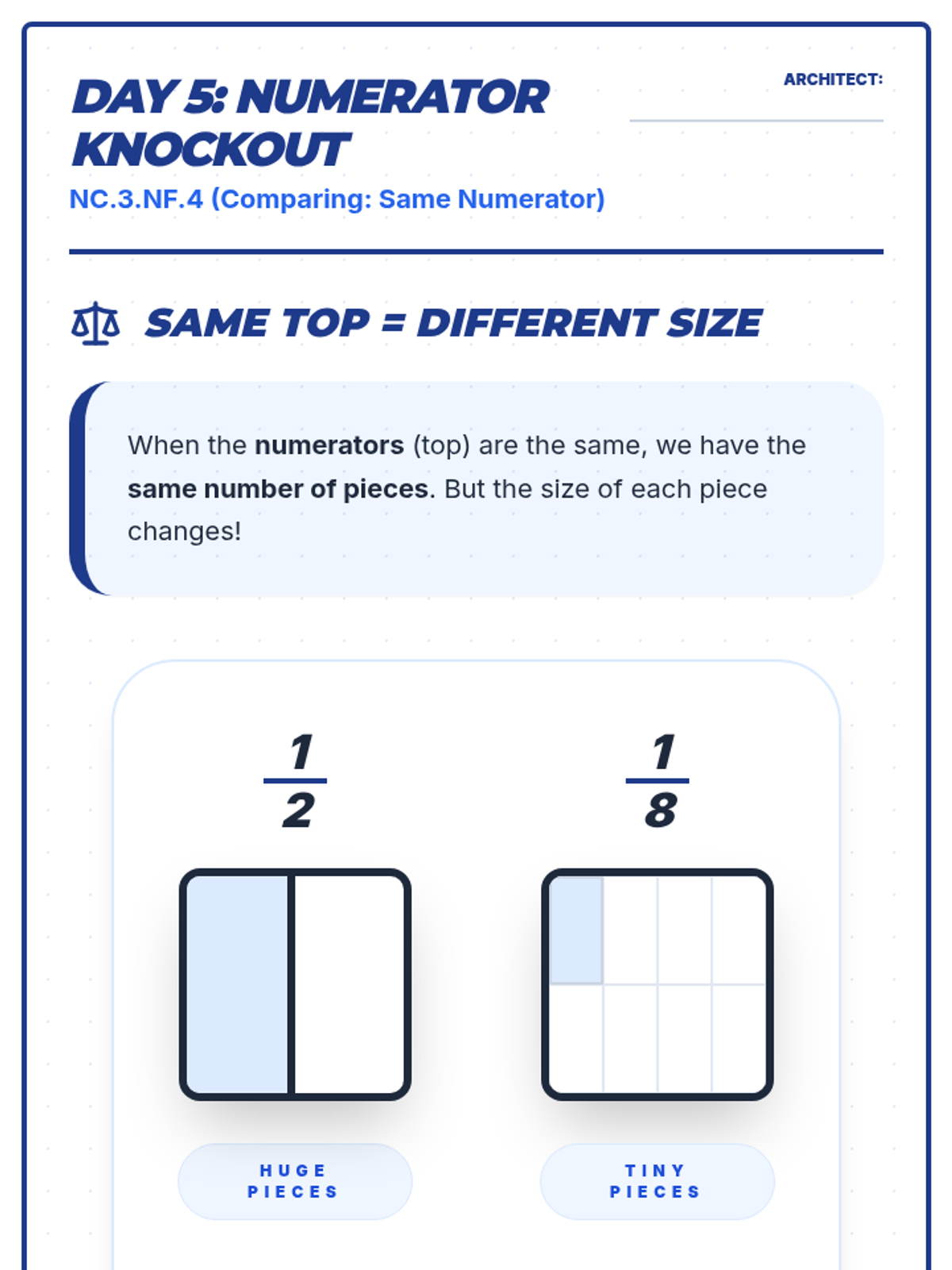 Teaches comparing fractions with the same denominator using area and length models.