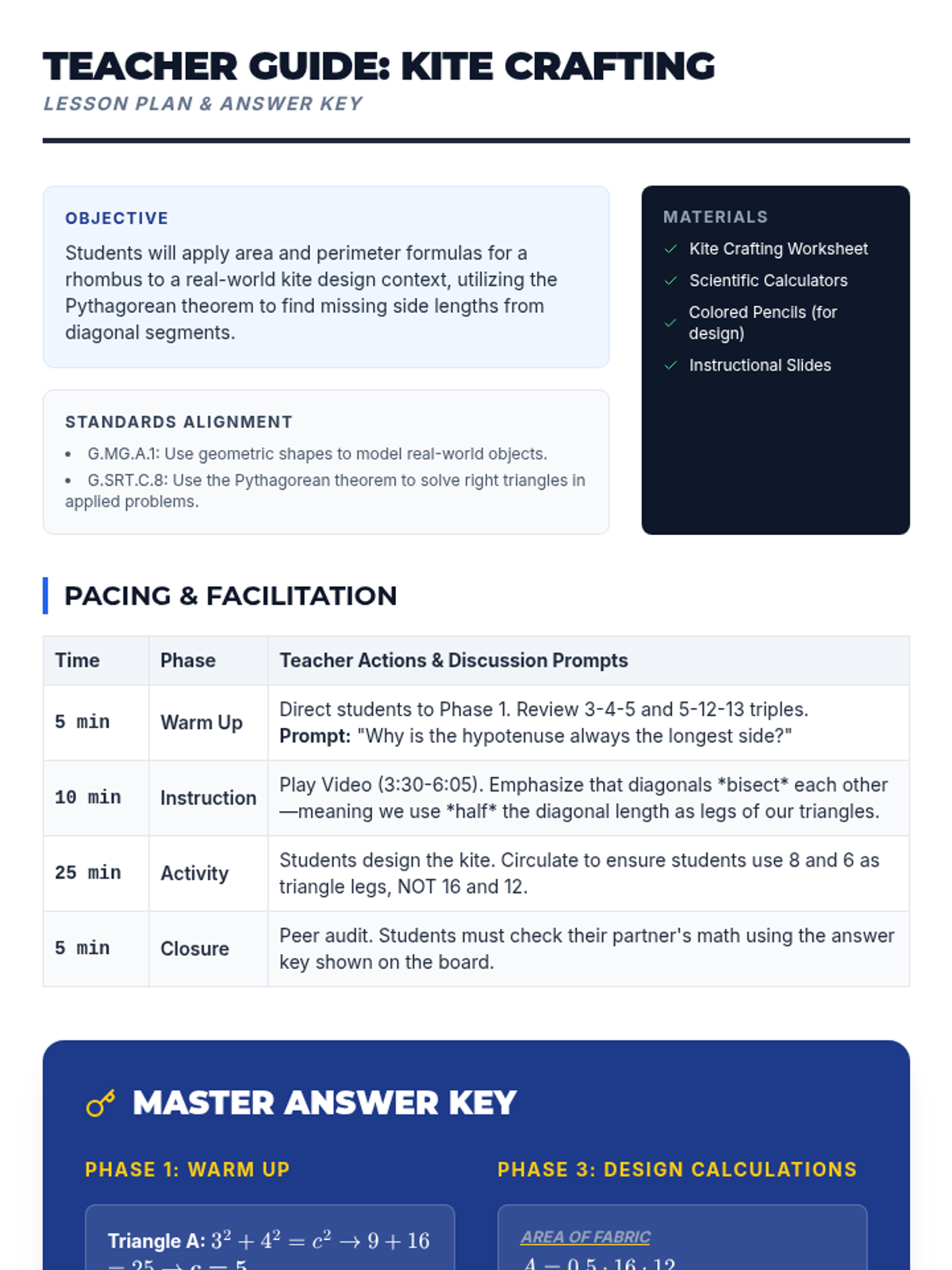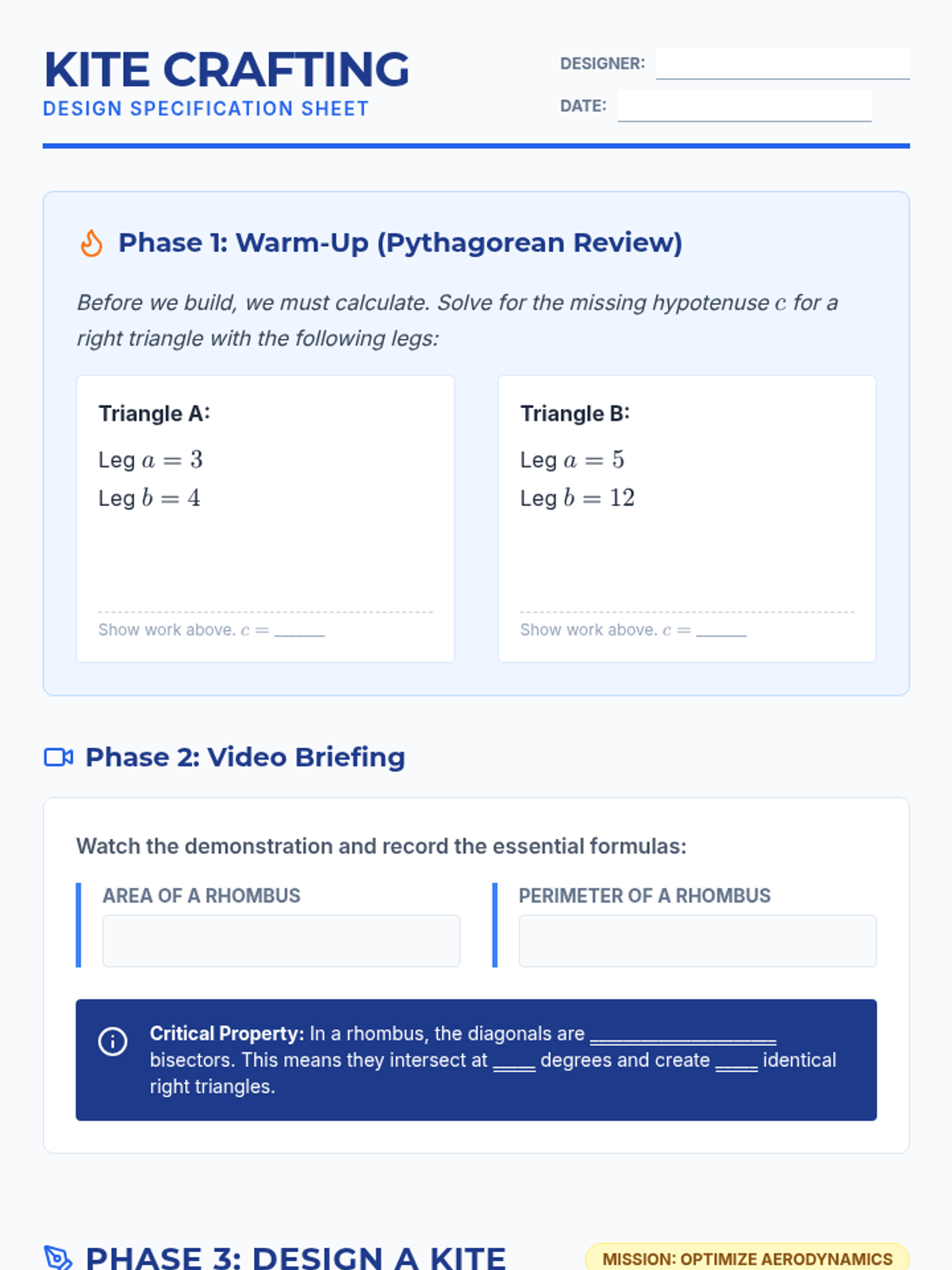 A 9th-grade geometry lesson where students apply rhombus area and perimeter formulas to design a kite, utilizing internal right triangles and the Pythagorean theorem.