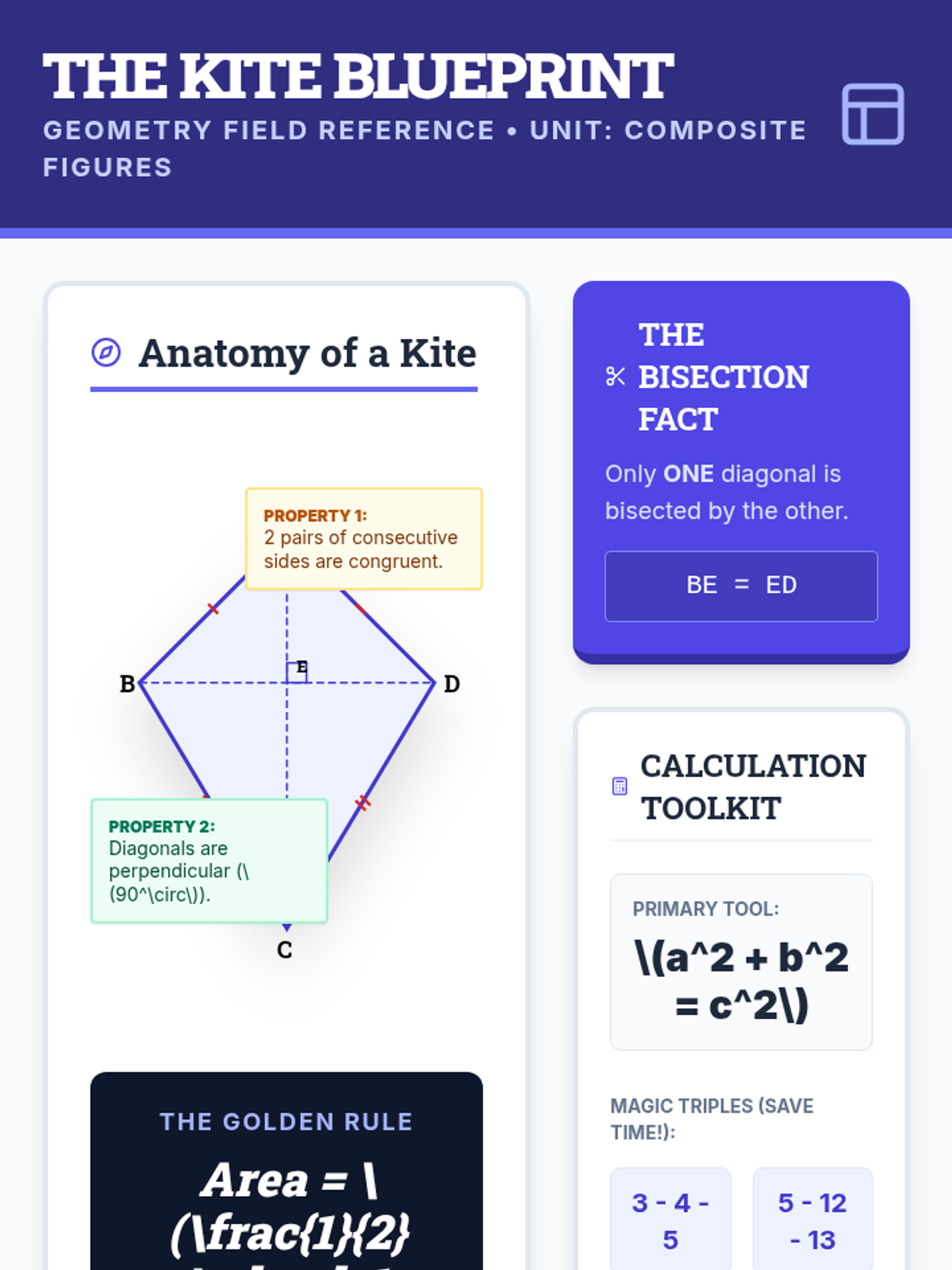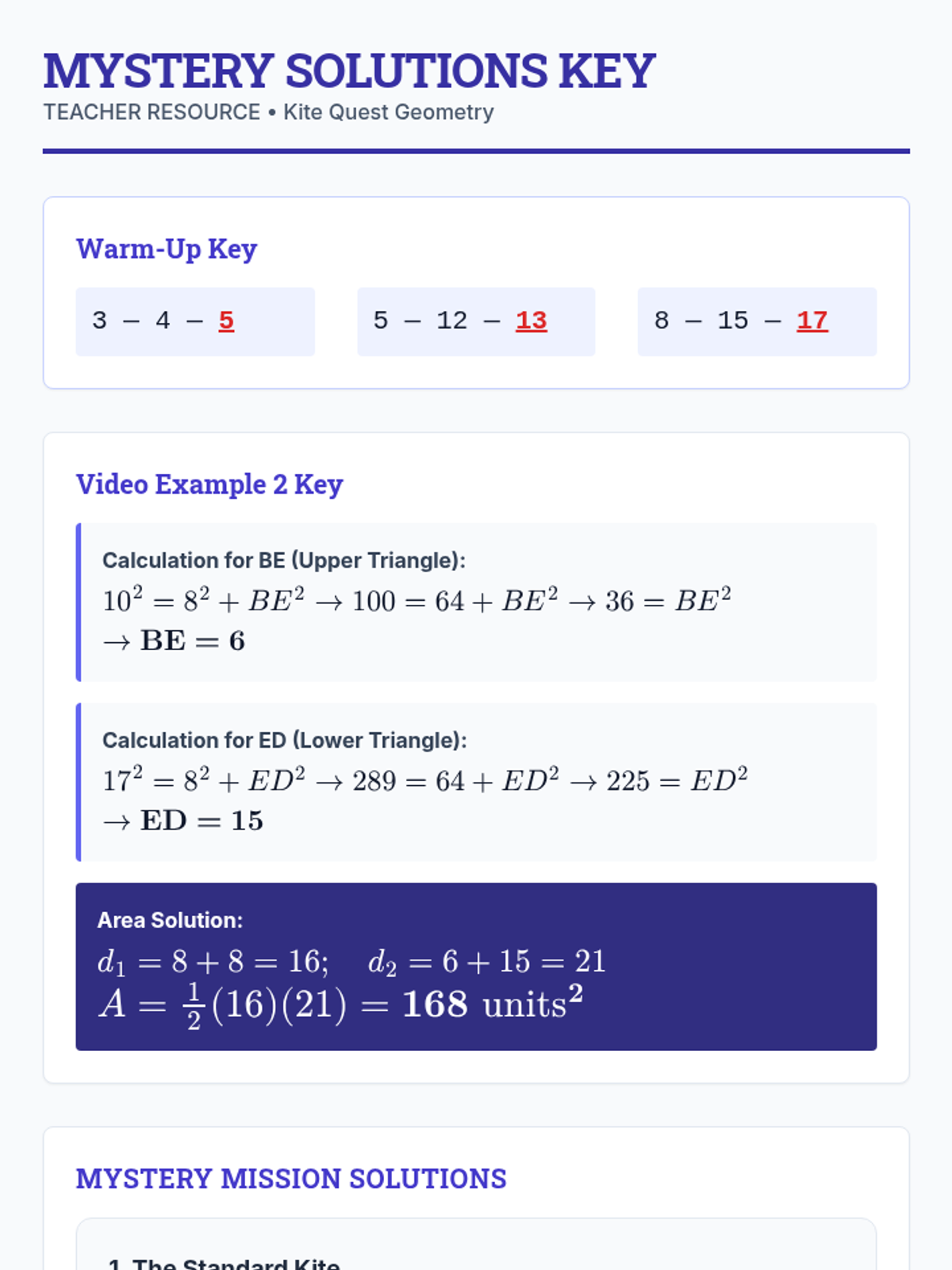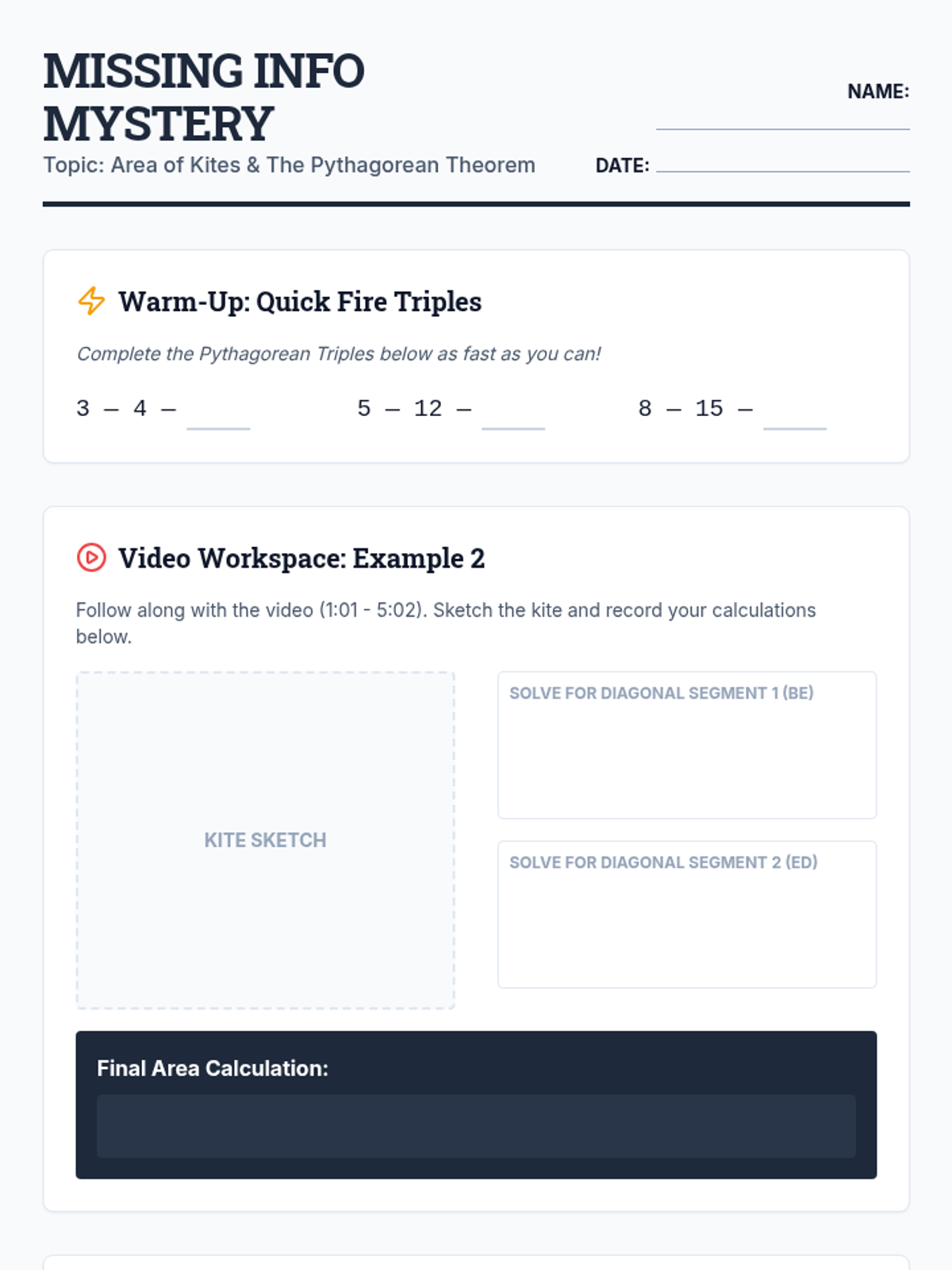 A 10th-grade geometry lesson focusing on applying the Pythagorean Theorem to kites. Students explore the relationship between perpendicular diagonals, right triangles, and area through video analysis and a 'Missing Info Mystery' problem-solving activity.