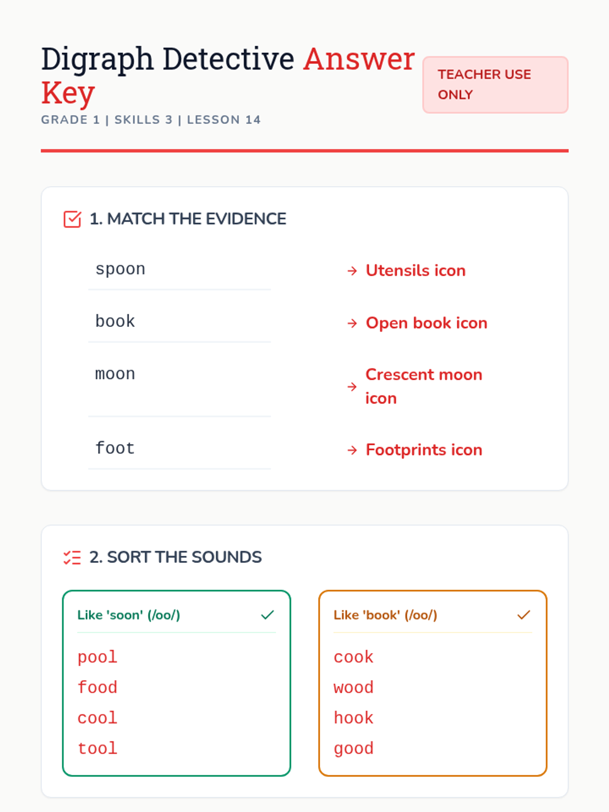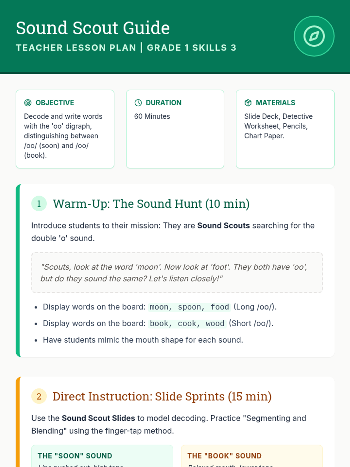 This lesson focuses on decoding and distinguishing between the two sounds of the 'oo' digraph (as in 'soon' and 'book'), including sentence writing practice with target words.