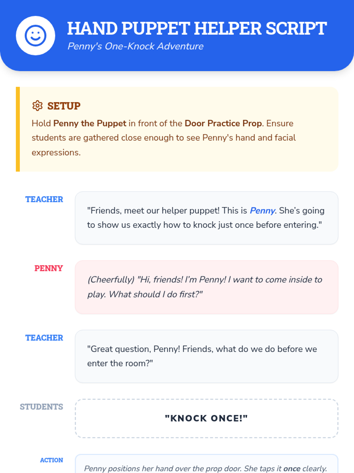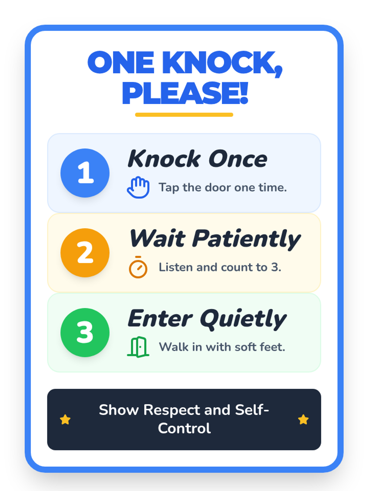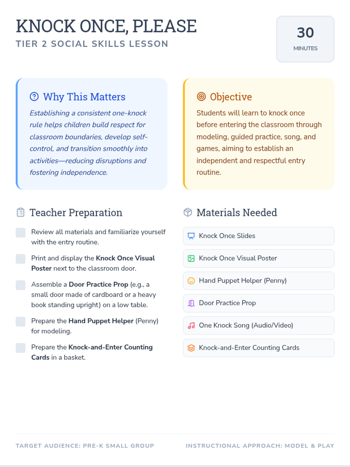 A 30-minute Tier 2 Pre-K lesson teaching students the 'knock once' entry routine to foster respect, self-control, and smooth transitions. Through modeling, song, and play, students internalize the three-step routine: knock, wait, and enter quietly.