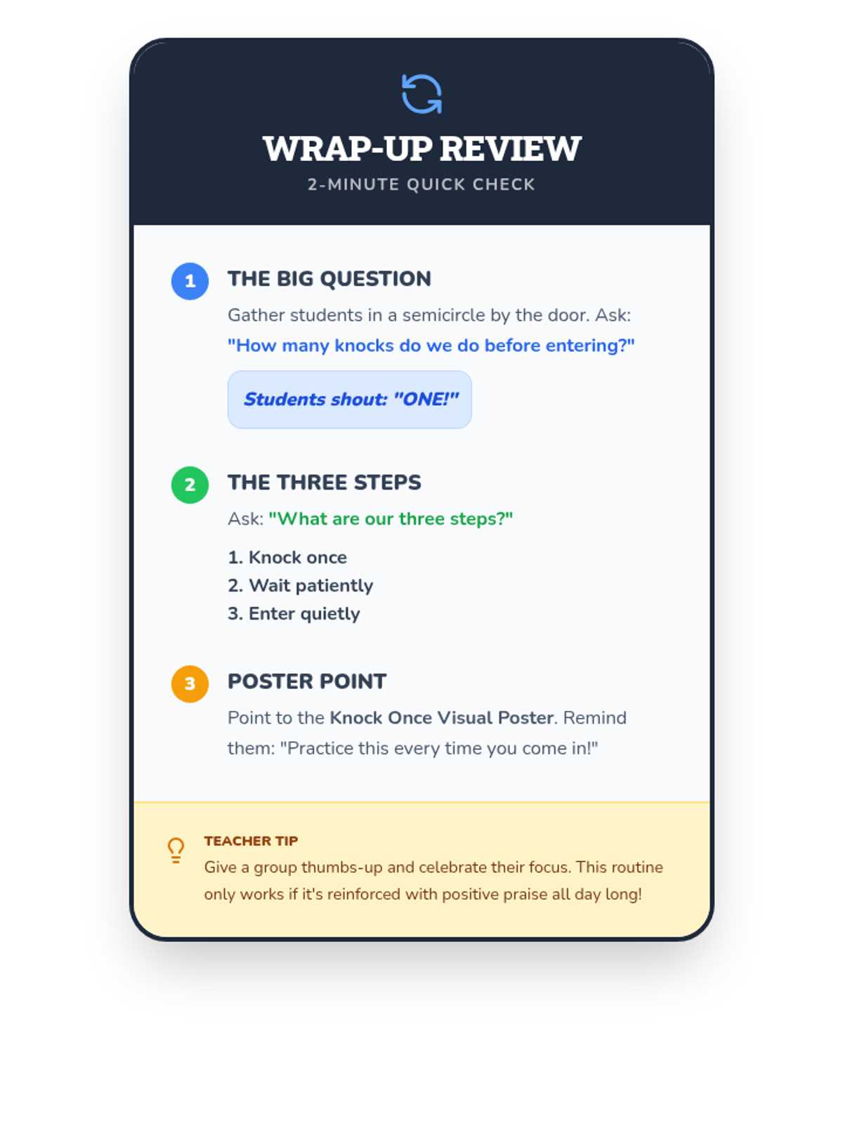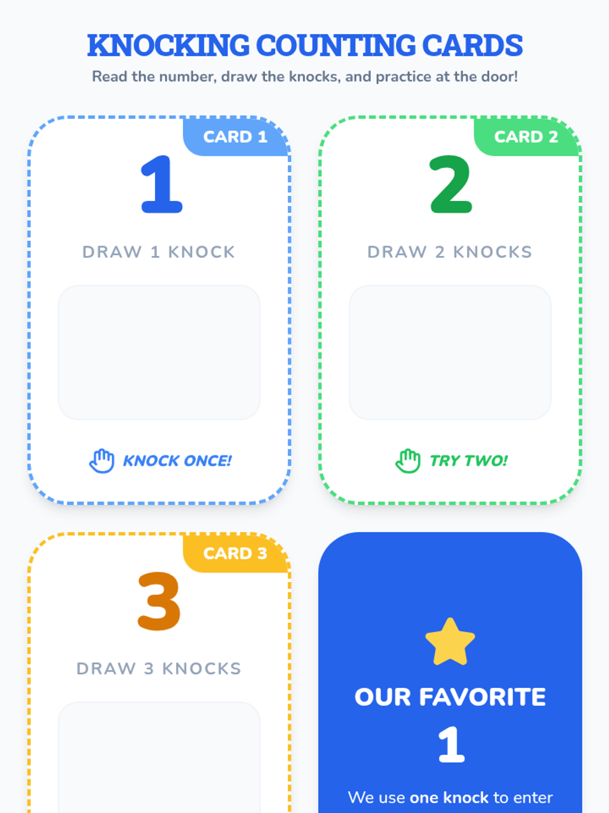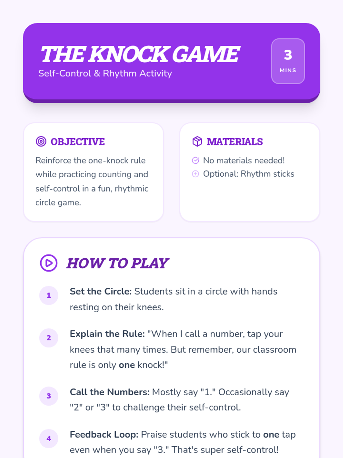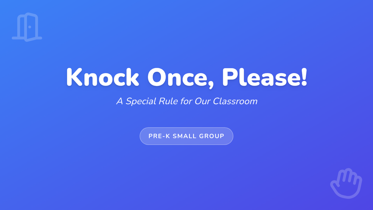 A 30-minute Tier 2 Pre-K lesson teaching students the 'knock once' entry routine to foster respect, self-control, and smooth transitions. Through modeling, song, and play, students internalize the three-step routine: knock, wait, and enter quietly.