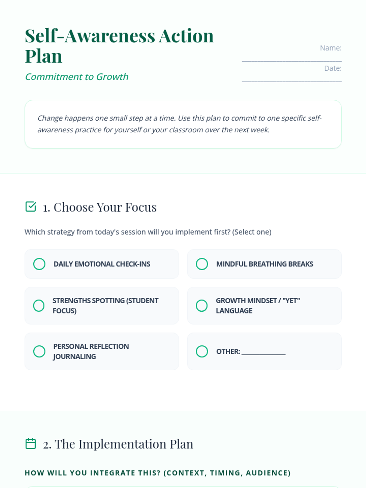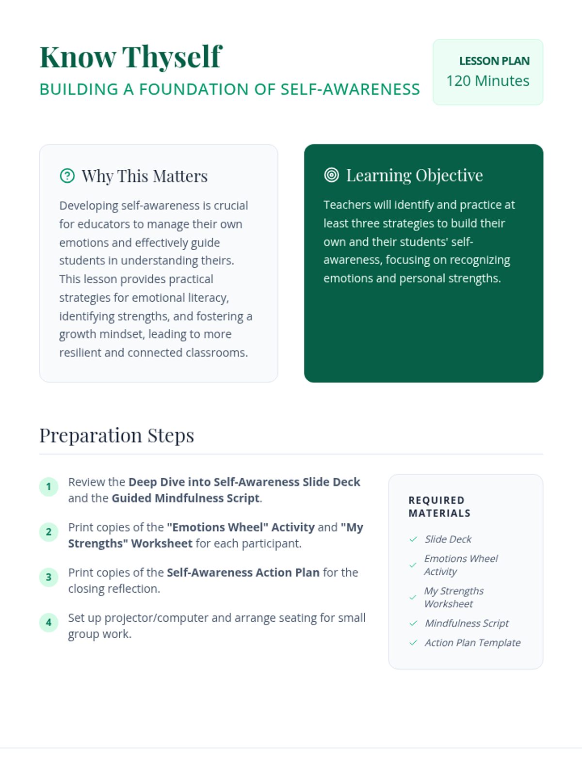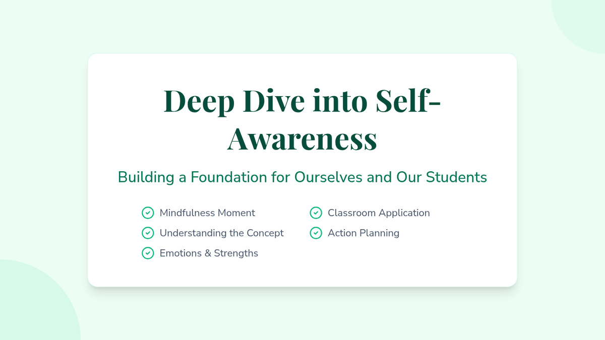 A 120-minute professional development session for teachers focused on cultivating self-awareness through emotional literacy, personal strengths, and mindfulness practices to improve classroom climate and resilience.
