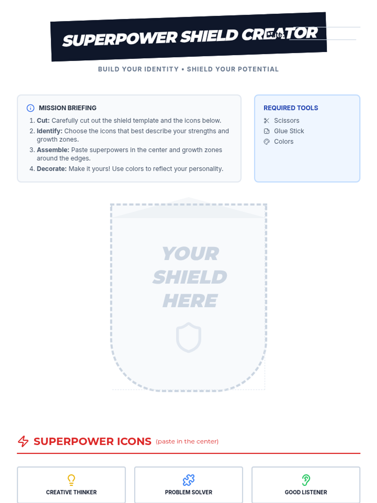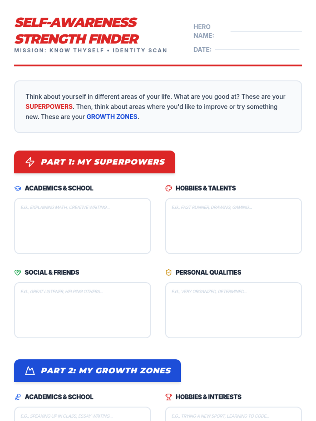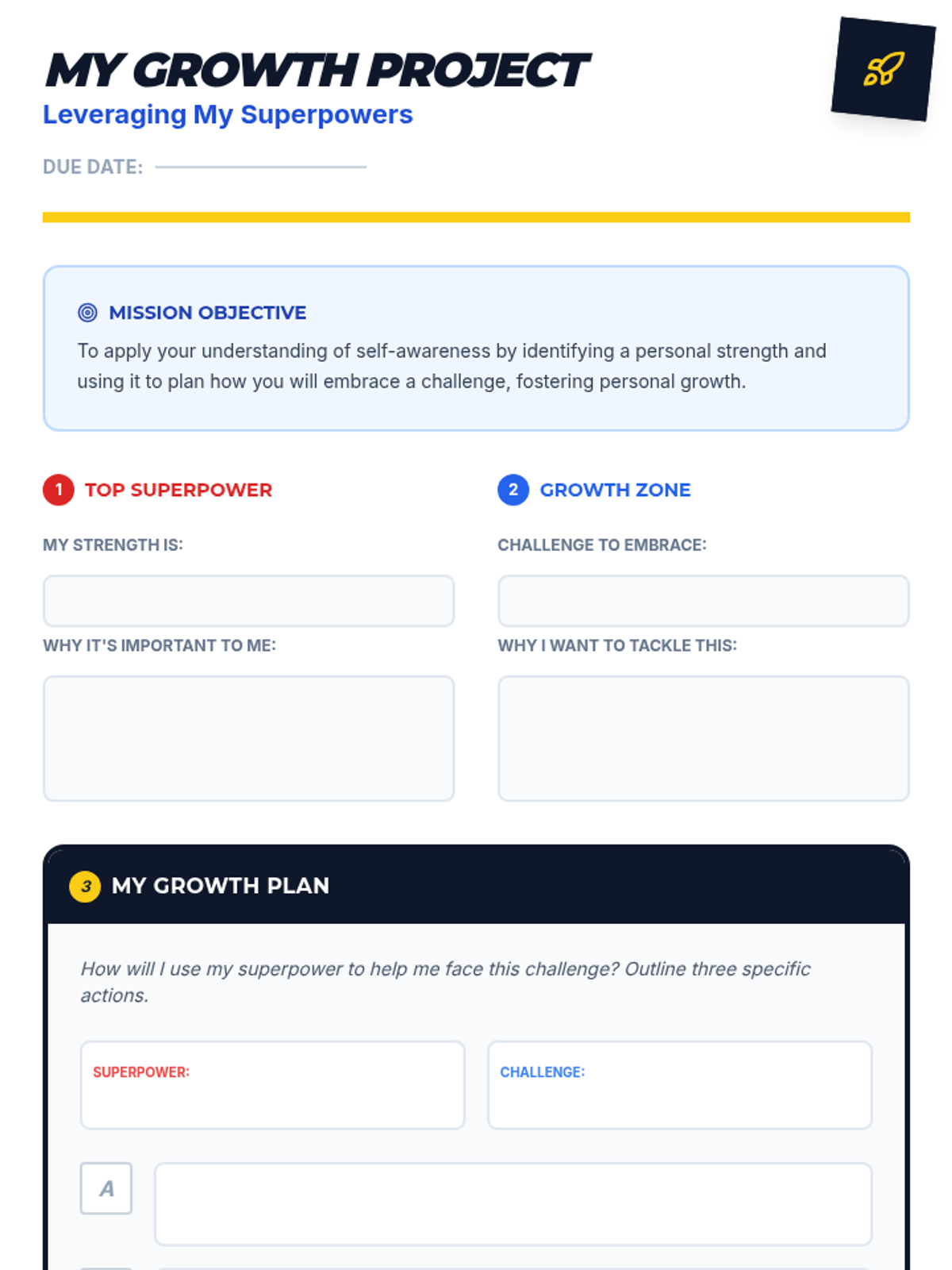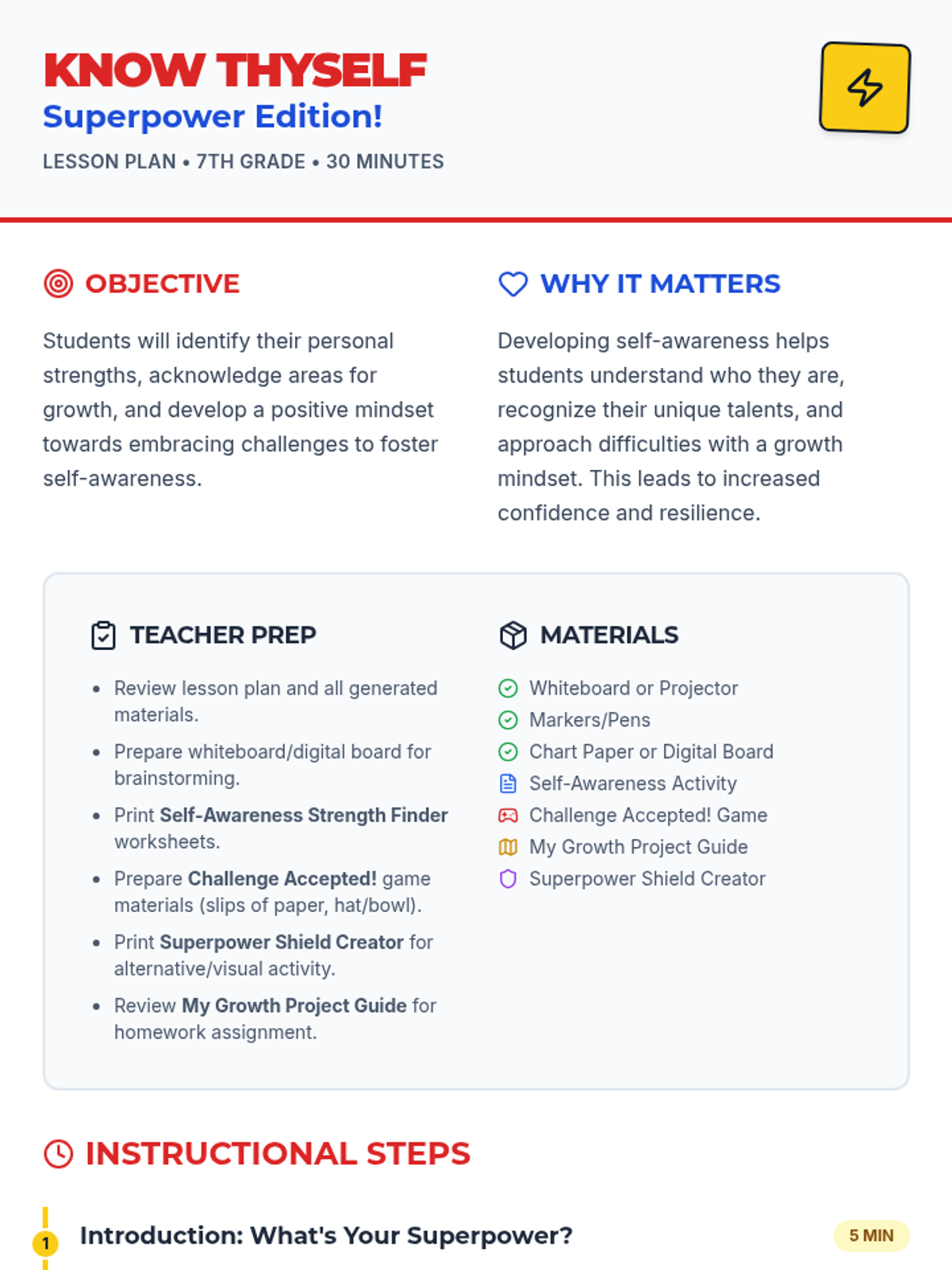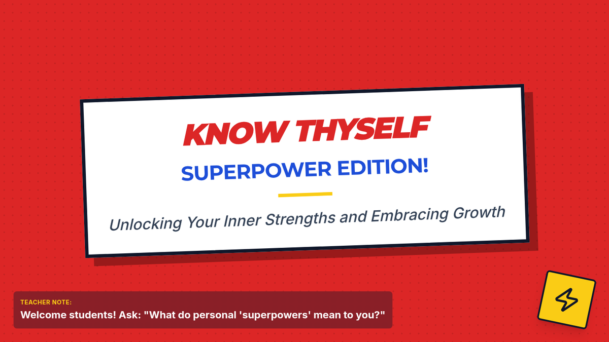 A 30-minute self-awareness lesson for 7th graders focusing on identifying personal strengths (superpowers) and embracing challenges (growth zones) through a superhero-themed lens.