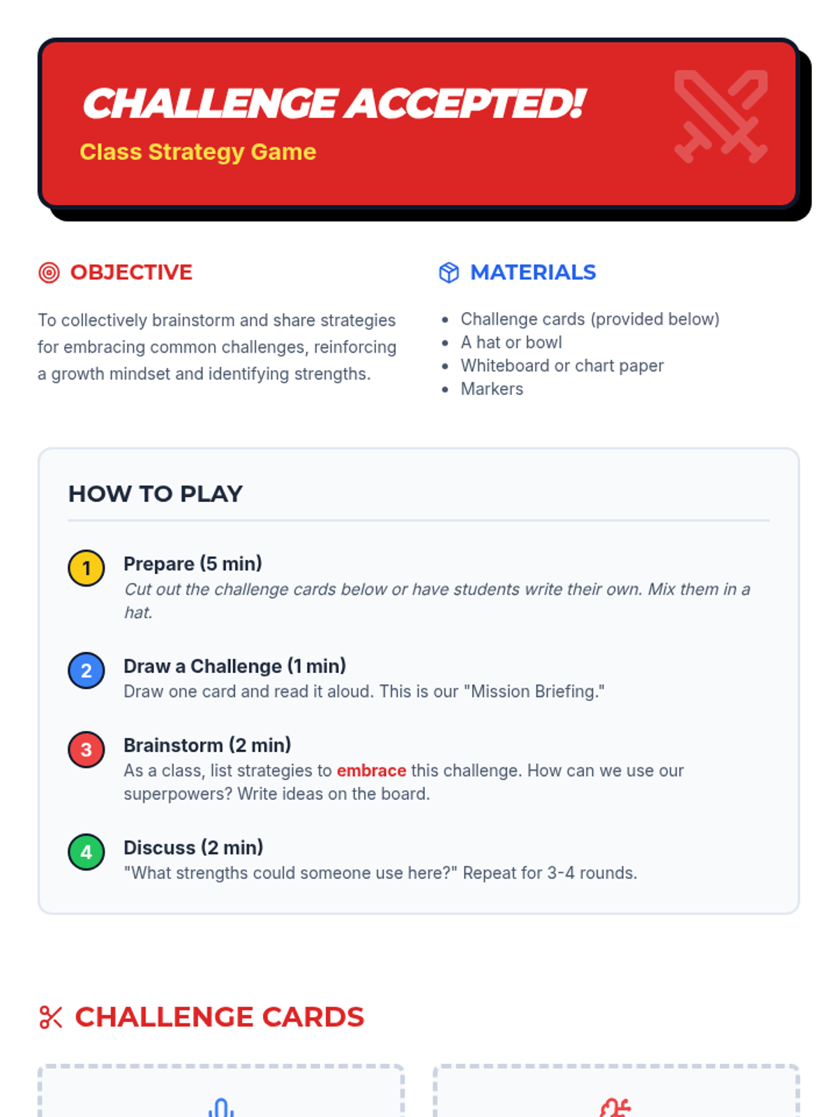 Practical team-based synergy challenges to apply collaborative problem-solving skills.