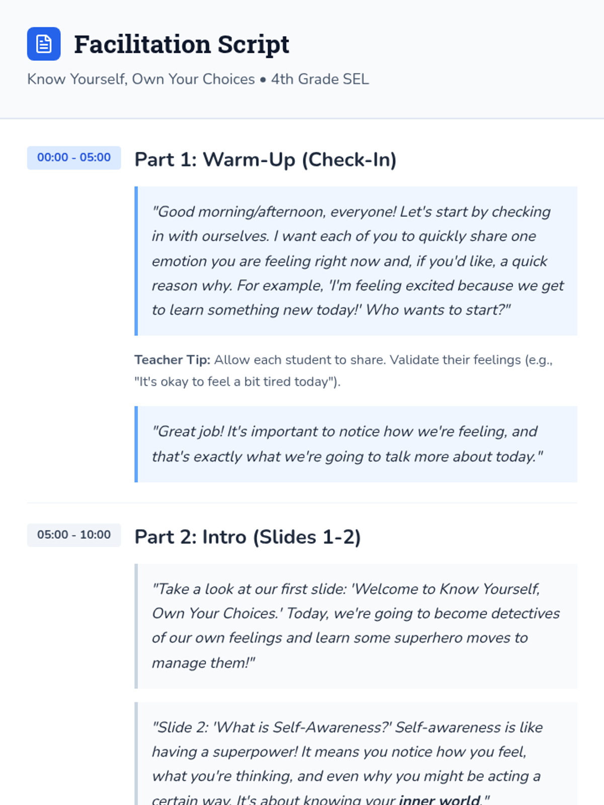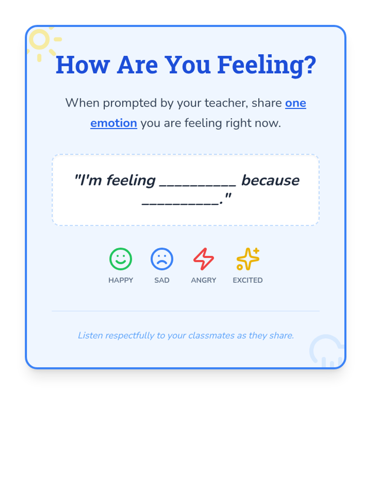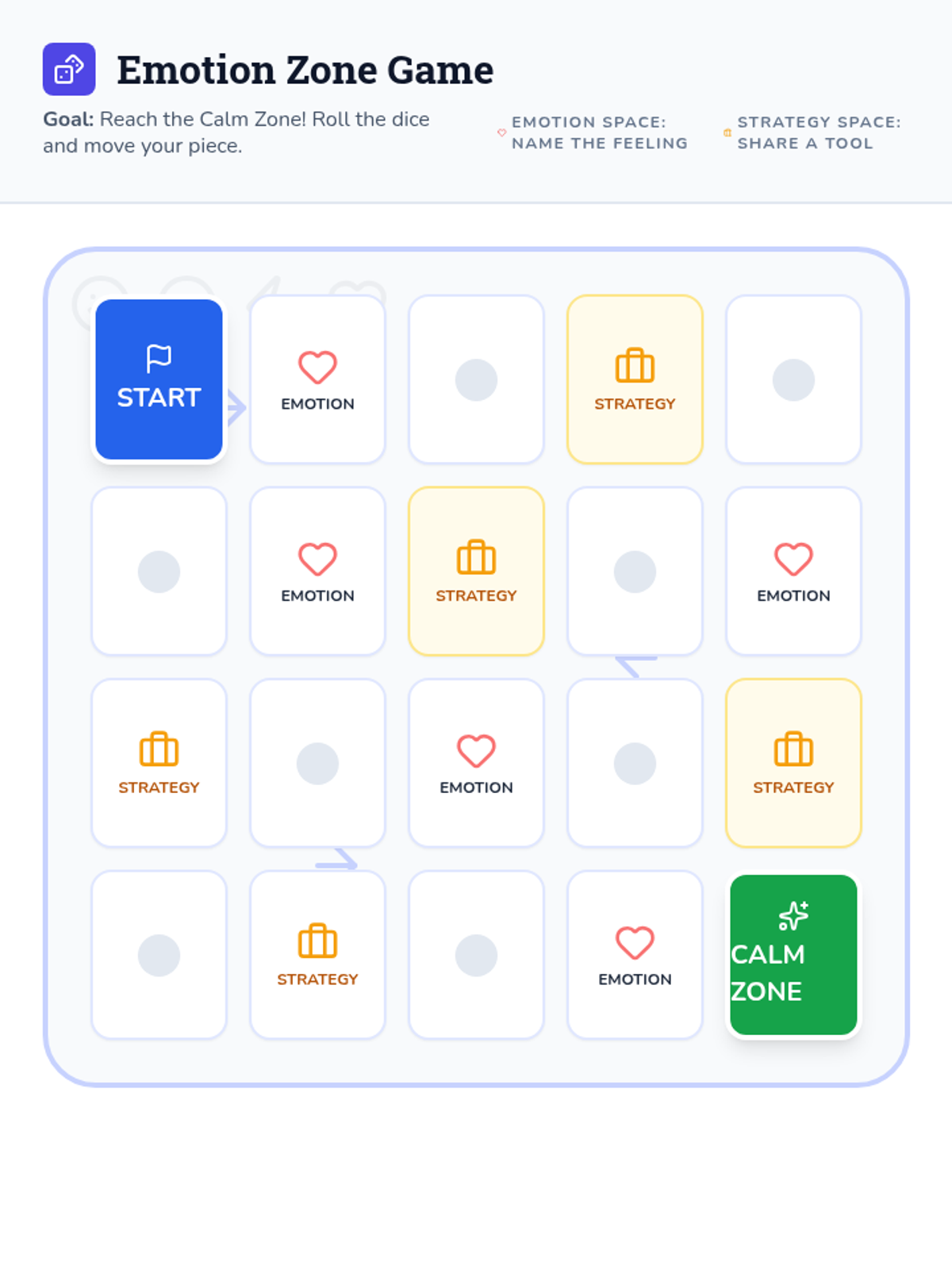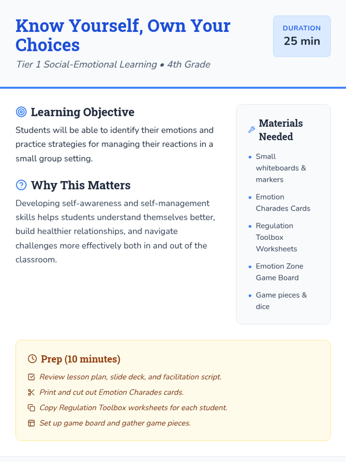 This 25-minute Tier 1 SEL lesson for 4th graders focuses on identifying emotions (self-awareness) and practicing regulation strategies (self-management) through interactive activities and games.
