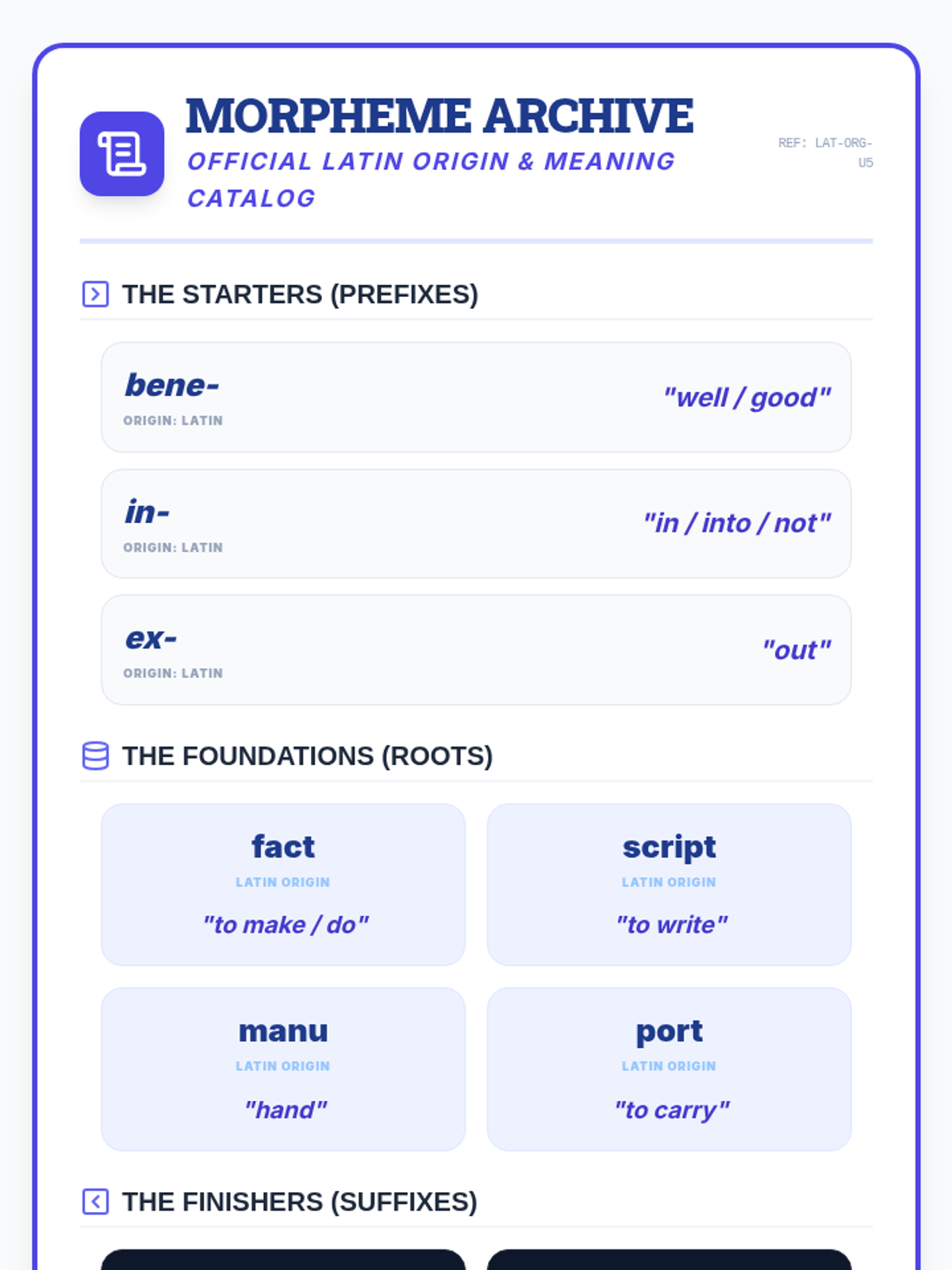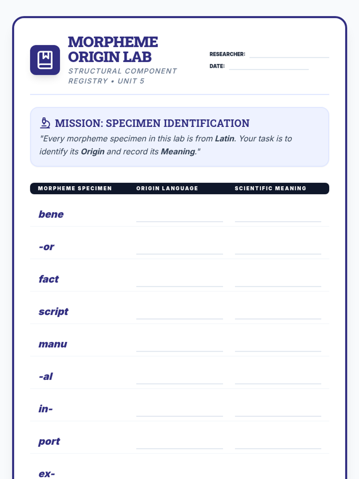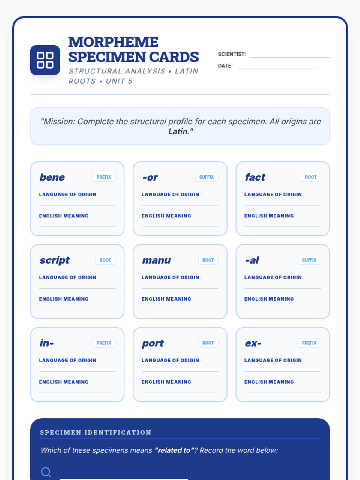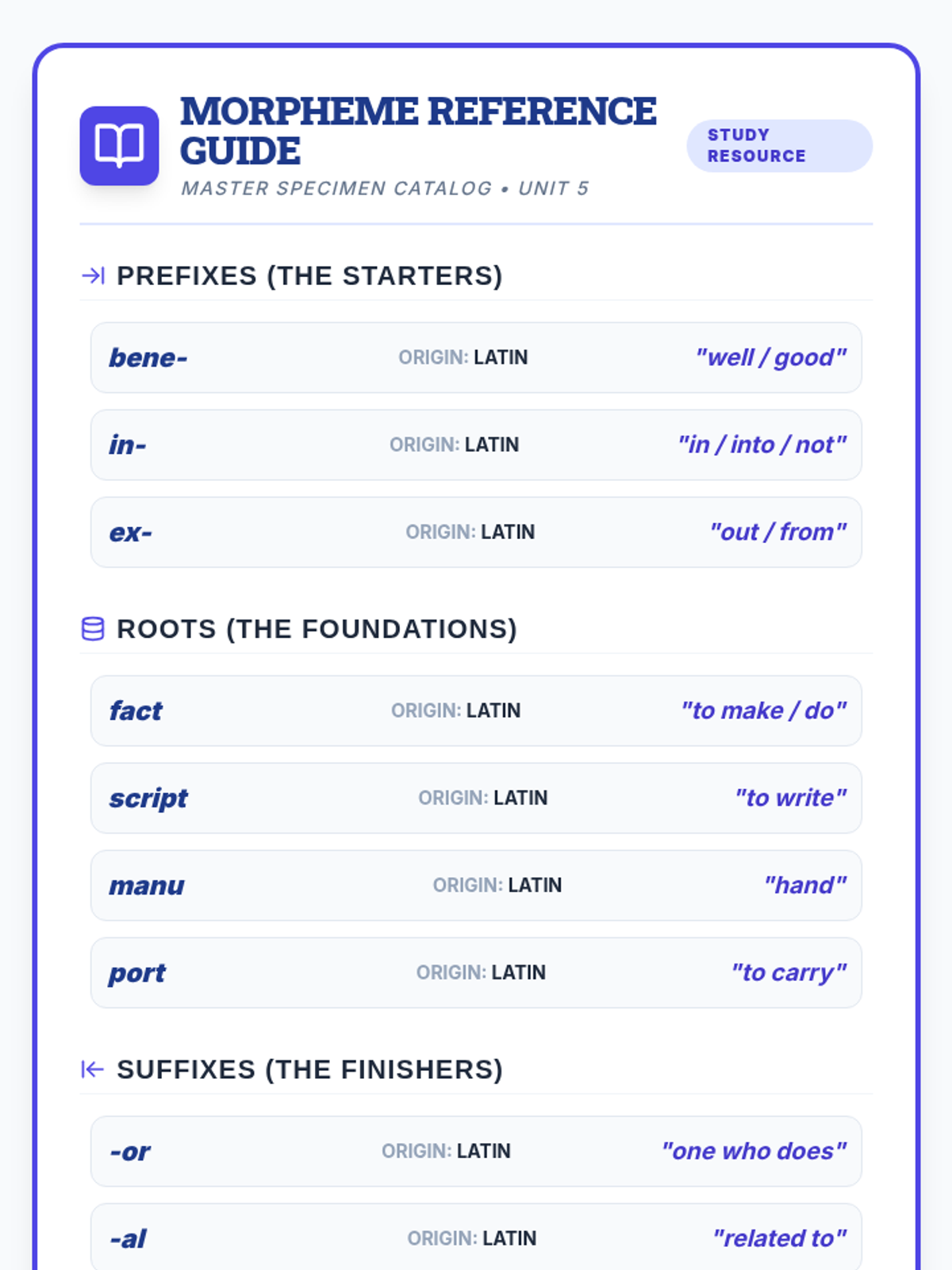 A lesson on analyzing and constructing words using Latin roots and affixes. Students investigate morphemes like bene, fact, script, manu, port, and common affixes to decode complex vocabulary and understand word origins.