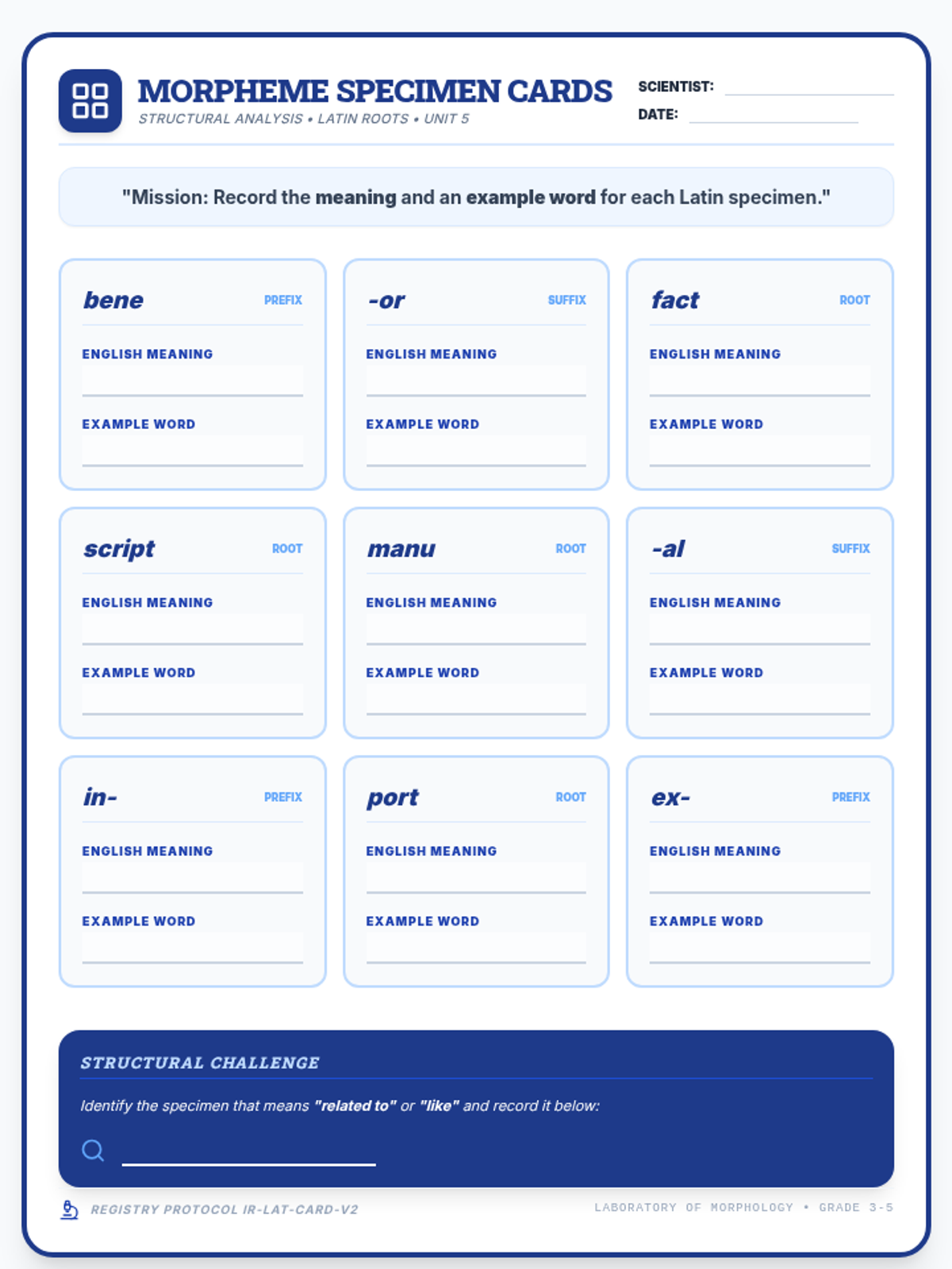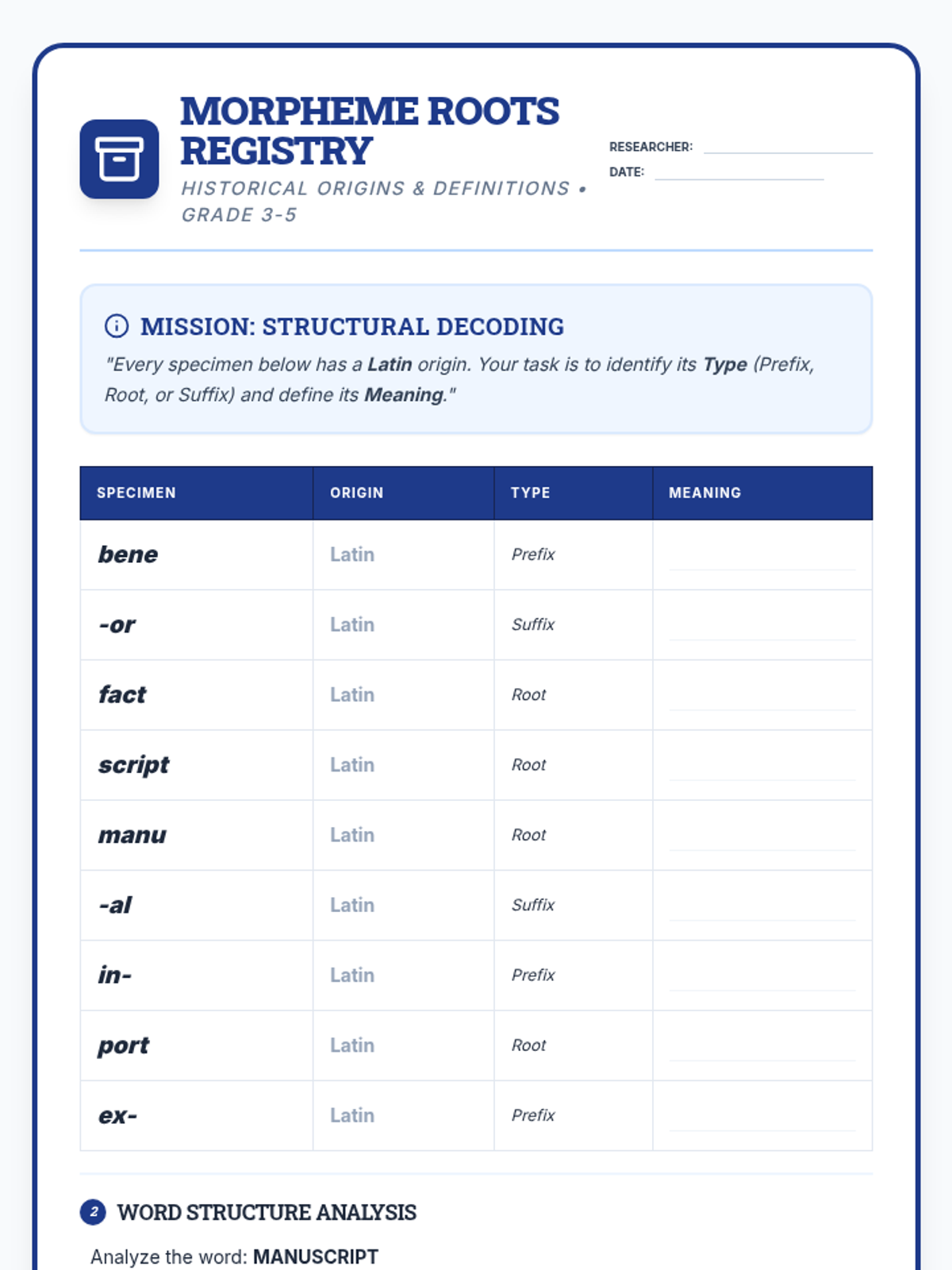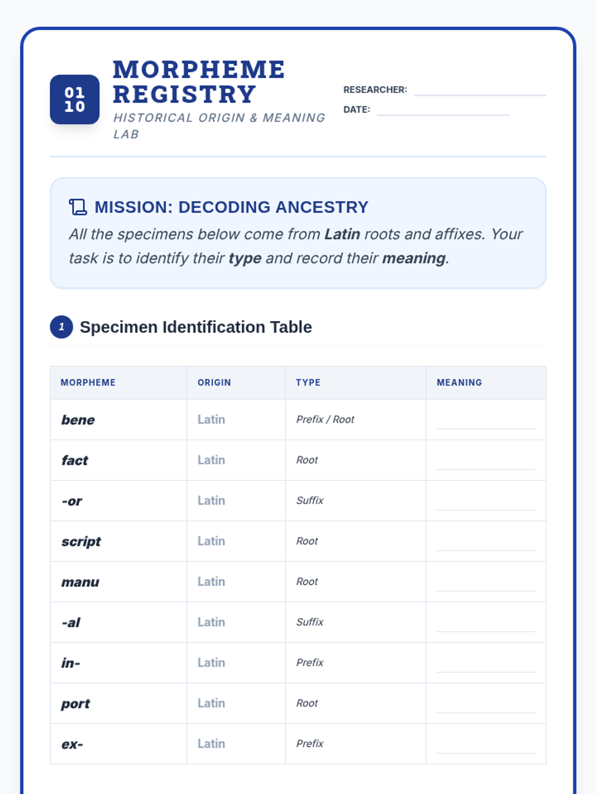 A lesson on analyzing and constructing words using Latin roots and affixes. Students investigate morphemes like bene, fact, script, manu, port, and common affixes to decode complex vocabulary and understand word origins.