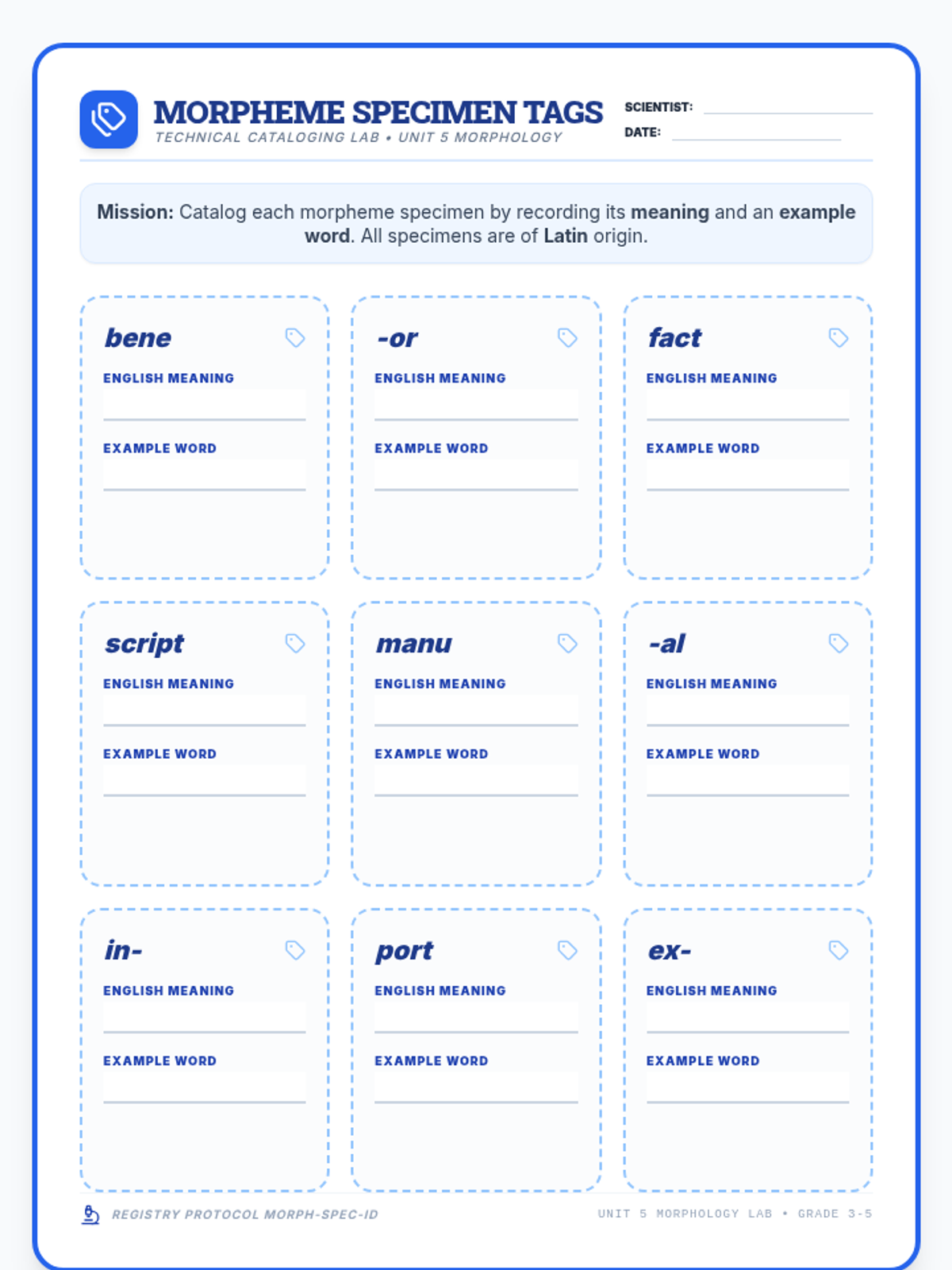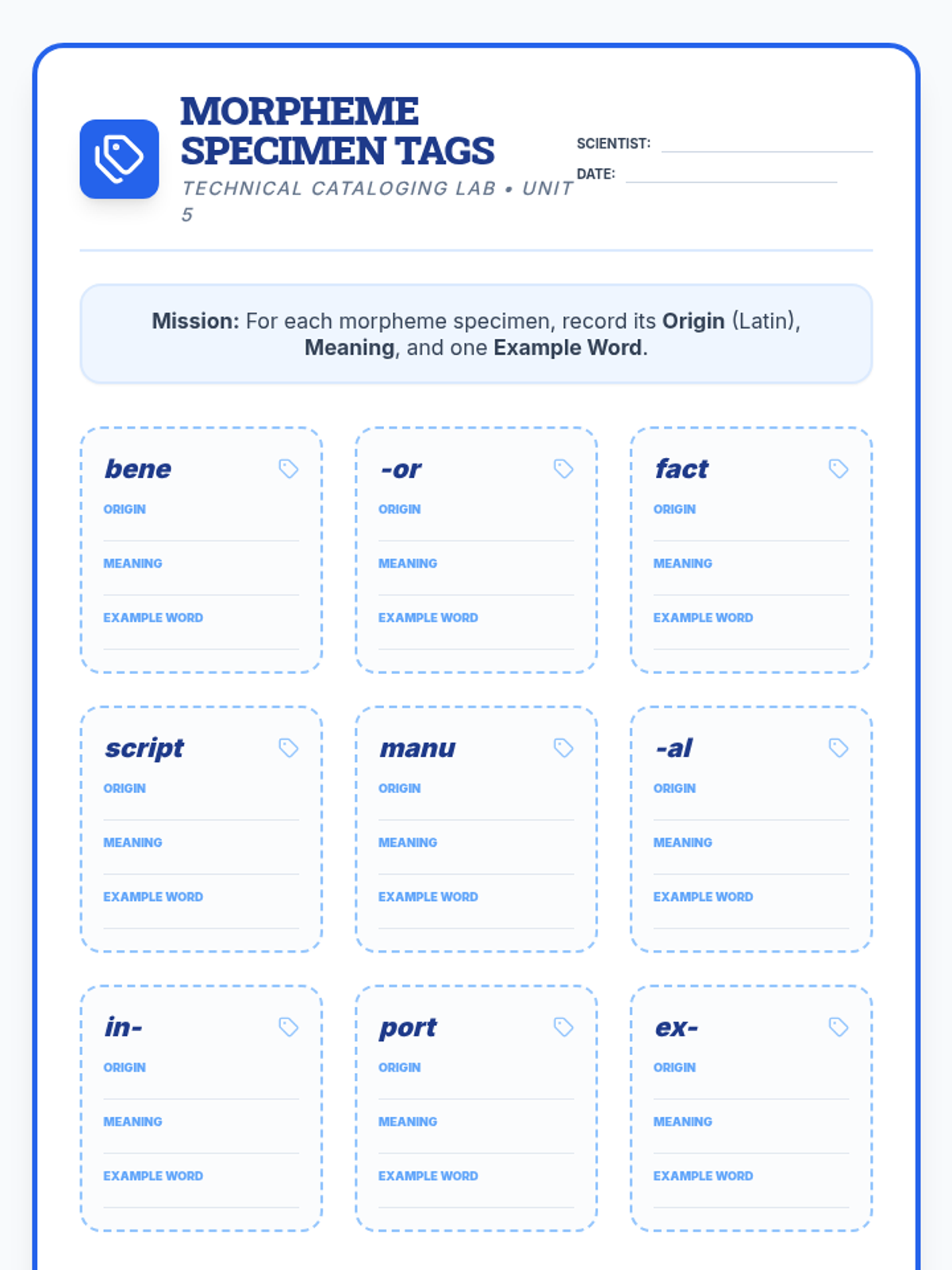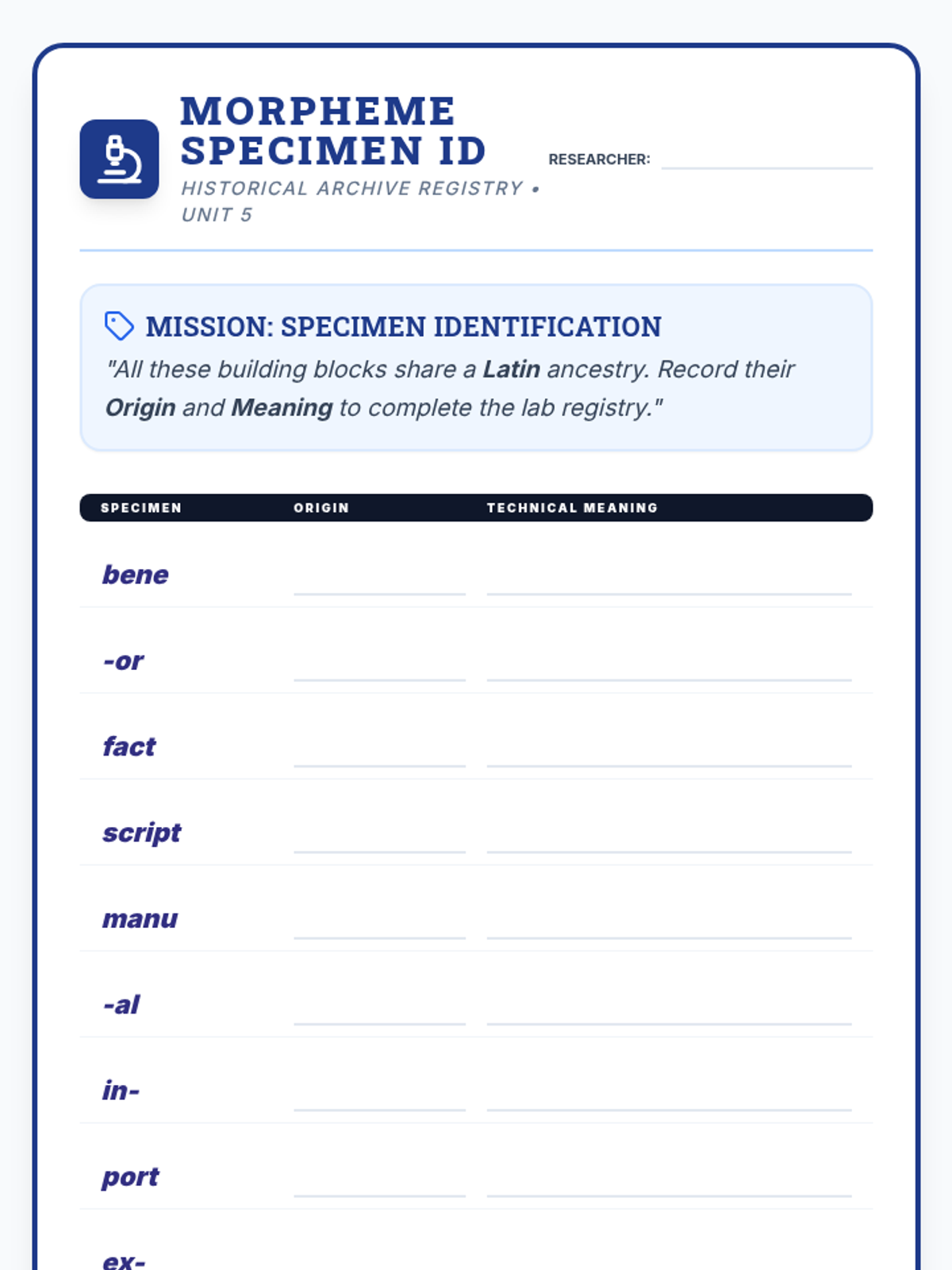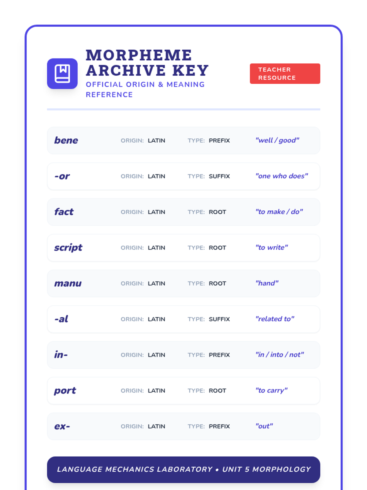 A lesson on analyzing and constructing words using Latin roots and affixes. Students investigate morphemes like bene, fact, script, manu, port, and common affixes to decode complex vocabulary and understand word origins.