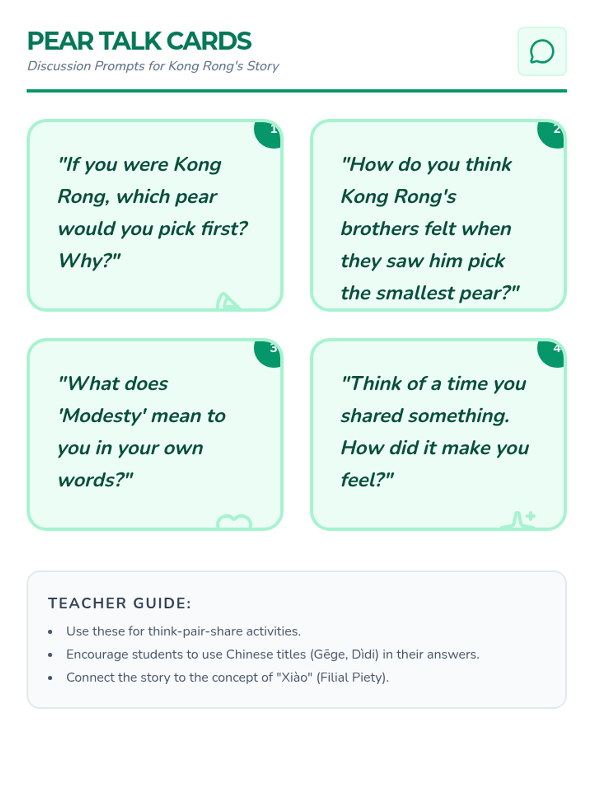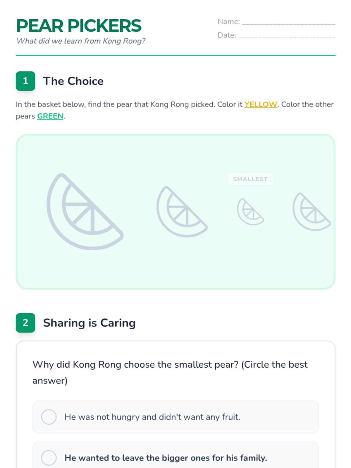 Students listen to the classic story of Kong Rong, a child who chose the smallest pear so his elders could have the bigger ones. They discuss modesty, sharing, and respect for older family members.
