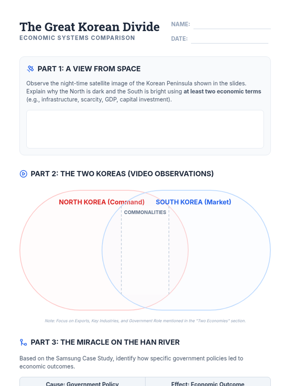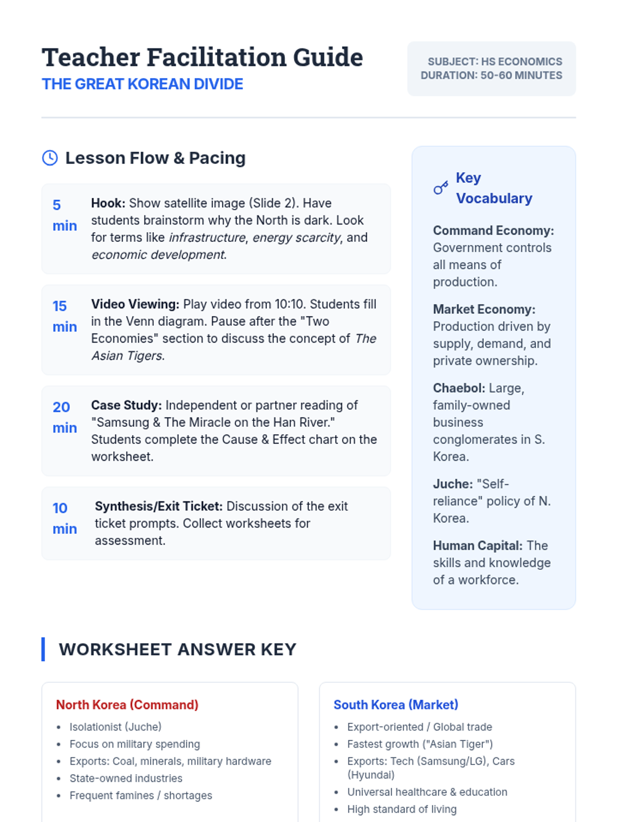 This lesson compares command and market economies through a comparative study of North and South Korea. Students analyze geographic and economic data, watch a detailed documentary segment, and explore the 'Miracle on the Han River' through a case study of South Korea's industrial growth.