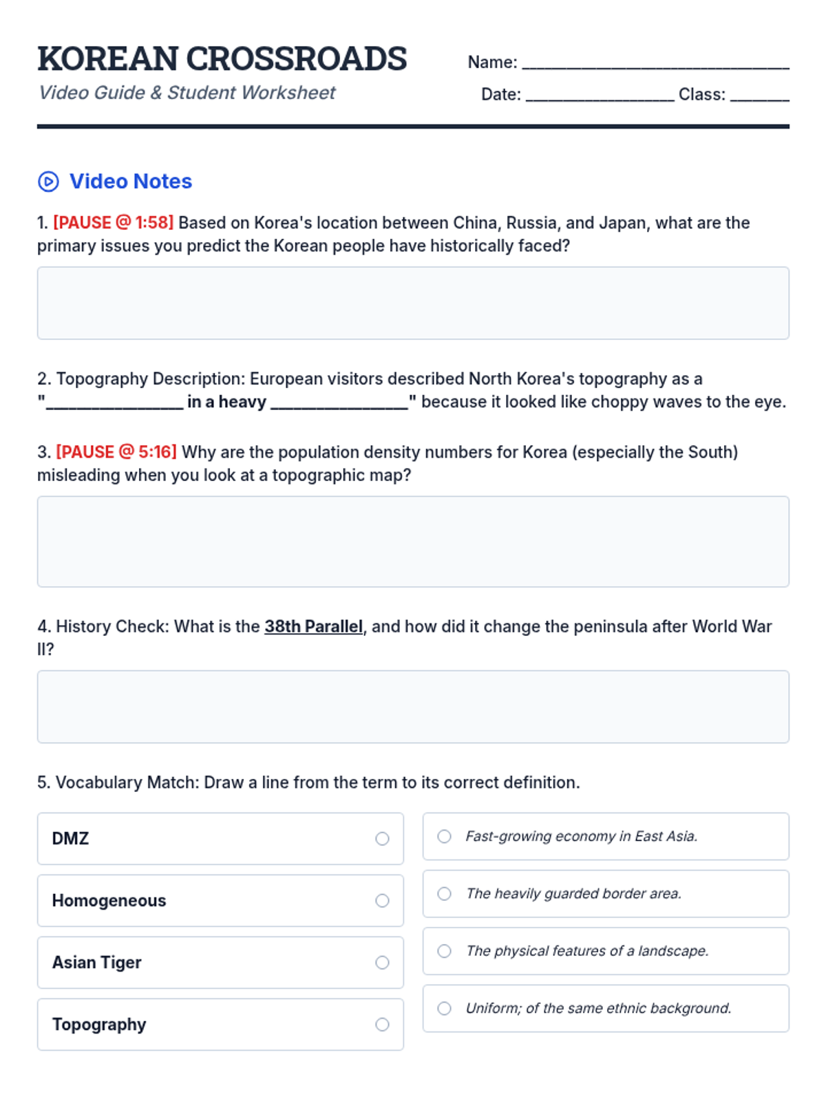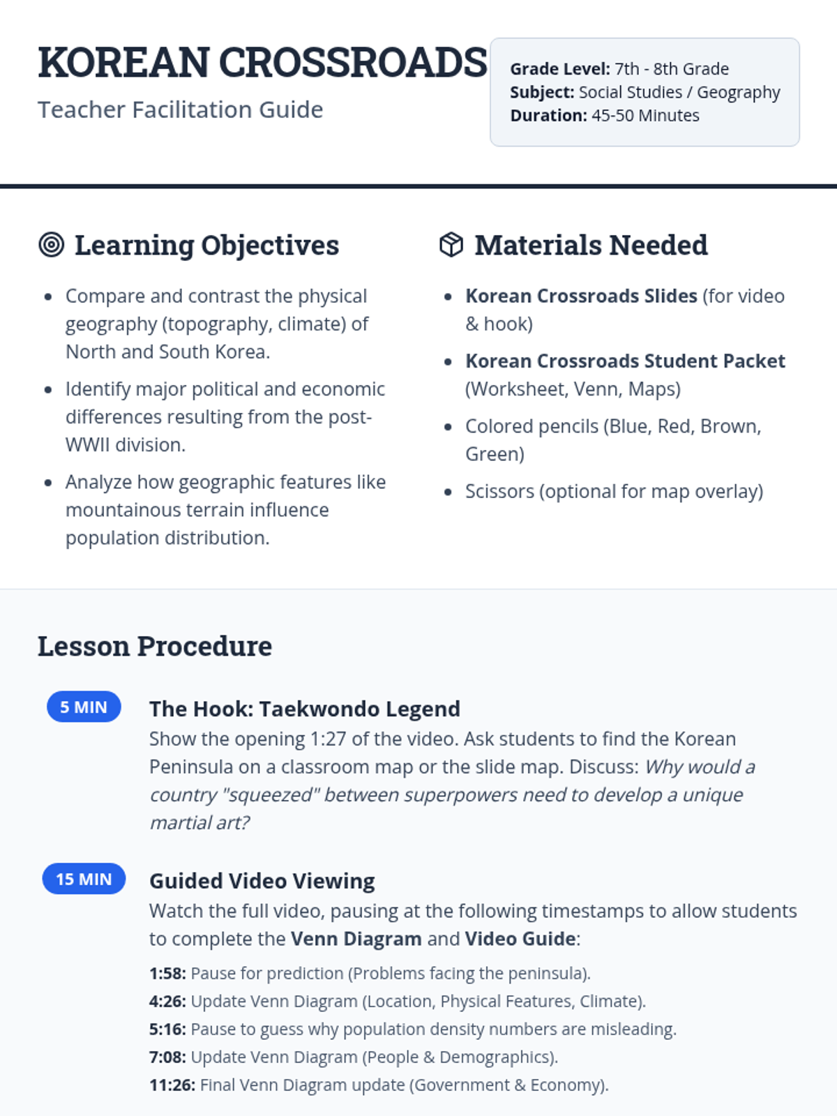 A middle school social studies lesson comparing the physical and political geography of North and South Korea through a video-guided analysis and a map-based creative activity.