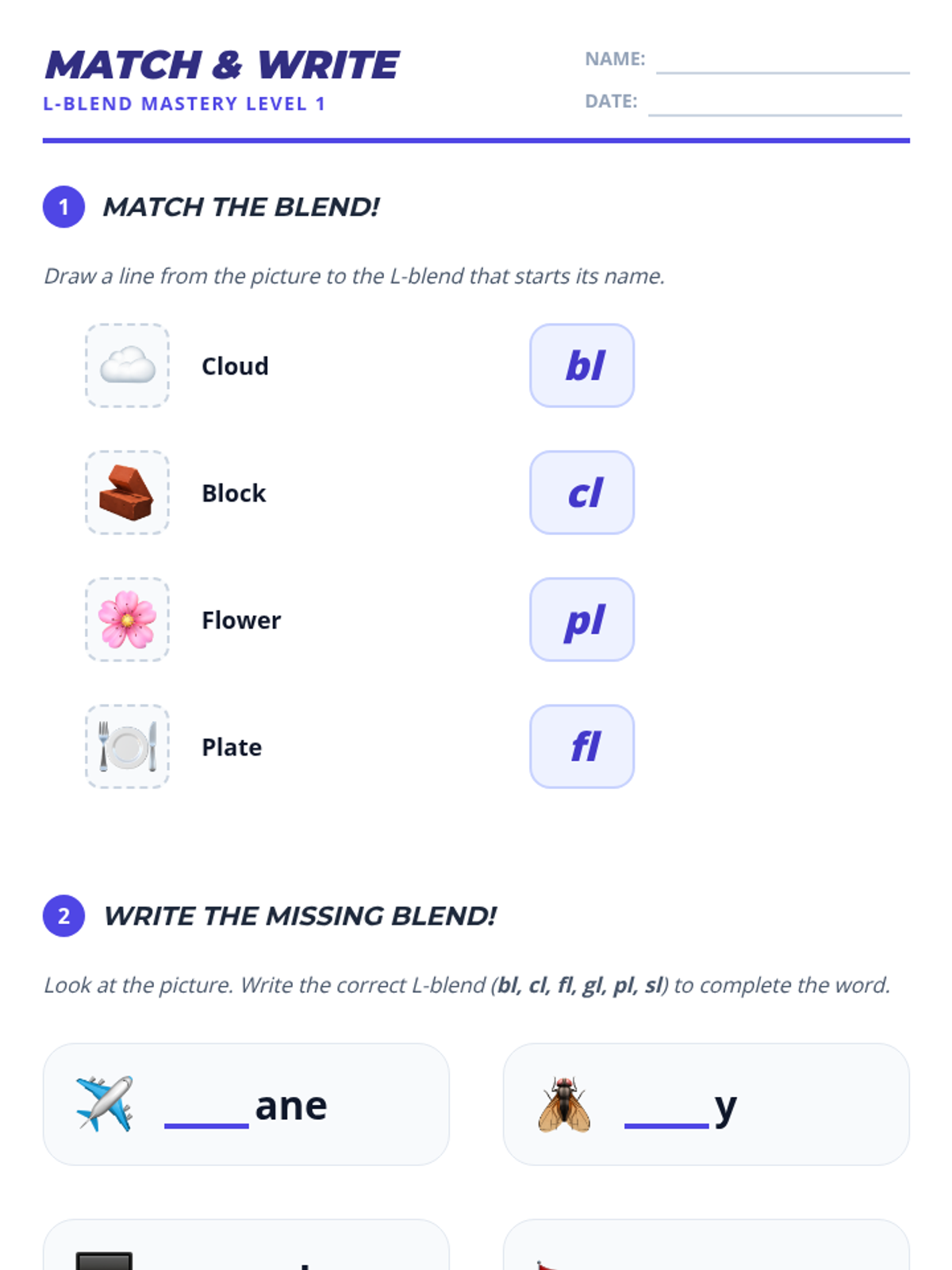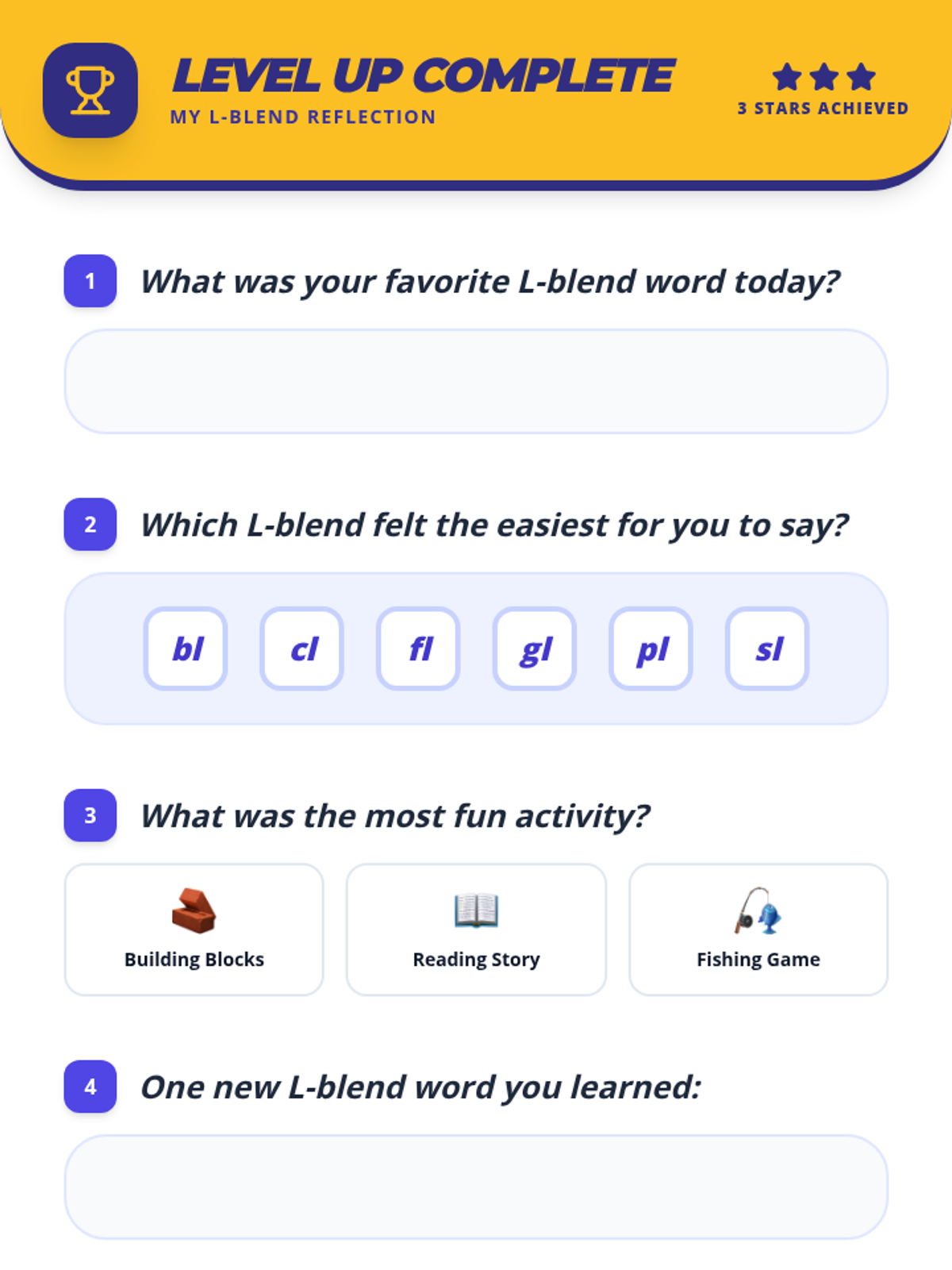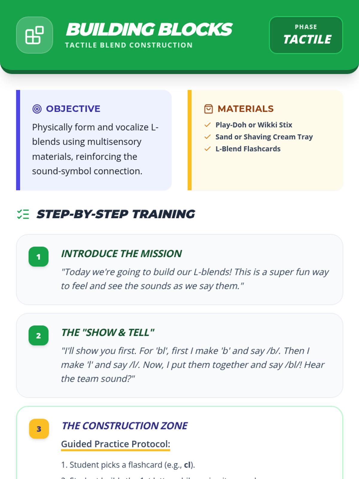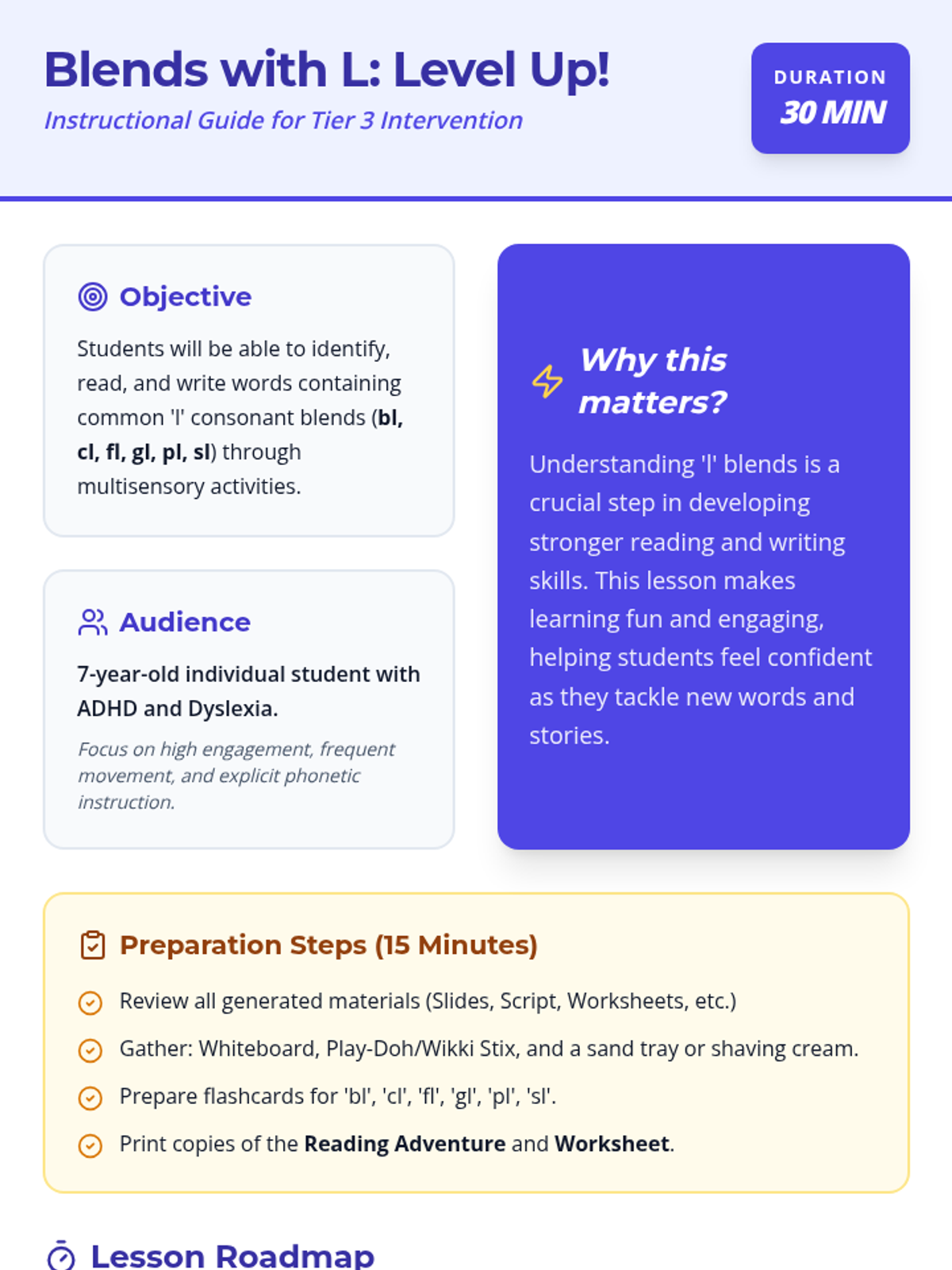 A 30-minute, multisensory lesson designed for a 7-year-old student with ADHD and dyslexia to master consonant 'l' blends using interactive 'Level Up' themed activities.