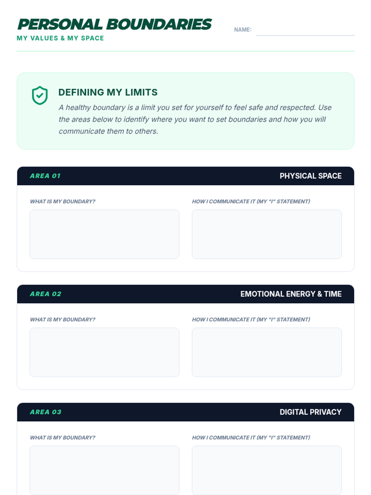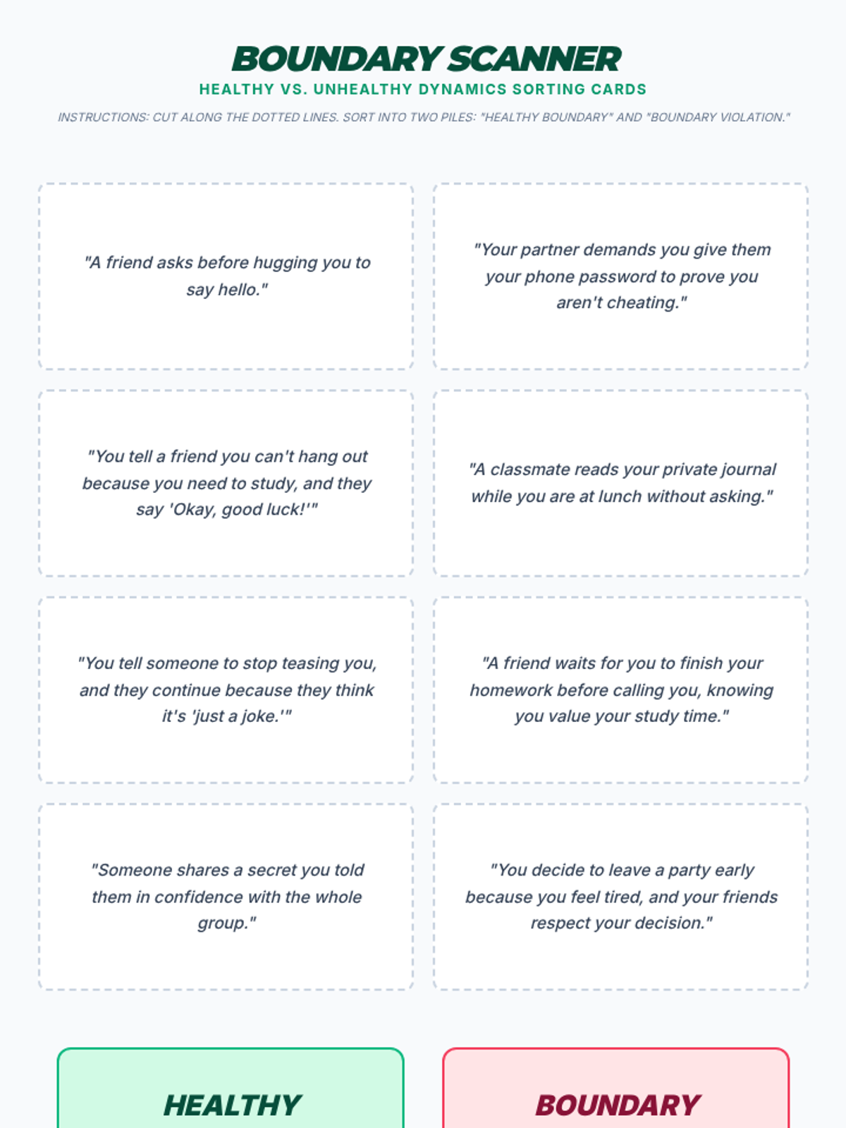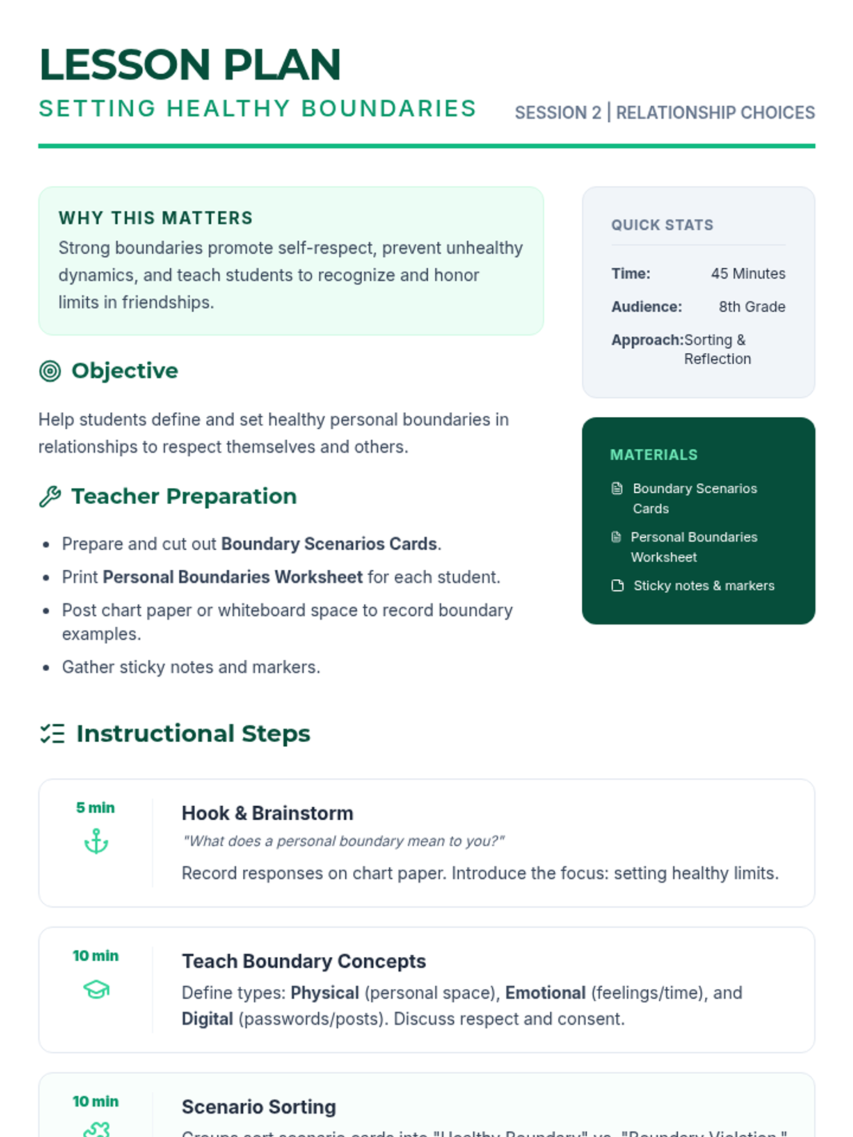 Students learn to define and communicate personal physical, emotional, and digital boundaries to maintain self-respect and healthy dynamics.
