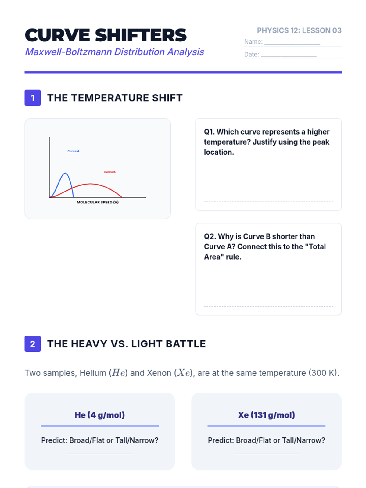 Analysis of probability distribution graphs to understand temperature as an average energy, exploring how curves shift with temperature and mass.