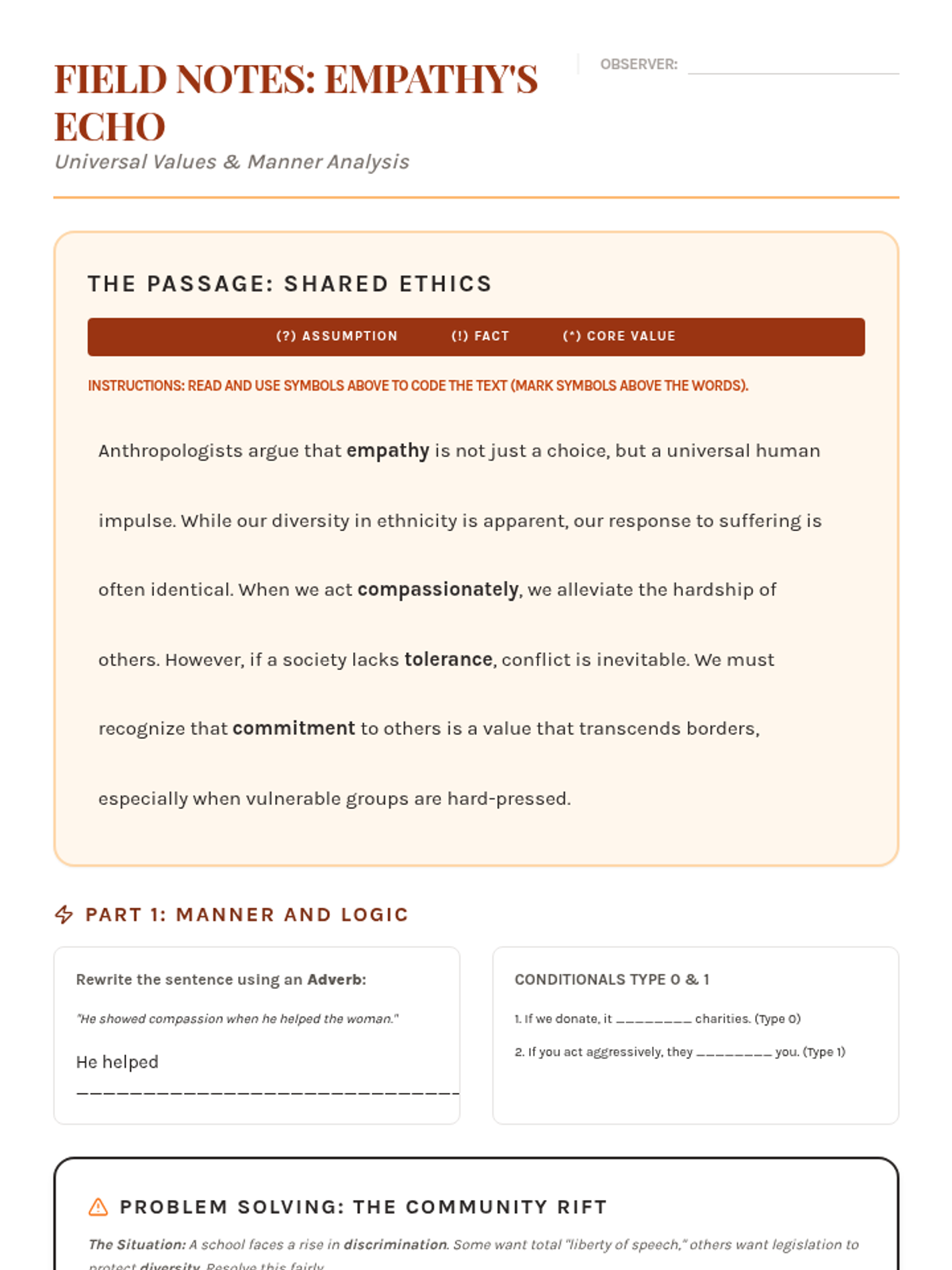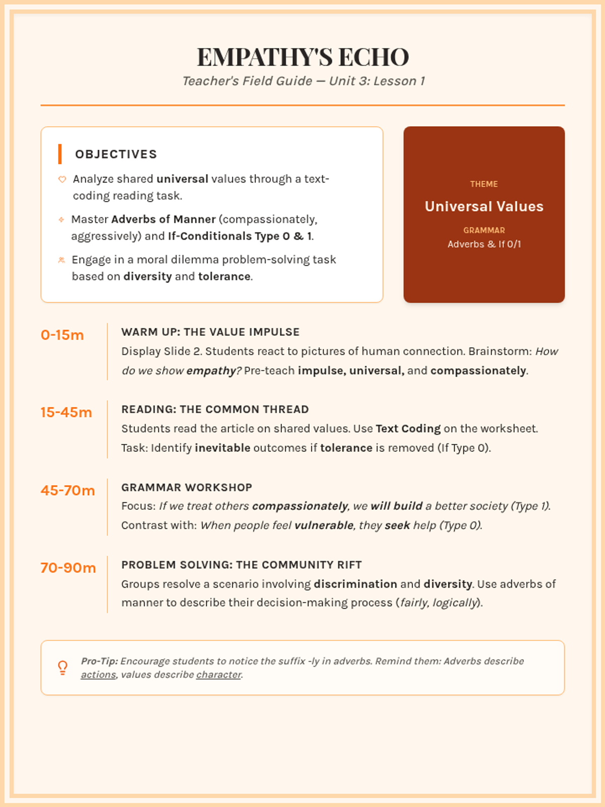 An analysis of universal human values and empathy. Students explore shared ethics, master adverbs of manner, and use If-conditionals (Type 0 & 1) to discuss inevitable outcomes and plans.