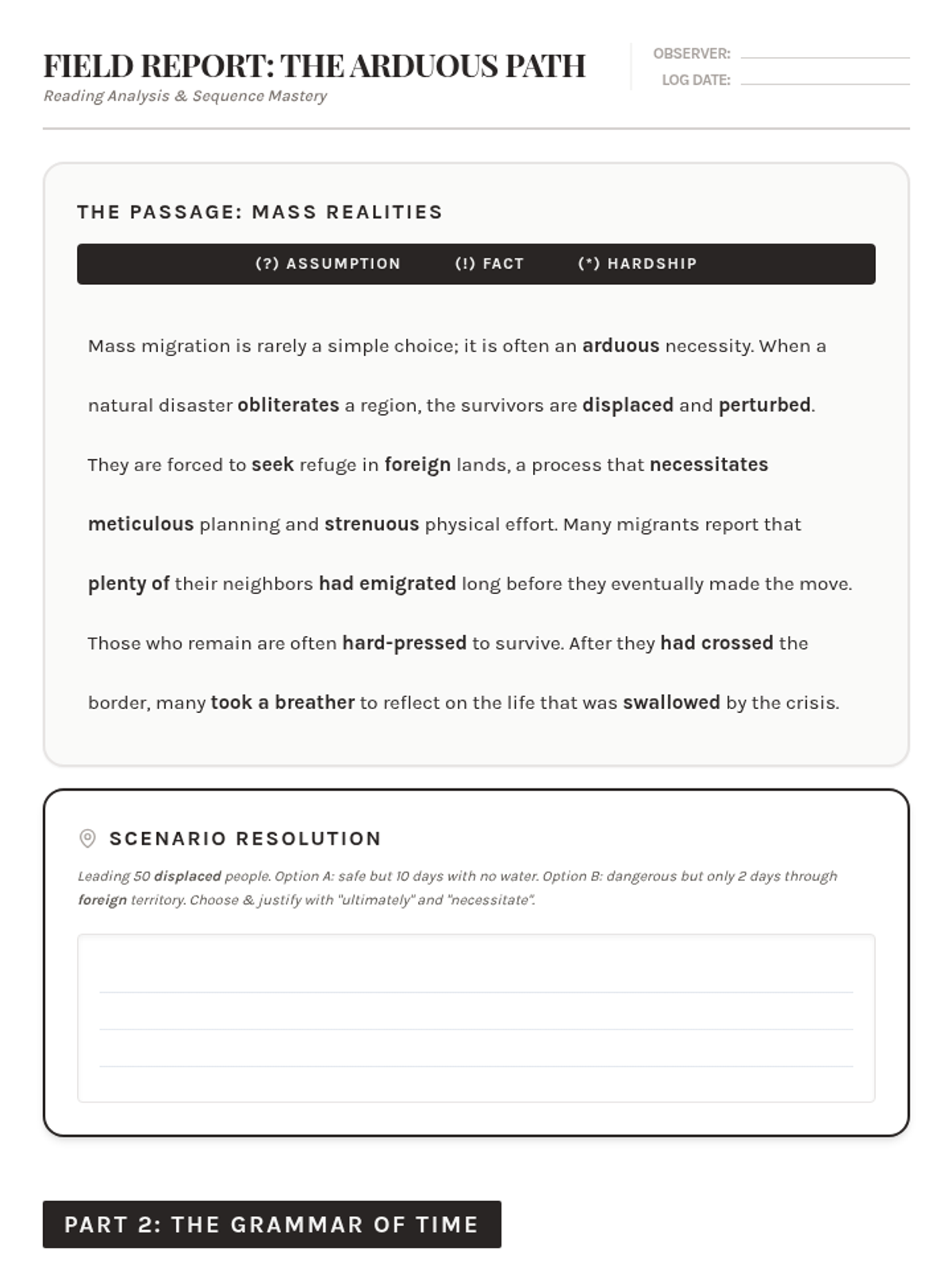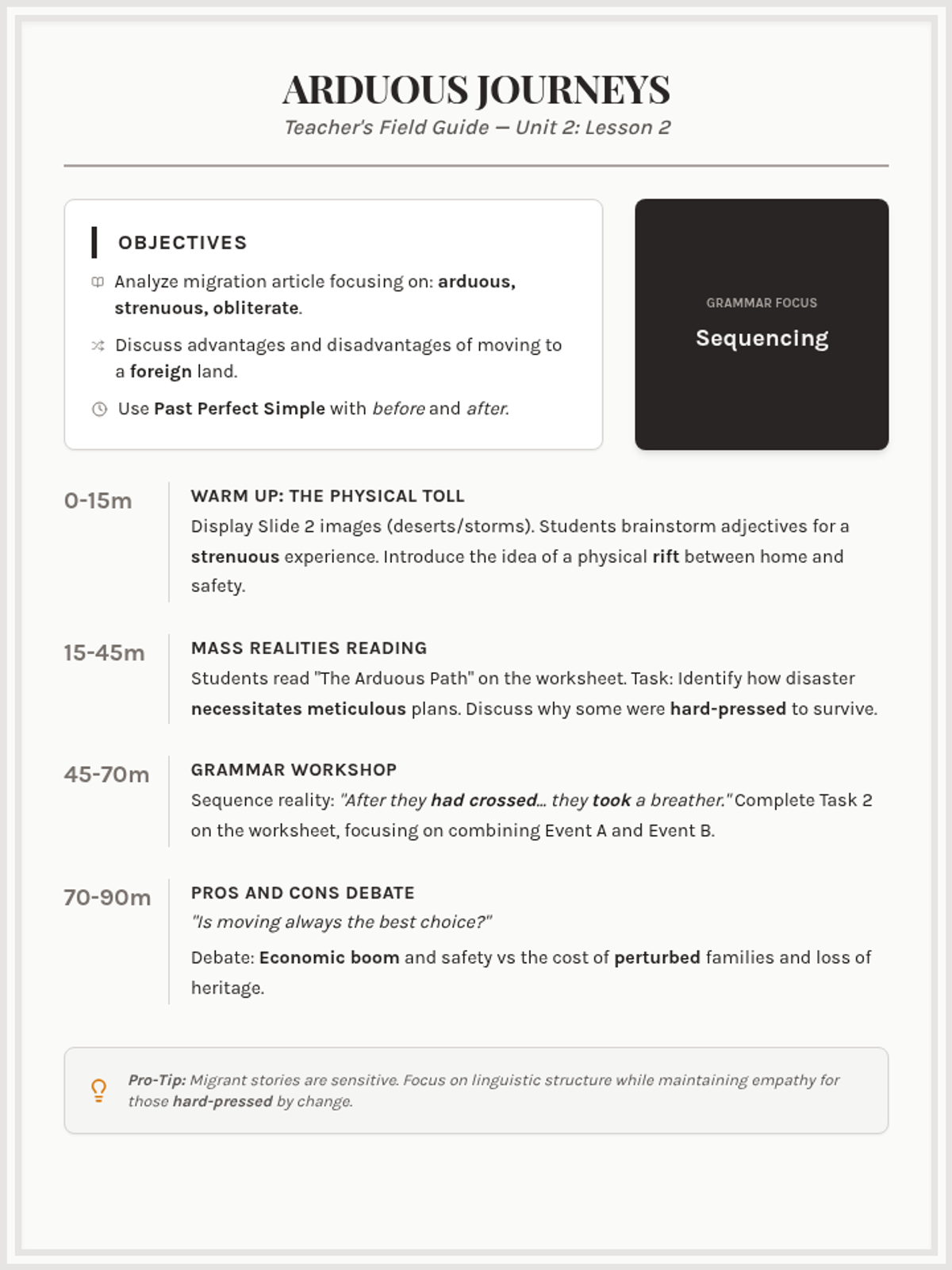 A deep dive into the challenges and triumphs of the migrant experience. Students analyze an article on mass migration, master the past perfect with 'before' and 'after', and discuss the advantages and disadvantages of moving to a foreign land.