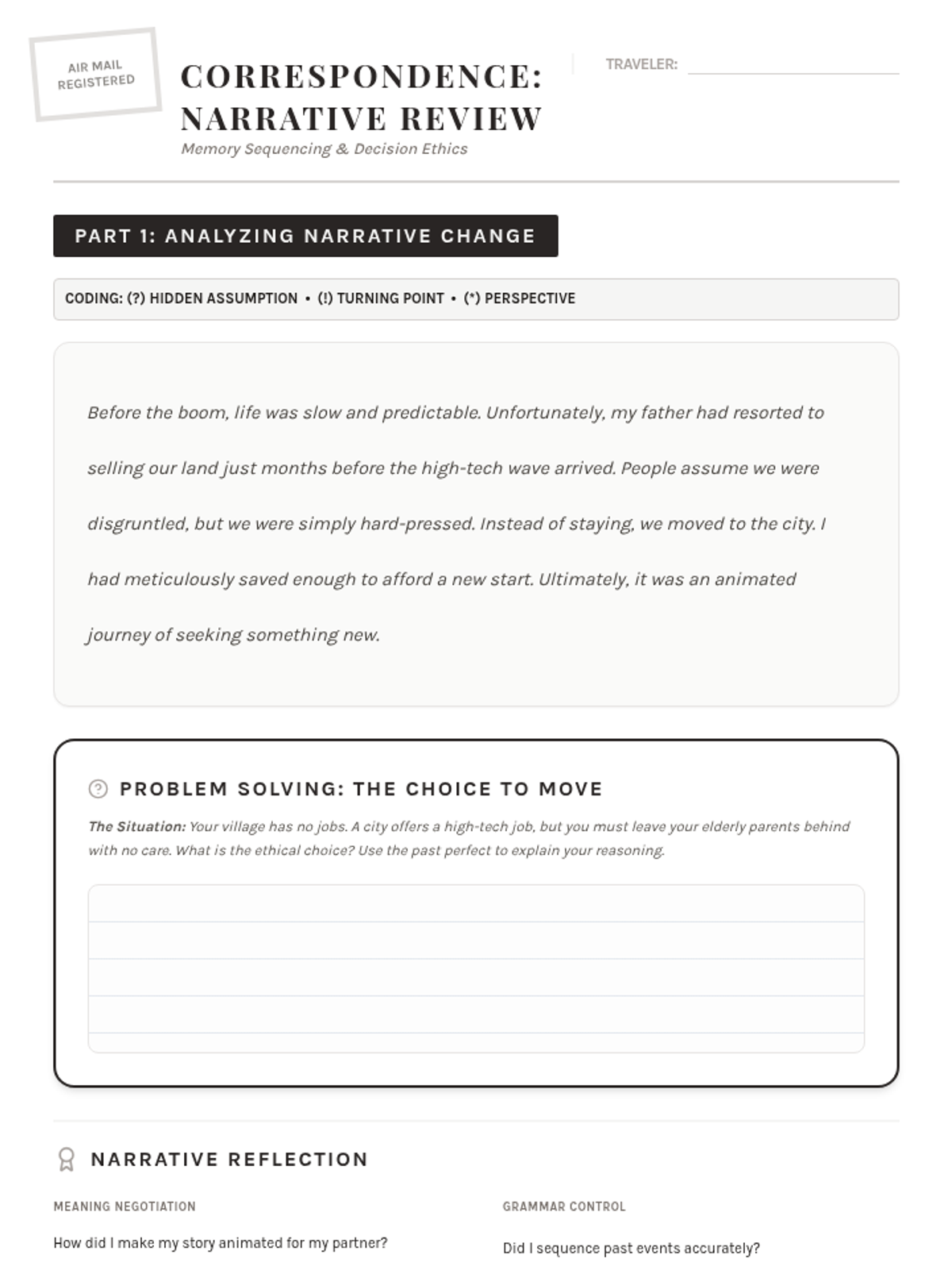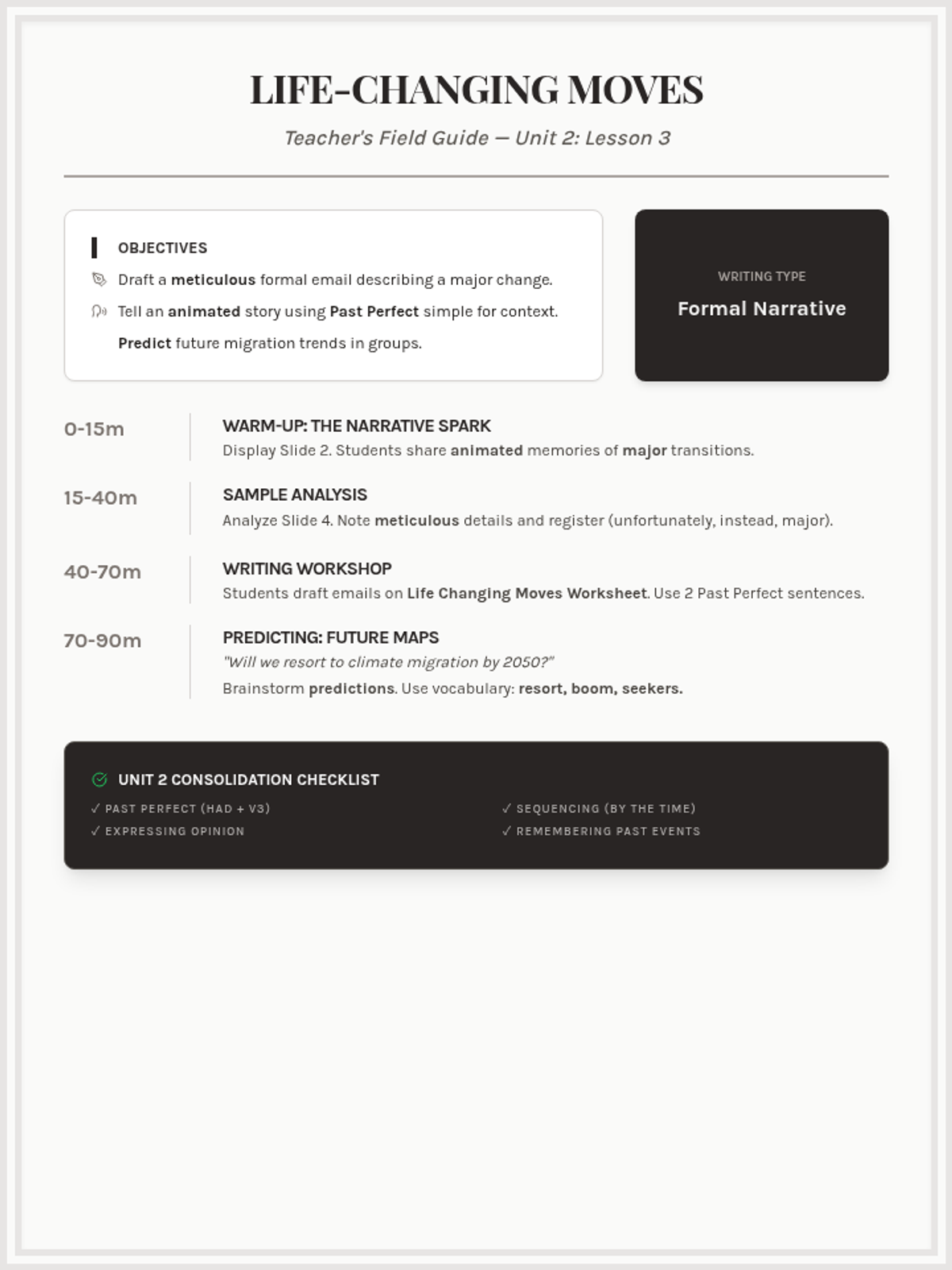 A focus on personal narratives and future predictions. Students share life-changing events, practice meticulous writing in a formal email, and use past perfect to sequence memories effectively.
